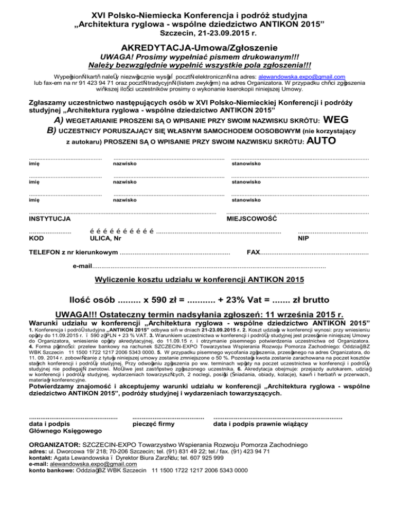 XVI Polsko-Niemiecka Konferencja i podróż studyjna „Architektura ryglowa - wspólne dziedzictwo ANTIKON 2015” Szczecin, 21-23.09.2015 r. AKREDYTACJA-Umowa/Zgłoszenie UWAGA! Prosimy wypełniać pismem drukowanym!!! Należy bezwzględnie wypełnić wszystkie pola zgłoszenia!!! Wypełnioną kartę należy niezwłocznie wysłać pocztą elektroniczną na adres: [email protected] lub fax-em na nr 91 423 94 71 oraz pocztą tradycyjną (listem zwykłym) na adres Organizatora. W przypadku chęci zgłoszenia większej ilości uczestników prosimy o wykonanie kserokopii niniejszej Umowy. Zgłaszamy uczestnictwo następujących osób w XVI Polsko-Niemieckiej Konferencji i podróży studyjnej „Architektura ryglowa - wspólne dziedzictwo ANTIKON 2015” A) WEGETARIANIE PROSZENI SĄ O WPISANIE PRZY SWOIM NAZWISKU SKRÓTU: WEG B) UCZESTNICY PORUSZAJĄCY SIĘ WŁASNYM SAMOCHODEM OOSOBOWYM (nie korzystający z autokaru) PROSZENI SĄ O WPISANIE PRZY SWOIM NAZWISKU SKRÓTU: AUTO ............................................ ................................................................... ................................................................................... imię nazwisko stanowisko ............................................ ................................................................... ................................................................................... imię nazwisko stanowisko ............................................ ................................................................... ................................................................................... imię nazwisko stanowisko ................................................................................................................. ...................................................................................... INSTYTUCJA MIEJSCOWOŚĆ ....................... KOD ………………………….................................................................... ULICA, Nr TELEFON z nr kierunkowym ............................................................ ...................................... NIP FAX........................................................... e-mail............................................................................................................................... Wyliczenie kosztu udziału w konferencji ANTIKON 2015 Ilość osób ......... x 590 zł = ........... + 23% Vat = ....... zł brutto UWAGA!!! Ostateczny termin nadsyłania zgłoszeń: 11 września 2015 r. Warunki udziału w konferencji „Architektura ryglowa - wspólne dziedzictwo ANTIKON 2015” 1. Konferencja i podróż studyjna „ANTIKON 2015” odbywa się w dniach 21-23.09.2015 r. 2. Koszt udziału w konferencji wynosi: przy wniesieniu opłaty do 11.09.2015 r. – 590 zł PLN + 23 % VAT. 3. Warunkiem uczestnictwa w konferencji i podróży studyjnej jest przesłanie niniejszej Umowy do Organizatora, wniesienie opłaty akredytacyjnej, do 11.09.15 r. i otrzymanie pisemnego potwierdzenia uczestnictwa od Organizatora. 4. Forma płatności: przelew bankowy na rachunek SZCZECIN-EXPO Towarzystwa Wspierania Rozwoju Pomorza Zachodniego: Oddział BZ WBK Szczecin 11 1500 1722 1217 2006 5343 0000. 5. W przypadku pisemnego wycofania zgłoszenia, przesłanego na adres Organizatora, do 11. 09. 2014 r. zobowiązanie z tytułu niniejszej umowy zostanie zmniejszone o 50 %. Pozostała kwota zostanie zarachowana na poczet kosztów stałych konferencji i podróży studyjnej. Przy odwołaniu zgłoszenia po ww. terminach wpłaty na poczet uczestnictwa w konferencji i podróży studyjnej nie podlegają zwrotowi. Możliwe jest zastępstwo zgłoszonego uczestnika. 6. Akredytacja obejmuje: przejazdy autokarem, udział w konferencji i podróży studyjnej, wydarzeniach towarzyszących, 2 noclegi, posiłki (śniadania, obiady, kolacje), kawę i herbatę w przerwach, materiały konferencyjne. Potwierdzamy znajomość i akceptujemy warunki udziału w konferencji „Architektura ryglowa - wspólne dziedzictwo ANTIKON 2015”, podróży studyjnej i wydarzeniach towarzyszących. ................................................ data i podpis Głównego Księgowego ....................................... pieczęć firmy ...................................................................... data i podpis prawnie wiążący ORGANIZATOR: SZCZECIN-EXPO Towarzystwo Wspierania Rozwoju Pomorza Zachodniego adres: ul. Dworcowa 19/ 218; 70-206 Szczecin; tel. (91) 831 49 22; tel./ fax. (91) 423 94 71 kontakt: Agata Lewandowska – Dyrektor Biura Zarządu; tel. 607 925 999 e-mail: [email protected] konto bankowe: Oddział BZ WBK Szczecin 11 1500 1722 1217 2006 5343 0000