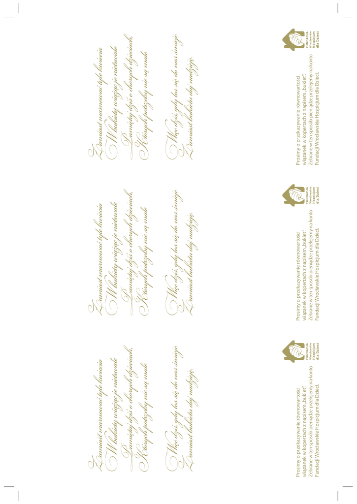 Prosimy o przekazywanie równowartości wiązanek w kopertach z napisem „bukiet”. Zebrane w ten sposób pieniądze przelejemy na konto Fundacji Wrocławskie Hospicjum dla Dzieci. Więc dziś, gdy los się do nas śmieje Zamiast bukietu daj nadzieję. Zamiast marnować tyle kwiecia W bukiety wiążąc je nietrwałe Pamiętaj dziś o chorych dzieciach, Których potrzeby nie są małe Prosimy o przekazywanie równowartości wiązanek w kopertach z napisem „bukiet”. Zebrane w ten sposób pieniądze przelejemy na konto Fundacji Wrocławskie Hospicjum dla Dzieci. Więc dziś, gdy los się do nas śmieje Zamiast bukietu daj nadzieję. Zamiast marnować tyle kwiecia W bukiety wiążąc je nietrwałe Pamiętaj dziś o chorych dzieciach, Których potrzeby nie są małe Prosimy o przekazywanie równowartości wiązanek w kopertach z napisem „bukiet”. Zebrane w ten sposób pieniądze przelejemy na konto Fundacji Wrocławskie Hospicjum dla Dzieci. Więc dziś, gdy los się do nas śmieje Zamiast bukietu daj nadzieję. Zamiast marnować tyle kwiecia W bukiety wiążąc je nietrwałe Pamiętaj dziś o chorych dzieciach, Których potrzeby nie są małe