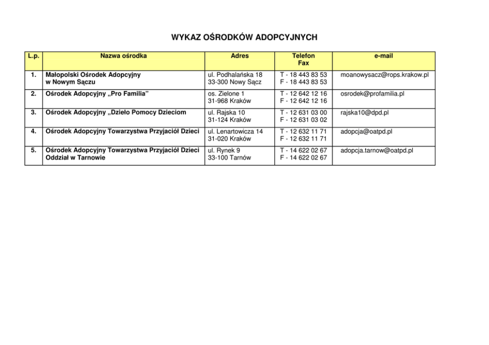 WYKAZ OŚRODKÓW ADOPCYJNYCH