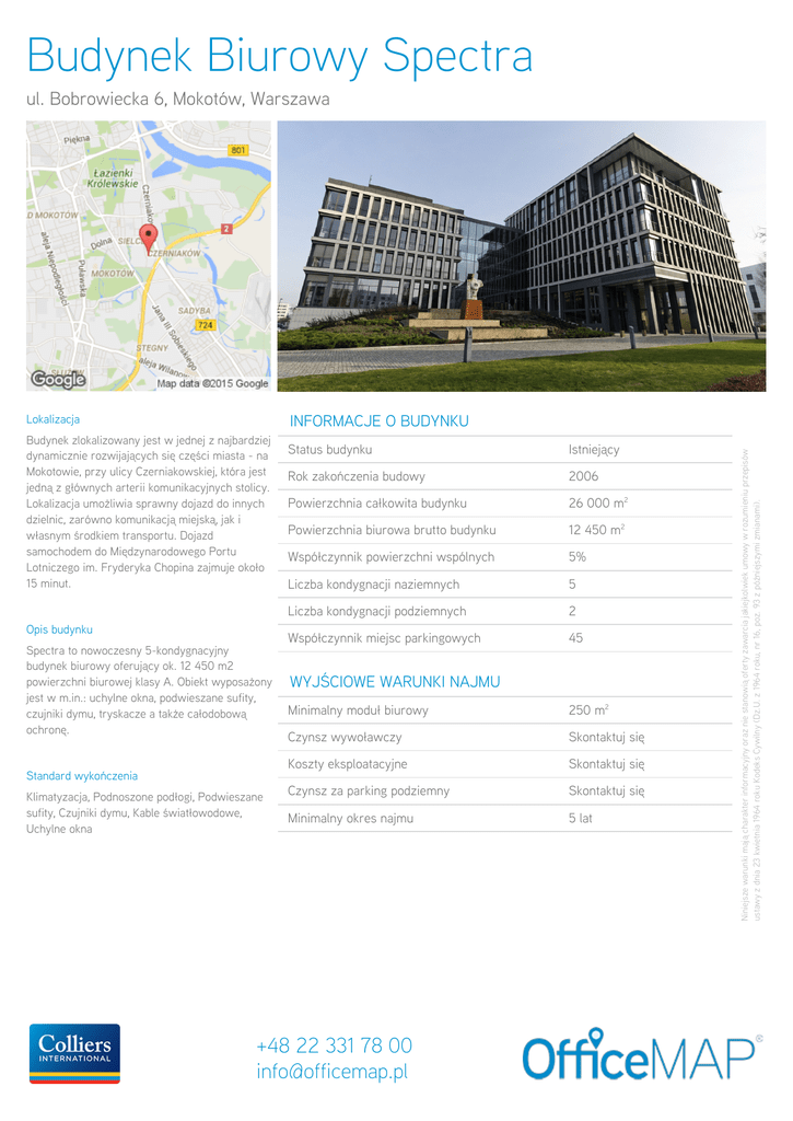 Budynek Biurowy Spectra ul. Bobrowiecka 6, Mokotów, Warszawa Lokalizacja Opis budynku Spectra to nowoczesny 5-kondygnacyjny budynek biurowy oferujący ok. 12 450 m2 powierzchni biurowej klasy A. Obiekt wyposażony jest w m.in.: uchylne okna, podwieszane sufity, czujniki dymu, tryskacze a także całodobową ochronę. Status budynku Istniejący Rok zakończenia budowy 2006 Powierzchnia całkowita budynku 26 000 m2 Powierzchnia biurowa brutto budynku 12 450 m2 Współczynnik powierzchni wspólnych 5% Liczba kondygnacji naziemnych 5 Liczba kondygnacji podziemnych 2 Współczynnik miejsc parkingowych 45 WYJŚCIOWE WARUNKI NAJMU Minimalny moduł biurowy 250 m2 Czynsz wywoławczy Skontaktuj się Koszty eksploatacyjne Skontaktuj się Czynsz za parking podziemny Skontaktuj się Minimalny okres najmu 5 lat Standard wykończenia Klimatyzacja, Podnoszone podłogi, Podwieszane sufity, Czujniki dymu, Kable światłowodowe, Uchylne okna +48 22 331 78 00 [email protected] Niniejsze warunki mają charakter informacyjny oraz nie stanowią oferty zawarcia jakiejkolwiek umowy w rozumieniu przepisów ustawy z dnia 23 kwietnia 1964 roku Kodeks Cywilny (Dz.U. z 1964 roku, nr 16, poz. 93 z późniejszymi zmianami). INFORMACJE O BUDYNKU Budynek zlokalizowany jest w jednej z najbardziej dynamicznie rozwijających się części miasta - na Mokotowie, przy ulicy Czerniakowskiej, która jest jedną z głównych arterii komunikacyjnych stolicy. Lokalizacja umożliwia sprawny dojazd do innych dzielnic, zarówno komunikacją miejską, jak i własnym środkiem transportu. Dojazd samochodem do Międzynarodowego Portu Lotniczego im. Fryderyka Chopina zajmuje około 15 minut.