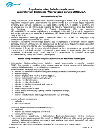 Regulamin usług świadczonych przez Laboratorium Badawczo-Wzorcujące i Serwis SONEL S.A. Postanowienia ogólne 1. Usługi świadczone przez Laboratorium Badawczo–Wzorcujące SONEL S.A. (w dalszej części regulaminu określane jako Laboratorium) oraz Serwis SONEL S.A. (w dalszej części regulaminu określany jako Serwis), realizowane są przez spółkę SONEL S.A. z siedzibą w Świdnicy, przy ul. Wokulskiego 11, 58-100 Świdnica, wpisaną do Rejestru Przedsiębiorców przez Sąd Rejonowy dla Wrocławia – Fabrycznej IX Wydział Gospodarczy KRS, pod numerem KRS 0000090121, o kapitale zakładowym w wysokości 1 400 000 PLN w całości wpłaconym, legitymującą się numerem identyfikacji podatkowej NIP: 8840033448, REGON: 890236667 (zwana dalej SONEL S.A.). 2. Warunki Regulaminu określają prawa i obowiązki Klienta oraz SONEL S.A. dotyczące usług świadczonych przez Laboratorium oraz Serwis. 3. Przesłanie prawidłowo wypełnionego zlecenia jest równoznaczne z zawarciem umowy zlecenia pomiędzy Klientem a SONEL S.A. Nie zastosowanie się do warunków Regulaminu będzie powodem odrzucenia zamówienia Klienta, jako niepodlegającego realizacji. 4. Laboratorium i Serwis nie ponoszą odpowiedzialności za dane zgromadzone na wewnętrznych i zewnętrznych nośnikach pamięci przekazanych z przyrządem do wzorcowania i/lub naprawy. Ustawienia użytkownika mogą zostać utracone lub przywrócone do ustawień fabrycznych w trakcie realizacji usługi wzorcowania i/lub naprawy. Zakres usług świadczonych przez Laboratorium Badawczo-Wzorcujące 1. Laboratorium Badawczo-Wzorcujące świadczy usługi wzorcowania przyrządów produkcji SONEL S.A. zgodnie z cennikiem usług umieszczonym na stronie www.sonel.pl. Laboratorium realizuje dodatkowe usługi po wcześniejszym uzgodnieniu. Wzorcowane są następujące typy przyrządów: mierniki do pomiarów wielkości elektrycznych oraz parametrów sieci energetycznych: miernik napięcia, mierniki prądu (w tym również mierniki cęgowe), mierniki zabezpieczeń różnicowoprądowych, mierniki rezystancji izolacji, mierniki rezystancji uziemień, mierniki do pomiaru impedancji pętli zwarcia, mierniki rezystancji, analizatory parametrów sieci, liczniki energii elektrycznej czynnej i biernej prądu przemiennego, multimetry, mierniki wielofunkcyjne obejmujące funkcjonalnie w/w przyrządy, wzorce wielkości elektrycznych: kalibratory, wzorce rezystancji, przyrządy do pomiarów wielkości nieelektrycznych: pirometry, mierniki do pomiaru natężenia oświetlenia, kamery termowizyjne. 2. Po wcześniejszym uzgodnieniu z Laboratorium Badawczo-Wzorcującym istnieje możliwość wzorcowania przyrządów producentów innych niż SONEL S.A. Zlecenie takiej usługi musi zawierać ustalony z Laboratorium zakres wzorcowania oraz ustaloną cenę usługi. Uzgodnień tych należy dokonać mailowo lub telefonicznie. 3. W przypadku takich przyrządów należy pamiętać o przekazaniu wraz z przyrządem: Wydanie 2.1 Strona 1 z 5 ładowarki (jeżeli przyrząd taką posiada), przewodów (jeżeli są specyficzne i/lub uwzględnione są w metodzie pomiaru), instrukcji obsługi i/lub specyfikacji technicznej (jeżeli nie jest ogólnodostępna na stronach producenta przyrządu), otrzymanej wyceny usługi. 4. Szczegóły dotyczące procesu wzorcowania oraz metody i punkty pomiarowe zostały opisane w załączniku nr 1 do niniejszego regulaminu. 5. Po wcześniejszym uzgodnieniu z Laboratorium daty oraz godziny, Zlecający ma możliwość wstępu do Laboratorium celem obserwacji świadczonej usługi wzorcowania. SONEL S.A może odmówić udziału Zlecającego w uzasadnionych przypadkach/bez podania przyczyny. Zlecający zobowiązuje się przestrzegać zasad BHP zakładu SONEL S.A., oraz nie utrudniać prowadzonych prac. 6. W zakresie przekazywanych informacji i dokumentów podczas wizyty opisanej w punkcie 4 niniejszego rozdziału, Klient zobowiązuje się bezwzględnie przestrzegać następujących zasad: Klient zobowiązuje się do zachowania w tajemnicy wszelkich materiałów, dokumentów oraz informacji poufnych (zwanych dalej łącznie „Informacjami poufnymi”), otrzymanych lub uzyskanych w formie ustnej, pisemnej lub elektronicznej, w sposób zamierzony lub przypadkowy w związku z realizacją usługi wzorcowania, zarówno przed jak i po dacie realizacji. Informacje poufne oznaczają wszelkie materiały, dokumenty oraz informacje techniczne, technologiczne, finansowe, handlowe, organizacyjne przedsiębiorstwa lub inne informacje posiadające wartość gospodarczą nieujawnione do publicznej wiadomości przez Zamawiającego lub osoby trzecie w sposób umożliwiający zapoznanie się z nimi przez nieoznaczony krąg osób, zarówno przed jak i po dacie podpisania zlecenia w rozumieniu ustawy z dnia 16 kwietnia 1993 roku o zwalczaniu nieuczciwej konkurencji (Dz. U. 2003, nr 153, poz. 1503 ze zm.). Przez zachowanie tajemnicy przedsiębiorstwa rozumie się nieujawnianie do wiadomości publicznej informacji technicznych, technologicznych, organizacyjnych przedsiębiorstwa lub innych informacji posiadających wartość gospodarczą, co do których przedsiębiorca podjął niezbędne działania w celu zachowania ich poufności w rozumieniu ustawy z dnia 16 kwietnia 1993 roku o zwalczaniu nieuczciwej konkurencji (Dz. U. 2003, nr 153, poz. 1503 ze zm.). Klient oświadcza, iż znane są mu zapisy regulujące zachowanie tajemnicy przedsiębiorstwa oraz dotyczące informacji poufnych zawarte w niżej powołanych ustawach, których treść zobowiązuje się przestrzegać tj.: ustawie z dnia 16 kwietnia 1993 roku o zwalczaniu nieuczciwej konkurencji (Dz. U. 2003, nr 153, poz. 1503 ze zm.), ustawie z dnia 4 lutego 1994 r. o prawie autorskim i prawach pokrewnych (Dz.U.2006.90.631 ze zm.), ustawie z dnia 29.07.2005 r. o obrocie instrumentami finansowymi (Dz. U. Nr. 183, poz. 1538 z 2005 r.) oraz ustawie z dnia 6 czerwca 1997 r. kodeks karny (Dz.U.1997.88.553 ze zm.). Obowiązek Klient
