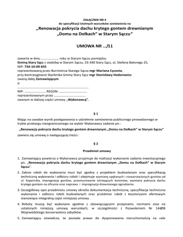 ZAŁĄCZNIK NR 4 do specyfikacji istotnych warunków zamówienia na „Renowacja pokrycia dachu krytego gontem drewnianym „Domu na Dołkach” w Starym Sączu” UMOWA NR …/11 zawarta w dniu ………………… roku w Starym Sączu pomiędzy: Gminą Stary Sącz z siedzibą w Starym Sączu, 33-340 Stary Sącz, ul. Stefana Batorego 25, NIP: 734-10-09-655 reprezentowaną przez Burmistrza Starego Sącza mgr Mariana Cyconia, przy kontrasygnacie Skarbnika Gminy Stary Sącz mgr Stanisławy Hodorowicz zwaną dalej Zamawiającym a: ………………………………………………………………………… NIP: ……………………. REGON: …………………………… reprezentowanym przez ………………………………. zwanym w dalszej części umowy „Wykonawcą”. §1 Mając na uwadze wynik postępowania o udzielenie zamówienia publicznego prowadzonego w trybie przetargu nieograniczonego na wybór Wykonawcy zadanie pn.: „Renowacja pokrycia dachu krytego gontem drewnianym „Domu na Dołkach” w Starym Sączu” zawiera się umowę o następującej treści: §2 Przedmiot umowy 1. Zamawiający powierza a Wykonawca przyjmuje do realizacji wykonanie zadania inwestycyjnego pn. „Renowacja pokrycia dachu krytego gontem drewnianym „Domu na Dołkach” w Starym Sączu”. 2. Zakres robót do wykonania musi byd zgodny z projektem budowlanym oraz specyfikacją techniczną wykonania i odbioru robót i obejmuje wymianę spękanych i rozwarstwionych gontów od ul. Kopernika, impregnacja gontów, przemurowanie istniejących kominów, wymiana pokrycia dachu krytego gontem na oficynie oraz naprawa i impregnacja drewnianego ogrodzenia. 3. Szczegółowy opis przedmiotu umowy określa dokumentacja techniczna, specyfikacja techniczna wykonania i odbioru robót budowlanych oraz przedmiar robót z kosztorysem ofertowym stanowiące integralną częśd niniejszej umowy. 4. Roboty muszą byd wykonane zgodnie z obowiązującymi przepisami, normami oraz na ustalonych niniejszą umową warunkach, w szczególności z Pozwoleniem Nr 144/08 Wojewódzkiego konserwatora zabytków. 5. Zamawiający oświadcza, że posiada prawo do dysponowania nieruchomością na cele budowlane. 6. Kosztorys będący załącznikiem do złożonej oferty nie stanowi podstawy obliczenia ceny, cena określona w § 7 ust 1 niniejszej umowy jest ceną ryczałtową i obejmuje wszelkie koszty. Jednakże jeżeli w trakcie wykonywania robót Zamawiający (inwestor) ograniczy zakres robót, bądź dokona zmian w technologii to wynagrodzenie Wykonawcy będzie korygowane o skutki wynikające z tych zmian w oparciu o bazę cenowo-kosztorysową kosztorysu ofertowego Wykonawcy. 7. W przypadku konieczności wprowadzenia zmian w dokumentacji projektowej roboty zaniechane spowodują zmniejszenie wynagrodzenia o wartośd wyliczoną na podstawie nakładów rzeczowych i kosztowych zawartych w kosztorysie ofertowym. §3 Obowiązki stron 1. Obowiązki Zamawiającego. 1.1. Dostarczenie w 1 (jednym) egzemplarzu dokumentacji projektowej w terminie do 7 (siedmiu) dni od daty podpisania niniejszej umowy. 1.2. Przekazanie zgłoszenia robót wraz z Dziennikiem budowy w terminie do 7 dni (siedmiu) dni od daty podpisania umowy. 1.3. Przekazanie terenu budowy w terminie do 7 (siedmiu) dni od daty podpisania umowy. 1.4. Dokonanie odbioru wykonanych prac na zasadach określonych w § 6 niniejszej umowy. 1.5. Zapewnienie bieżącego nadzoru inwestorskiego. 2. Obowiązki Wykonawcy. 2.1. Prawidłowe wykonanie wszystkich prac związanych z realizacją przedmiotu umowy zgodnie z projektem budowlanym, specyfikacją techniczną wykonania i odbioru robót, przedmiarem oraz z aktualnie obowiązującymi normami, Prawem budowlanym wraz z aktami wykonawczymi do niego i innymi obowiązującymi przepisami. 2.2. Przejęcie od Zamawiającego terenu budowy. 2.4. Sporządzenie, przed rozpoczęciem budowy, planu bezpieczeostwa i ochrony zdrowia, uwzględniając specyfikę obiektu budowlanego i warunki prowadzenia robót budowlanych 2.5 Prowadzenie robót budowlano-montażowych, w taki sposób aby możliwe było bezpieczne korzystanie z obiektu. Wykonawca jest zobowiązany zabezpieczyd i oznakowad prowadzone roboty oraz dbad o stan techniczny i prawidłowośd oznakowania przez cały czas trwania realizacji zadania. Wykonawca ponosi pełną odpowiedzialności za szkody oraz następstwa nieszczęśliwych wypadków pracowników i osób trzecich, powstałe w związku z prowadzonymi robotami, w tym także ruchem pojazdów. 2.6. Współpraca ze służbami Zamawiającego. 2.7. Prowadzenie Dziennika budowy i udostępnianie go Zamawiającemu celem dokonywania wpisów i potwierdzeo. 2.8. Przygotowanie obiektów i wymaganych dokumentów do dokonania odbioru przez Zamawiającego. 2.9. Zgłaszanie robót do odbioru. 2.11.Przestrzeganie przepisów bhp i ppoż. 2.12. Zapewnienie kadry i nadzoru z wymaganymi uprawnieniami. 2.13. Zapewnienie sprzętu spełniającego wymagania norm technicznych. 2.14. Utrzymanie porządku na terenie budowy w czasie realizacji prac. 2.15. Likwidacja terenu budowy i zaplecza własnego Wykonawcy bezzwłocznie po zakooczeniu prac, lecz nie później niż do dnia odbioru koocowego. 2.16. Materiały użyte przez Wykonawcę do realizacji przedmiotu umowy muszą byd dopuszczone do obrotu powszechnego lub jednostkowego stosowania w budownictwie zgodnie z art. 10 ustawy z dnia 7 lipca 1994 r. Prawo budowlane (t. j. Dz. U z 2006 r. Nr 156 poz. 1118 ze zm.) oraz przepisami ustawy z dnia 16 kwietnia 2004 r. o wyrobach budowlanych (Dz. U. Nr 92 poz. 881 ze zm.). 2.17. Wykonawca ponosi pełną odpowiedzialnośd za zapewnienie i przestrzeganie warunków bezpieczeostwa w czasie wykonywania prac. 2.18. Wykonawca jest zobowiązany do odpowiedzialności za powstałe w toku własnych prac odpady oraz za właściwy sposób postępowania z nimi, zgodnie z przepisami ustawy z dnia 27 kwietnia 2001 r. o odpadach (t. j. Dz. U z 2007 r. Nr 39 poz. 251 ze zm.) oraz ustawy