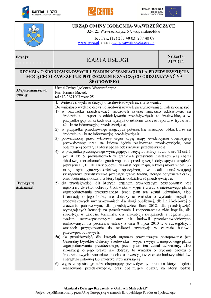 URZĄD GMINY IGOŁOMIA-WAWRZEŃCZYCE 32-125 Wawrzeńczyce 57; woj. małopolskie Tel, Fax: (12) 287 40 03, 287 40 07 www.igwa.pl, e-mail: [email protected] Edycja: …………………… KARTA USŁUGI Nr karty: 21/2014 DECYZJA O ŚRODOWISKOWYCH UWARUNKOWANIACH DLA PRZEDSIĘWZIĘCIA MOGĄCEGO ZAWSZE LUB POTENCJALNIE ZNACZĄCO ODDZIAŁYWAĆ NA ŚRODOWISKO Miejsce załatwienia sprawy Wymagane dokumenty Urząd Gminy Igołomia-Wawrzeńczyce Pan Tomasz Buczek tel.: 12 2874003 wew.25 1. Wniosek o wydanie decyzji o środowiskowych uwarunkowaniach Do wniosku o wydanie decyzji o środowiskowych uwarunkowaniach należy dołączyć: 1) w przypadku przedsięwzięć mogących zawsze znacząco oddziaływać na środowisko - raport o oddziaływaniu przedsięwzięcia na środowisko, a w przypadku gdy wnioskodawca wystąpił o ustalenie zakresu raportu w trybie art. 69 - kartę informacyjną przedsięwzięcia; 2) w przypadku przedsięwzięć mogących potencjalnie znacząco oddziaływać na środowisko - kartę informacyjną przedsięwzięcia; 3) poświadczoną przez właściwy organ kopię mapy ewidencyjnej obejmującej przewidywany teren, na którym będzie realizowane przedsięwzięcie, oraz obejmującej obszar, na który będzie oddziaływać przedsięwzięcie; 4) w przypadku przedsięwzięć wymagających decyzji, o której mowa w art. 72 ust. 1 pkt. 4 lub 5, prowadzonych w granicach przestrzeni niestanowiącej części składowej nieruchomości gruntowej oraz przedsięwzięć dotyczących urządzeń piętrzących I, II i III klasy budowli, zamiast kopii mapy, o której mowa w pkt. 3 mapę sytuacyjno-wysokościową sporządzoną w skali umożliwiającej szczegółowe przedstawienie przebiegu granic terenu, którego dotyczy wniosek, oraz obejmującą obszar, na który będzie oddziaływać przedsięwzięcie; 5) dla przedsięwzięć, dla których organem prowadzącym postępowanie jest regionalny dyrektor ochrony środowiska - wypis i wyrys z miejscowego planu zagospodarowania przestrzennego, jeżeli plan ten został uchwalony, albo informację o jego braku; nie dotyczy to wniosku o wydanie decyzji o środowiskowych uwarunkowaniach dla drogi publicznej, dla linii kolejowej o znaczeniu państwowym, dla przedsięwzięć Euro 2012, dla przedsięwzięć wymagających koncesji na poszukiwanie i rozpoznawanie złóż kopalin, dla inwestycji w zakresie terminalu, dla inwestycji związanych z regionalnymi sieciami szerokopasmowymi oraz dla budowli przeciwpowodziowych realizowanych na podstawie ustawy z dnia 8 lipca 2010 r. o szczególnych zasadach przygotowania do realizacji inwestycji w zakresie budowli przeciwpowodziowych; 5a) dla przedsięwzięć, dla których organem prowadzącym postępowanie jest Generalny Dyrektor Ochrony Środowiska - wypis i wyrys z miejscowego planu zagospodarowania przestrzennego, jeżeli plan ten został uchwalony, albo informację o jego braku; nie dotyczy to wniosku o wydanie decyzji o środowiskowych uwarunkowaniach dla inwestycji w zakresie budowy obiektów energetyki jądrowej lub inwestycji towarzyszącej; 6) wypis z rejestru gruntów obejmujący przewidywany teren, na którym będzie realizowane przedsięwzięcie, oraz obejmujący obszar, na który będzie oddziaływać 1 Akademi a Dobrego Rządzenia w Gminach Małopolski” Projekt współfinansowany przez Unię Europejską w ramach Europejskiego Funduszu Społecznego oddziaływać przedsięwzięcie, z zastrzeżeniem ust. 1a-1c. 1a. Jeżeli liczba stron w postępowaniu o wydanie decyzji o środowiskowych uwarunkowaniach przekracza 20, dla przedsięwzięć mogących zawsze znacząco oddziaływać na środowisko oraz dla przedsięwzięć mogących potencjalnie znacząco oddziaływać na środowisko, dla których stwierdzono obowiązek przeprowadzenia oceny oddziaływania na środowisko, wypis z rejestru, o którym mowa w ust. 1 pkt 6, przedkłada się wraz z raportem o oddziaływaniu przedsięwzięcia na środowisko. 1b. Jeżeli liczba stron w postępowaniu o wydanie decyzji o środowiskowych uwarunkowaniach przekracza 20, dla przedsięwzięć mogących potencjalnie znacząco oddziaływać na środowisko, dla których nie stwierdzono obowiązku przeprowadzenia oceny oddziaływania na środowisko, wypis z rejestru, o którym mowa w ust. 1 pkt 6, przedkłada się w terminie 14 dni od dnia, w którym postanowienie stało się ostateczne. 1c. Jeżeli liczba stron w postępowaniu o wydanie decyzji o środowiskowych uwarunkowaniach przekracza 20, dla przedsięwzięć wymagających decyzji, o których mowa w art. 72 ust. 1 pkt 4 i 5, oraz przedsięwzięć dotyczących urządzeń piętrzących I, II i III klasy budowli, nie wymaga się wypisu z rejestru, o którym mowa w ust. 1 pkt. 6. 2. Raport o oddziaływaniu przedsięwzięcia na środowisko i kartę infor macyjną przedsięwzięcia przedkłada się w trzech egzemplarzach, wraz z ich zapisem w formie elektronicznej na informatycznych nośnikach danych. 3. Jeżeli liczba stron postępowania o wydanie decyzji o środowiskowych uwarunkowaniach przekracza 20, stosuje się przepis art. 49 Kodeksu postępowania administracyjnego. Opłaty Opłata skarbowa za wydanie decyzji wynosi: 205 zł W przypadku działania przez pełnomocnika: 17 zł (od każdego stosunku pełnomocnictwa). Opłatę dokonuje się na konto Urzędu Gminy Igołomia-Wawrzeńczyce Nr 26 8597 0001 0050 0500 0130 0001 w BS Proszowice o/Wawrzeńczyce Podstawa prawna Ustawa z dnia 3 października 2008 r. o udostępnianiu informacji o środowisku i jego ochronie, udziale społeczeństwa w ochronie środowiska oraz o ocenach oddziaływania na środowisko (Dz. U. z 2013 r. poz. 1235 z późn. zm.) Rozporządzenie Rady Ministrów z dnia 9 listopada 2010 r. w sprawie przedsięwzięć mogących znacząco oddziaływać na środowisko (Dz. U. z 2010 r. Nr 213, poz. 1397 z późn. zm.) Ustawy z dnia 16 listopada 2006 r. o opłacie skarbowej – (Dz. U. z 2012r. poz. 1282 z późn. zm.) Termin realizacji W ciągu miesiąca, a w spraw
