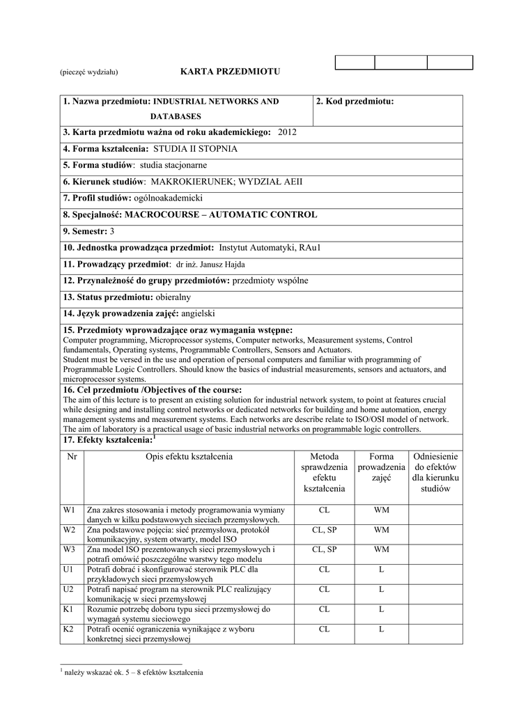 (pieczęć wydziału) KARTA PRZEDMIOTU 1. Nazwa przedmiotu: INDUSTRIAL NETWORKS AND 2. Kod przedmiotu: DATABASES 3. Karta przedmiotu ważna od roku akademickiego: 2012 4. Forma kształcenia: STUDIA II STOPNIA 5. Forma studiów: studia stacjonarne 6. Kierunek studiów: MAKROKIERUNEK; WYDZIAŁ AEII 7. Profil studiów: ogólnoakademicki 8. Specjalność: MACROCOURSE – AUTOMATIC CONTROL 9. Semestr: 3 10. Jednostka prowadząca przedmiot: Instytut Automatyki, RAu1 11. Prowadzący przedmiot: dr inż. Janusz Hajda 12. Przynależność do grupy przedmiotów: przedmioty wspólne 13. Status przedmiotu: obieralny 14. Język prowadzenia zajęć: angielski 15. Przedmioty wprowadzające oraz wymagania wstępne: Computer programming, Microprocessor systems, Computer networks, Measurement systems, Control fundamentals, Operating systems, Programmable Controllers, Sensors and Actuators. Student must be versed in the use and operation of personal computers and familiar with programming of Programmable Logic Controllers. Should know the basics of industrial measurements, sensors and actuators, and microprocessor systems. 16. Cel przedmiotu /Objectives of the course: The aim of this lecture is to present an existing solution for industrial network system, to point at features crucial while designing and installing control networks or dedicated networks for building and home automation, energy management systems and measurement systems. Each networks are describe relate to ISO/OSI model of network. The aim of laboratory is a practical usage of basic industrial networks on programmable logic controllers. 17. Efekty kształcenia:1 Nr W1 W2 W3 U1 U2 K1 K2 1 Opis efektu kształcenia Zna zakres stosowania i metody programowania wymiany danych w kilku podstawowych sieciach przemysłowych. Zna podstawowe pojęcia: sieć przemysłowa, protokół komunikacyjny, system otwarty, model ISO Zna model ISO prezentowanych sieci przemysłowych i potrafi omówić poszczególne warstwy tego modelu Potrafi dobrać i skonfigurować sterownik PLC dla przykładowych sieci przemysłowych Potrafi napisać program na sterownik PLC realizujący komunikację w sieci przemysłowej Rozumie potrzebę doboru typu sieci przemysłowej do wymagań systemu sieciowego Potrafi ocenić ograniczenia wynikające z wyboru konkretnej sieci przemysłowej należy wskazać ok. 5 – 8 efektów kształcenia Metoda sprawdzenia efektu kształcenia Forma Odniesienie prowadzenia do efektów zajęć dla kierunku studiów CL WM CL, SP WM CL, SP WM CL L CL L CL L CL L Rozumie potrzebę ciągłego śledzenia najnowszych rozwiązań komunikacyjnych stosowanych w przemyśle 18. Formy zajęć dydaktycznych i ich wymiar (liczba godzin) K3 W. : 30 Ćw. : 0 CL L L.: 15 19. Treści kształcenia: Wykład / Course description Industrial networks are a very important part of the modern control systems. Sensor buses, device buses, field buses and data buses connect PLCs to the meters, sensors, remote input/output modules, other controllers, PLCs and SCADA systems. This lecture is about networks efficiency and reliability. The aim is to show the best solutions for different cases by comparison strengths and weaknesses of various solutions. The lecture is divided into 3 parts: An Introduction to Industrial Communication Networks, Protocols and Networks and Databases. An industrial communication network is also called a control network, which is any group of devices working in a peer-to-peer fashion to monitor sensors, control actuators, communicate reliably, manage network operation, and provide complete access to network data. This part of lecture defines elements used during communication, transmission methods and types, formulates requirements and positioning of the main networks. On the basis of OSI model, the most popular transmission media, various topologies, medium access methods and concepts used at application level are described. Protocols and networks discuss the most popular industrial protocols such as Modbus, Profibus, CANopen, DeviceNet, Unitelway, Interbus. Also dedicated solutions like LON and KNX or M-bus systems are presented. The very important part of a control network is a database. A good database design allows to analyze trends, create customer lists, generate reports, maintain employee profiles or get a handle on any number of critical tasks unique to company and industry. The last part of the lecture shows industry database design methods. Topics: 1. An Introduction To Industrial Communication Networks 2. Protocols and networks for control of process: Modbus, Modbus + 3. Protocols and networks for control of process: Modbus TCP 4. Protocols and networks for control of process: Profibus - Profibus DP 5. Protocols and networks for control of process: CAN – CANOpen 6. Protocols and networks for control of process: DeviceNet, Interbus 7. Protocols and networks for control of machine: sensor bus AS-i 8. Network systems: X-Way 9. Networks in HVAC and BEMS: Lonwoks 10. Networks in HVAC and BEMS: KNX 11. Communication Networks and Systems in Substations: IEC 61850 12. Databases in Industry Zajęcia laboratoryjne / Laboratory 1. Modbus Protocol on Modicon PLCs; Frame analysis and interpretation 2. Modbus Plus Network on Modicon PLCs 3. Modbus TCP Protocol on Modicon and WAGO IPC 4. Profibus DP Network on Siemens Simatic S7-300 5. Planning of Databases for Industry 20. Egzamin: nie 21. Literatura podstawowa: 1. „Optical Switching and Networking Handbook”, Regis J. “Bud” Bates; McGraw-Hill 2. „Process-Industrial Instruments and Control Handbook. Section 7: CONTROL COMMUNICATIONS”, B. A. Loyer, Howard L. Skolnik, G. McMillan; 3. „Modicon Modbus Protocol Reference Guide”, MODICON, Inc. 4. „Modicon Modbus Plus Network. Planning and Installation Guide”, Schneider Electric Inc. 5. „CAN Specification 2.0”, CAN in Automation 22. Literatura uzupełniająca: 1. „Modicon Modbus Protocol Reference Guide”, MODICON, Inc. 2. „Modicon Modbus