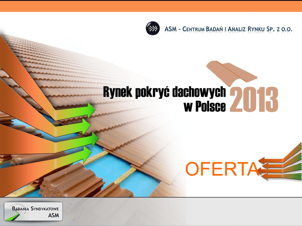 OFERTA Pierwszy tak kompleksowy i aktualny raport o rynku pokryć dachowych w Polsce! Raport to: Kompendium wiedzy o sytuacji na rynku pokryć dachowych, Szczegółowa i dogłębna analiza przeprowadzona na podstawie źródeł pierwotnych i wtórnych, Rzetelnie opracowana wielkość rynku pokryć dachowych w 2012 roku, Wiarygodne i złożone prognozy przyszłego potencjału rynku pokryć dachowych na lata 2013-2015. Raport to wiedza, która pomoże podjąć Państwu strategiczne decyzje w przedsiębiorstwie! Zakres raportu Raport składa się z 9 rozdziałów: Metodologia projektu, Ogólna sytuacja na rynku budowlanym i jej wpływ na rynek pokryć dachowych, Profil firm dekarskich, Analiza rynku pokryć dachowych w opinii wykonawców, Zakupy i trendy na rynku pokryć dachowych w opinii wykonawców, Akcesoria dachowe w opinii wykonawców, Analiza rynku pokryć dachowych w opinii producentów, Wielkość rynku pokryć dachowych w ujęciu ilościowym, Prognoza wielkości rynku pokryć dachowych w ujęciu ilościowym, które stanowią źródło niezbędnych informacji przydatnych w każdym procesie decyzyjnym. I. Metodologia projektu Raport powstał w oparciu o dwa rodzaje źródeł: Źródła pierwotne - zostały zgromadzone przy wykorzystaniu kwestionariuszy ankietowych (N=367 wywiadów CATI z wykonawcami - dekarzami) oraz wywiadów pogłębionych IDI z producentami (N=11) . Źródła wtórne - dotyczyły danych zebranych z Głównego Urzędu Statystycznego i odnosiły się do ilości budynków mieszkalnych i niemieszkalnych oddanych do użytkowania, ich kubatury oraz powierzchni użytkowej. Dokonano również analizy 175 gotowych projektów budowlanych, charakterystycznych dla poszczególnych typów obiektów budowlanych, w celu wyliczenia wskaźnika obrazującego ilość metrów kwadratowych powierzchni dachowej przypadającej na metr kwadratowy powierzchni użytkowej budynku. II. Ogólna sytuacja na rynku budowlanym i jej wpływ na rynek pokryć dachowych II część raportu pozwoliła zidentyfikować podstawowe uwarunkowania rozwoju rynku pokryć dachowych w Polsce w kontekście sytuacji makroekonomicznej kraju oraz ogólnej sytuacji na rynku budowlanym. Analizowane dane w II części raportu dotyczą: sytuacji makroekonomicznej kraju, mierników rozwoju budownictwa (produkcja budowlanomontażowa, klimat koniunktury w budownictwie, upadłość firm budowlanych), budownictwa mieszkaniowego, budownictwa niemieszkalnego. Dane zawarte w tej części raportu zostały również przeanalizowane w podziale na regiony: centralny, północny, północno-zachodni, południowo-zachodni, południowy i wschodni. III. Profil firm dekarskich III część raportu składa się z: charakterystyki wykonawców wykonujących prace związane z zakładaniem pokryć dachowych (wielkość firmy wykonawczej – wg zatrudnionych pracowników, obszar na jakim działają firmy wykonawcze), charakterystyka działalności badanych dekarzy (główny profil działalności dekarzy w 2012 roku, ilość położonych m² pokryć dachowych). IV. Analiza rynku pokryć dachowych w opinii wykonawców Rozdział IV to informacje pozyskane z badania wykonawców dotyczące rynku pokryć dachowych. Dane zostały zaprezentowane w podziale na typ budownictwa: jednorodzinne, wielorodzinne i niemieszkalne. Każdy podrozdział (konkretny typ budownictwa) zawiera informacje dotyczące: struktury wykonywanych prac w podziale na charakter inwestycji (nowe i remontowane), struktury montowanych dachów (skośne i płaskie), struktury poszczególnych rodzajów pokryć dachowych stosowanych na nowych i remontowanych budynkach, na dachach skośnych i płaskich, najczęściej stosowanych marek pokryć dachowych w podziale na blaszane, bitumiczne, ceramiczne i cementowe. Dodatkowo dane zostały zaprezentowane w podziale na regiony (centralny, północny, północno-zachodni, południowo-zachodni, południowy i wschodni). V. Zakupy i trendy na rynku pokryć dachowych w opinii wykonawców Rozdział V to informacje pozyskane z badania wykonawców dotyczące zakupów i trendów panujących na rynku pokryć dachowych. Informacje zawarte w rozdziale to: ocena rynku dekarskiego okiem wykonawcy, pokrycia dachowe najpopularniejsze obecnie wśród inwestorów indywidualnych i instytucjonalnych, najczęstsze miejsce zakupu pokryć dachowych, fakt proponowania przez sprzedawców zakupu pokryć dachowych razem z izolacją, fakt wykonywania prac izolacyjnych dachów, struktura stosowanych do ocieplania dachów materiałów termoizolacyjnych, stosowane marki akcesoriów do ocieplania dachów. VI. Akcesoria dachowe w opinii wykonawców Rozdział VI zawiera informacje pozyskane z badania wykonawców dotyczące akcesoriów dachowych stosowanych przez wykonawców podczas montażu dachu w 2012 roku oraz spontanicznej znajomości producentów tych materiałów. Dane dotyczące znajomości producentów akcesoriów dachowych zostały dodatkowo zaprezentowane regionalnie (region centralny, północny, północno-zachodni, południowo-zachodni, południowy i wschodni). Rozdział ten zawiera również czynniki, które mają wpływ na wybór akcesoriów dachowych. VII. Analiza rynku pokryć dachowych w opinii producentów Rozdział VII to analiza danych zebranych w wywiadach pogłębionych IDI z producentami pokryć dachowych. Pozyskane w badaniu informacje pozwoliły określić: ogólne tendencje na rynku pokryć dachowych (struktura udziałów poszczególnych pokryć dachowych, czynniki w procesie decyzyjnym), wielkość produkcji pokryć dachowych ogółem (w opinii producentów), głównych graczy na rynku w poszczególnych rodzajach pokryć dachowych, kanały dystrybucji, strukturę sprzedaży (wg odbiorców, typów budownictwa, geograficznej dystrybucji Polska - zagranica), tendencje w zastosowaniu różnego rodzaju pokryć dachowych w budownictwie jednorodzinnym, wielorodzinnym i niemieszkalnym, plany asortymentowe, przyszłe trendy na rynku pokryć dachowych. VIII.