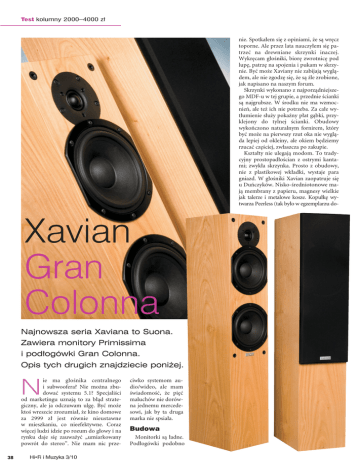Test kolumny 2000–4000 z∏ nie. Spotka∏em si´ z opiniami, ˝e sà wr´cz toporne. Ale przez lata nauczy∏em si´ patrzeç na drewniane skrzynki inaczej. Wykr´cam g∏oÊniki, bior´ zwrotnic´ pod lup´, patrz´ na spojenia i pukam w skrzynie. Byç mo˝e Xaviany nie zabijajà wyglàdem, ale nie zgodz´ si´, ˝e sà êle zrobione, jak napisano na naszym forum. Skrzynki wykonano z najporzàdniejszego MDF-u w tej grupie, a przednie Êcianki sà najgrubsze. W Êrodku nie ma wzmocnieƒ, ale te˝ ich nie potrzeba. Za ca∏e wyt∏umienie s∏u˝y pokaêny p∏at gàbki, przyklejony do tylnej Êcianki. Obudowy wykoƒczono naturalnym fornirem, który byç mo˝e na pierwszy rzut oka nie wyglàda lepiej od okleiny, ale okiem b´dziemy rzucaç cz´Êciej, zw∏aszcza po zakupie. Kszta∏ty nie ulegajà modom. To tradycyjny prostopad∏oÊcian z ostrymi kantami; zwyk∏a skrzynka. Prosto z obudowy, nie z plastikowej wk∏adki, wystaje para gniazd. W g∏oÊniki Xavian zaopatruje si´ u Duƒczyków. Nisko-Êredniotonowe majà membrany z papieru, magnesy wielkie jak talerze i metalowe kosze. Kopu∏k´ wytwarza Peerless (tak by∏o w egzemplarzu do- Xavian Gran Colonna Najnowsza seria Xaviana to Suona. Zawiera monitory Primissima i pod∏ogówki Gran Colonna. Opis tych drugich znajdziecie poni˝ej. ie ma g∏oÊnika centralnego i subwoofera? Nie mo˝na zbudowaç systemu 5.1? SpecjaliÊci od marketingu uznajà to za b∏àd strategiczny, ale ja odczuwam ulg´. Byç mo˝e ktoÊ wreszcie zrozumia∏, ˝e kino domowe za 2999 z∏ jest równie nieustawne w mieszkaniu, co nieefektywne. Coraz wi´cej ludzi idzie po rozum do g∏owy i na rynku daje si´ zauwa˝yç „umiarkowany powrót do stereo”. Nie mam nic prze- N 38 Hi•Fi i Muzyka 3/10 ciwko systemom audio/wideo, ale mam ÊwiadomoÊç, ˝e pi´ç maluchów nie dorówna jednemu mercedesowi, jak by ta druga marka nie spsia∏a. Budowa Monitorki sà ∏adne. Pod∏ogówki podobno Test kolumny 2000–4000 z∏ Minimalizm w czystej postaci. starczonym do redakcji), chocia˝ od jakiegoÊ czasu dost´pne sà Scan-Speaki. Druga marka jest bardziej presti˝owa, ale efekt taki sam – g∏oÊniki sà identyczne. Osie przetworników nisko-Êrednio- i wysokotonowego zbli˝ono poprzez na∏o˝enie na siebie ko∏nierzy. To wynik dà˝enia do punktowego êród∏a dêwi´ku które oferuje najlepsze wra˝enia przestrzenne. Je˝eli lubujecie si´ w historii producentów, to warto wspomnieç, ˝e wszystkie kolumny Xaviana wytwarza si´ r´cznie w Republice Czeskiej. Dla mnie to rekomendacja, bo wiem, ˝e Polacy czy Czesi sà bardziej wydajnymi i starannymi wykonawcami ni˝ Francuzi czy W∏osi. Po prostu, jeszcze im si´ w g∏owach nie poprzewraca∏o. Znajà wartoÊç pracy i czujà sens kultywowania jej etosu. Je˝eli przyjrzycie si´ Gran Colonnom z bliska, to zrozumiecie, o co mi chodzi. Roberto przepad∏ z kretesem u naszych sàsiadów nie tylko dlatego, ˝e o˝eni∏ si´ z Czeszkà. Chocia˝, jak sobie przypomn´ swoje spacery po Pradze, to jestem sk∏onny go zrozumieç. Wra˝enia ods∏uchowe Wprawdzie na s∏uchaniu muzyki fortepianowej zakoƒczy∏em, ale ten opis postanowi∏em rozpoczàç w∏aÊnie od niej. Dlatego, ˝e kiedy w∏àczy∏em „Grand Piano”, przyku∏o mnie do fotela. Od pierwszych sekund wiedzia∏em, ˝e w porównaniu z resztà kolumn z tego testu, brzmienie fortepianu na Xavianach to po prostu inna bajka. Gran Colonnom znacznie bli˝ej do poziomu AP Tempo VI ni˝ do typowych przedstawicieli segmentu 2000-4000 z∏. Dêwi´k si´ otworzy∏, zw∏aszcza w dwóch aspektach: góry pasma i przestrzeni. Je˝eli chodzi o t´ pierwszà, nareszcie przesta∏em s∏yszeç robot´ kopu∏ek, które koniecznie musia∏y coÊ uwypukliç. Dêwi´k sta∏ si´ aksamitny, swobodny i prawdziwy. Przy braku wyostrzeƒ i ekspozycji pojawi∏o si´ mnóstwo szczegó∏ów. Wiele razy czyta∏em o „zdj´ciu kotary z g∏oÊnika” i tym razem zdarzy∏o si´ w∏aÊnie coÊ takiego. S∏uchajàc wielu kolumn, myÊla∏em: „jest OK, mo˝e troch´ brz´czà wysokie, ale dó∏ jest jak nale˝y”. A tutaj mog∏em si´ skupiç si´ na muzyce. Xavianom uda∏o si´ zniknàç w tym nagraniu. Prezentacja przestrzeni przypomina∏a do z∏udzenia moje Audio Physiki. Gran Colonny nie zachowujà si´ jak kolumny pod∏ogowe, ale raczej jak dobry monitor. SpójnoÊç brzmienia fortepianu, zakresy, rejestry? Jest instrument, czyli wy˝sza szko∏a jazdy. I o ile w przypadku poszczególnych uczestników tego testu mo˝na by∏o chwaliç poszczególne aspekty brzmienia, to tutaj mo˝na zamknàç spraw´ jednym okreÊleniem: audiofilskie kolumny. W jazzowych sk∏adach us∏ysza∏em prawdziwy werbel, mi´sisty kontrabas, czystà i jednoczeÊnie nie k∏ujàcà w uszy tràbk´, Przetworniki z wysokiej pó∏ki. Uk∏ad 2,5-dro˝ny. a wszystkie instrumenty ustawione w konkretnych miejscach na scenie, której rozmiary mo˝na by∏o wyczuç. Dêwi´k czysty i jednoczeÊnie pozwalajàcy na relaks bez wzgl´du na poziom g∏oÊnoÊci. Cz´sto przy zbyt du˝ej iloÊci decybeli przekraczamy granic´ tolerancji naszych uszu. G∏ównie ze wzgl´du na ha∏asujàcà gór´ lub dudniàcy bas. Tutaj b´dzie po prostu za g∏oÊno, ale nienaturalnych zjawisk raczej nie stwierdzimy. OczywiÊcie, wiele zale˝y od towarzyszàcej elektroniki. Ja mia∏em szcz´Êcie korzystaç ze Êwietnych wzmacniaczy. Trudno sobie wyobraziç, ˝eby ktoÊ u˝ywa∏ do nap´dzania tych kolumienek McIntosha MA7000 i okablowania wartego tyle, co cztery pary Xavianów, ale uwierzcie mi – czeskie skrzynki potrafi∏y si´ znaleêç w tak doborowym towarzystwie. Mam te˝ rozsàdniejszà wskazówk´: Êwietnym Zaciski wystajà wprost z obudowy. To u∏atwia instalacj´ przewodów. partnerem dla Xavianów jest Baltlab Epoca 1 v.3. Do tego stopnia, ˝e poprosi∏em, aby dystrybutor koniecznie przedstawi∏ Epoc´ Roberto Barletcie. Byç mo˝e zaowocuje to obecnoÊcià naszego produktu za g