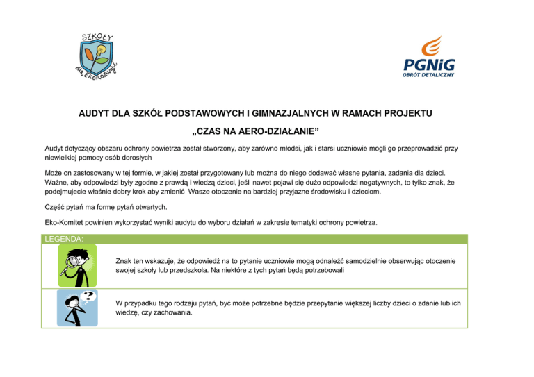 AUDYT DLA SZKÓŁ PODSTAWOWYCH I GIMNAZJALNYCH W RAMACH PROJEKTU „CZAS NA AERO-DZIAŁANIE” Audyt dotyczący obszaru ochrony powietrza został stworzony, aby zarówno młodsi, jak i starsi uczniowie mogli go przeprowadzić przy niewielkiej pomocy osób dorosłych Może on zastosowany w tej formie, w jakiej został przygotowany lub można do niego dodawać własne pytania, zadania dla dzieci. Ważne, aby odpowiedzi były zgodne z prawdą i wiedzą dzieci, jeśli nawet pojawi się dużo odpowiedzi negatywnych, to tylko znak, że podejmujecie właśnie dobry krok aby zmienić Wasze otoczenie na bardziej przyjazne środowisku i dzieciom. Część pytań ma formę pytań otwartych. Eko-Komitet powinien wykorzystać wyniki audytu do wyboru działań w zakresie tematyki ochrony powietrza. LEGENDA: Znak ten wskazuje, że odpowiedź na to pytanie uczniowie mogą odnaleźć samodzielnie obserwując otoczenie swojej szkoły lub przedszkola. Na niektóre z tych pytań będą potrzebowali W przypadku tego rodzaju pytań, być może potrzebne będzie przepytanie większej liczby dzieci o zdanie lub ich wiedzę, czy zachowania. Te pytania dotyczą mierzenia Waszego wpływu na środowisko i dają Wam możliwość pokazania jakie postępy udało się Wam osiągnąć. Jeśli przy Waszej odpowiedzi znajduje się uśmiechnięta buźka - jesteście w tym aspekcie szkołą przyjazną środowisku i dzieciom Jeśli przy Waszej odpowiedzi znajduje się smutna buźka - jeszcze w tym aspekcie możecie popracować aby być szkołą bardziej przyjazną środowisku i dzieciom OCHRONA POWIETRZA Czy droga piesza do Twojej szkoły jest bezpieczna? Czy do Twojej szkoły można dojechać bezpiecznie na rowerze? (np. ścieżkami rowerowymi) Czy przed szkołą znajdują się stojaki rowerowe dla rodziców i uczniów? Czy w roku szkolnym są dni, w których zachęcacie jak największą liczbę dzieci do przyjścia pieszo do szkoły? TAK TAK TAK TAK NIE NIE NIE NIE Czy w szkole organizowane są wspólne piesze wycieczki? Czy rano i na koniec lekcji, przed szkołą znajduje się duża liczba zaparkowanych samochodów? Czy w szkole prowadzone są zajęcia jak bezpiecznie jeździć na rowerze? Czy badacie, ilu uczniów podwozi samochodem jeden rodzic? (np. rodzice podwożą dzieci sąsiadów) Czy w szkole liczycie co jakiś czas ile osób dojeżdża do szkoły rowerem lub chodzi pieszo? Czy rodzice czekający w samochodzie na dzieci, wyłączają silnik w zaparkowanym samochodzie? TAK NIE TAK TAK TAK TAK NIE TAK NIE NIE NIE NIE Czy wszystkie dzieci wiedzą jak bezpiecznie przechodzić przez ulicę? Jaki rodzaj ogrzewania stosuje Wasza szkoła? Co jest używane do ogrzewania w Waszej szkole? Czy Wasza Gmina/miasto podejmuje aktywne działania mające na celu likwidacje niskiej emisji. Czy szkoła uczestniczy lub uczestniczyła w innych programach dotyczących edukacji w zakresie ochrony powietrza? TAK NIE