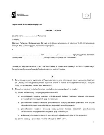 Departament Funduszy Europejskich UMOWA O DZIEŁO zawarta w dniu ……………… r. w Warszawie pomiędzy Skarbem Państwa - Ministerstwem Zdrowia z siedzibą w Warszawie, ul. Miodowa 15, 00-952 Warszawa, zwanym dalej „Zamawiającym”, reprezentowanym przez………………………………………………………….., a …………………………………………., zam. ……………….., ul. …………………., legitymującym się dowodem osobistym Nr ………………………………., zwanym dalej „Przyjmującym zamówienie”. Umowa jest współfinansowana przez Unię Europejską w ramach Europejskiego Funduszu Społecznego, Europejskiego Funduszu Rozwoju Regionalnego oraz budżet Państwa. §1 1. Zamawiający powierza wykonanie, a Przyjmujący zamówienie zobowiązuje się do wykonania ekspertyzy pn. „Koszty utraconej produktywności z powodu chorób w Polsce z uwzględnieniem wpływu na rynek pracy i na gospodarkę”, zwaną dalej „ekspertyzą”. 2. Ekspertyza powinna zostać wykonana z uwzględnieniem następujących wymogów: 1) zakres przedmiotowy - ekspertyza powinna zawierać: a. przedstawienie kosztów utraconej produktywności będącej rezultatem absencji chorobowej, z uwzględnieniem wszystkich grup chorobowych; b. przedstawienie kosztów utraconej produktywności będącej rezultatem pobierania rent z tytułu niezdolności do pracy z uwzględnieniem wszystkich grup chorobowych; c. przedstawienie kosztów utraconej produktywności będącej rezultatem przedwczesnej umieralności z uwzględnieniem wszystkich grup chorobowych; d. wskazanie jednostek chorobowych stanowiących największe obciążenie dla gospodarki. 2) zakres czasowy – ekspertyza powinna dotyczyć lat 2009 – 2011. 1 3) zakres terytorialny – ekspertyza powinna dotyczyć obszaru całej Polski. 3. Przyjmujący zamówienie zobowiązuje się do wykonania ekspertyzy zgodnie z zaakceptowaną przez Zamawiającego koncepcją realizacji ekspertyzy, o której mowa w § 2 ust. 4. §2 1. Przyjmujący zamówienie zobowiązuje się wykonać ekspertyzę w terminie do 75 dni kalendarzowych od dnia przekazania przez Zamawiającego wszystkich danych niezbędnych do realizacji przedmiotu umowy (tj. danych pochodzących od GUS, ZUS i NFZ). W przypadku przekazywania ww. danych w częściach, Zamawiający poinformuje Przyjmującego zamówienie o przekazaniu ostatniej części danych. Czas realizacji umowy będzie liczony od daty przekazania ostatniej części danych. 2. W terminie 14 dni kalendarzowych od dnia podpisania umowy Przyjmujący zamówienie zobowiązuje się przedłożyć Zamawiającemu, w formie wydruku (1 egzemplarz, druk dwustronny) oraz w formie elektronicznej (dokument Word, na płycie CD lub e-mail), koncepcję realizacji ekspertyzy, zawierającą co najmniej opis przedmiotu ekspertyzy wraz ze wskazaniem sposobu realizacji poszczególnych zadań i źródeł danych, jakie będą wykorzystane w celu jej sporządzenia, z uwzględnieniem elementów, o których mowa w § 1 ust. 2. 3. Zamawiający zastrzega sobie prawo do wniesienia ewentualnych uwag i poprawek do koncepcji realizacji ekspertyzy, o której mowa w ust. 2, w terminie 3 dni kalendarzowych od dnia jej otrzymania. 4. W terminie 3 dni kalendarzowych od dnia przekazania przez Zamawiającego uwag, o których mowa w ust. 3, Przyjmujący zamówienie przekaże Zamawiającemu poprawioną koncepcję realizacji ekspertyzy, w formach, o których mowa w ust. 2. 5. W terminie 65 dni kalendarzowych od dnia przekazania przez Zamawiającego danych niezbędnych do realizacji przedmiotu umowy, o którym mowa w ust. 1, Przyjmujący zamówienie zobowiązuje się przedłożyć Zamawiającemu, w formie wydruku (1 egzemplarz, druk dwustronny, kolorowy) oraz w formie elektronicznej (dokument Word, na płycie CD lub e-mail), wstępną wersję ekspertyzy. 6. Zamawiający zastrzega sobie prawo do wniesienia ewentualnych uwag i poprawek do wstępnej wersji ekspertyzy, o której mowa w ust. 5, w terminie 5 dni kalendarzowych od dnia jej otrzymania. 7. W terminie 5 dni kalendarzowych od dnia przekazania przez Zamawiającego uwag, o których mowa w ust. 6, Przyjmujący zamówienie przekaże Zamawiającemu poprawioną wersję ekspertyzy, w formie, o której mowa w ust. 5. 8. W terminie 5 dni roboczych od dnia dostarczenia ekspertyzy, o którym mowa w ust. 7, Strony sporządzą protokół odbioru przedmiotu umowy. 2 §3 Zamawiający ma prawo do wprowadzania, po rozpoczęciu wykonywania ekspertyzy, poprawek do zaakceptowanej koncepcji realizacji ekspertyzy, chyba że powodowałoby to konieczność poniesienia przez Przyjmującego zamówienie dodatkowych kosztów albo przekroczenia terminu jej wykonania. W takim przypadku Przyjmujący zamówienie wprowadzi zaproponowane zmiany do ekspertyzy pod warunkiem zobowiązania się Zamawiającego do poniesienia powstałych z tego powodu dodatkowych kosztów Przyjmującego zamówienie oraz zaakceptowania wydłużenia terminu jej wykonania. §4 1. Przyjmujący zamówienie oświadcza, że dostarczona przez niego ekspertyza nie narusza jakichkolwiek praw osób trzecich, zwłaszcza w zakresie przepisów o znakach towarowych, wzorach użytkowych, prawach autorskich i prawach pokrewnych oraz nieuczciwej konkurencji. Przyjmujący zamówienie ponosi pełną odpowiedzialność, gdy na skutek wykonania umowy dojdzie do naruszenia praw osób trzecich, w tym za roszczenia osób trzecich. 2. Przyjmujący zamówienie zobowiązuje się do przetwarzania danych osobowych zgodnie z ustawą z dnia 29 sierpnia 1997 r. o ochronie danych osobowych (Dz. U. z 2002 r. Nr 101, poz. 926, z późn. zm.). §5 1. Przyjmujący zamówienie zobowiązuje się do zachowania w tajemnicy wszelkich informacji uzyskanych od Zamawiającego, w związku z wykonywaniem zobowiązań wynikających z niniejszej umowy. 2. Przekazywanie, ujawnianie oraz wykorzystywanie informacji, otrzymanych przez Przyjmującego zamówienie od Zamawiającego, w szczególno