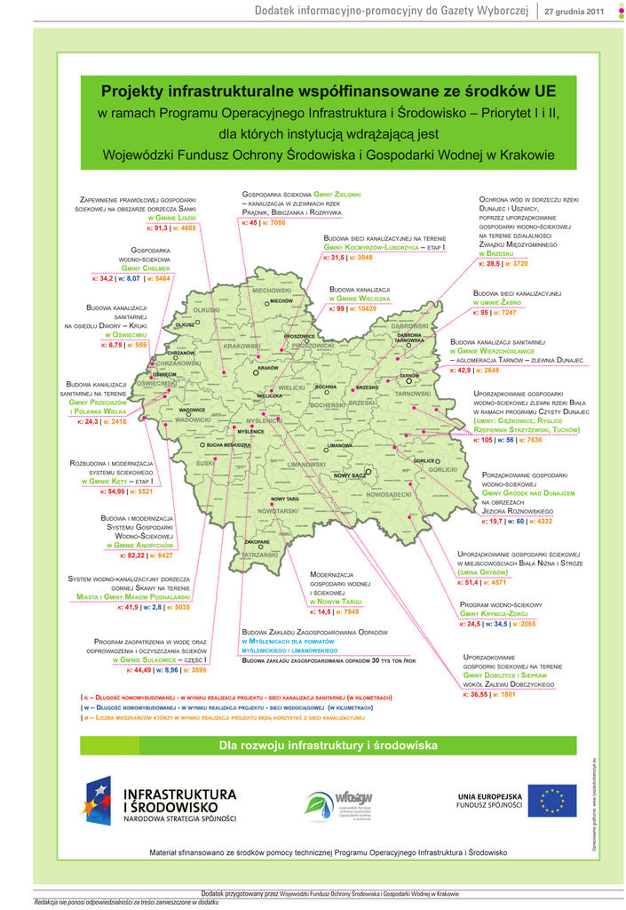 Dodatek przygotowany przez Wojewódzki Fundusz Ochrony Środowiska i Gospodarki Wodnej w Krakowie Redakcja nie ponosi odpowiedzialności za treści zamieszczone w dodatku 27 grudnia 2011 lll Dodatek informacyjno-promocyjny do Gazety Wyborczej lll Dodatek informacyjno-promocyjny do Gazety Wyborczej DLA ROZWOJU INFRASTRUKTURY I ŚRODOWISKA W MAŁOPOLSCE Wojewódzki Fundusz Ochrony Środowiska i Gospodarki Wodnej w Krakowie jest Instytucją Wdrażającą Program Operacyjny Infrastruktura i Środowisko dla projektów z zakresu gospodarki wodnościekowej – I oś priorytetowa oraz gospodarki odpadami i ochrony powierzchni ziemi – II oś priorytetowa. Obecnie podpisano 20 umów o dofinansowanie w tym 19 z zakresu gospodarki wodno-ściekowej i 1 w obszarze gospodarki odpadami. Aktualnie trwają negocjacje nad przygotowaniem kolejnej, tj. 20 umowy z zakresu gospodarki wodno-ściekowej dla zadania pn: „Budowa i Modernizacja Systemu Gospodarki Wodno-Ściekowej w Gminie Andrychów”. Łączna wartość projektów realizowanych przy współudziale Środków Funduszu Spójności, oszacowana na podstawie podpisanych z Beneficjentami umów, to około 1,2 mld zł, z czego dofinansowanie wynosi 759 158 119,96 zł. Realizacja niniejszych projektów umożliwi włączenie 97 095 mieszkańców Województwa Małopolskiego do sieci kanalizacyjnej o łącznej długości około 987 km. Wybudowana zostanie również sieć wodociągowa o długości około 169 km. Ponadto w zakresie rzeczowym przedmiotowych inwestycji przewidziano inne działania m.in. budowę i przebudowę oczyszczalni ścieków oraz modernizację sieci kanalizacyjnej i wodociągowej. W ramach II osi priorytetowej PO IiŚ obecnie wdrażany jest tylko jeden projekt pn. „Budowa Zakładu Zagospodarowania Odpadów w Myślenicach dla powiatów Myślenickiego i Limanowskiego”, który umożliwi zagospodarowanie odpadów w ilości 30 tys. ton /rok. Poniżej prezentujemy informacje dotyczące aktualnego stanu wdrażanych w Małopolsce projektów, dla których WFOŚiGW w Krakowie jest Instytucją Wdrażającą. Podane kwoty całkowite projektów i dofinansowanie przedstawiono zgodnie z zapisami umów i nie uwzględniają zmian, które wystąpiły lub wystąpią w wyniku zmniejszenia kosztów inwestycji po zakończonych postępowaniach przetargowych. 27 grudnia 2011 Beneficjent: Miejski Zakład Gospodarki Komunalnej w Chełmku Spółka z o.o. Nazwa projektu: Gospodarka wodno-ściekowa Gminy Chełmek Całkowity koszt realizacji projektu – 69 344 847,00 zł Dofinansowanie w ramach środków UE – 45 802 907,31 zł Realizacja przedsięwzięcia umożliwi udostępnienie systemu kanalizacyjnego 5464 mieszkańcom. Dotychczas wybudowano 7,38 km sieci kanalizacyjnej sanitarnej oraz zmodernizowano 3,14 km sieci wodociągowej. Termin zakończenia realizacji projektu – IV kwartał 2014 www.mzgkchelmek-projekt.pl Beneficjent: Gmina Przeciszów Nazwa projektu: Budowa kanalizacji sanitarnej na terenie Gminy Przeciszów i Polanka Wielka Całkowity koszt realizacji projektu – 24 812 137,89 zł Dofinansowanie w ramach środków UE – 11 414 345,69 zł Realizacja przedsięwzięcia umożliwi udostępnienie systemu kanalizacyjnego 2418 mieszkańcom. Trwa realizacja projektu, obecnie na terenie Gminy Przeciszów i Polanka Wielka wybudowano łącznie około 9 km sieci kanalizacji sanitarnej oraz 3 przepompownie. W tym, w Gminie Przeciszów wybudowano 7,5 km i 3 pompownie, w Gminie Polanka Wielka wybudowano 1,5 km kanalizacji. Termin zakończenia realizacji projektu – I kwartał 2013 www.przeciszow.pl Beneficjent: Miejski Zakład Wodociągów i Kanalizacji Sp. z o.o. z siedzibą w Kętach Nazwa projektu: Rozbudowa i modernizacja systemu ściekowego w Gminie Kęty - etap I Całkowity koszt realizacji projektu – 70 250744,11 zł Dofinansowanie w ramach środków UE – 43 614 306,29 zł Realizacja przedsięwzięcia umożliwi udostępnienie systemu kanalizacyjnego 5521 mieszkańcom. Trwa realizacja projektu, dotychczas zbudowano 29,8 km oraz zmodernizowano 4,6 km sieci kanalizacyjnej. Termin zakończenia realizacji projektu – II kwartał 2014 Beneficjent: Miasto Oświęcim Nazwa projektu: Budowa kanalizacji sanitarnej na osiedlu Dwory – Kruki w Oświęcimiu Całkowity koszt realizacji projektu – 7 047 748,11 zł Dofinansowanie w ramach środków UE – 3 929 238,60 zł Realizacja przedsięwzięcia umożliwi udostępnienie systemu kanalizacyjnego 959 mieszkańcom. Roboty budowlane rozpoczęto 3.10.2011 r. Dotychczas wykonano 225 m kanalizacji sanitarnej, przejście kanalizacji przez ul. Zwycięstwa oraz rozpoczęto roboty związane z przejściem przewiertami kolektorów tłocznych ścieków pod torami kolejowymi w Dworach. Termin zakończenia realizacji projektu – III kwartał 2013 www.jrp.mzwik-kety.com.pl www.um.oswiecim.pl Beneficjent: Zakład Wodociągów i Kanalizacji Sp. z. o.o. w Andrychowie Nazwa projektu: Budowa i modernizacja Systemu Gospodarki Wodno-Ściekowej w Gminie Andrychów Beneficjent: Gmina Liszki Nazwa projektu: Zapewnienie prawidłowej gospodarki ściekowej na obszarze dorzecza Sanki w Gminie Liszki Całkowity koszt realizacji projektu – 88 492 241,26 zł Dofinansowanie w ramach środków UE – 43 431 476,69 zł Realizacja przedsięwzięcia umożliwi udostępnienie systemu kanalizacyjnego 6427 mieszkańcom. Długość wybudowanej sieci kanalizacyjnej: - Roczyny – 0,9 km - Targanice – 1,5 km - Inwałd – 0,3 km Całkowity koszt realizacji projektu – 71 440 436,71 zł Dofinansowanie w ramach środków UE – 39 181 470,43 zł Realizacja przedsięwzięcia umożliwi udostępnienie systemu kanalizacyjnego 4685 mieszkańcom. Ogółem dotychczas wykonano 28,07 km kanalizacji, co łącznie stanowi 31,43 % zaawansowania prac. Umowa dofinansowania w ramach POIiŚ – w przygotowaniu Dodatek przygotowany przez Wojewódzki Fundusz Ochrony Środowiska i Gospodarki Wodnej w Krakowie Termin zakończenia realizacji projektu – I kwartał 20