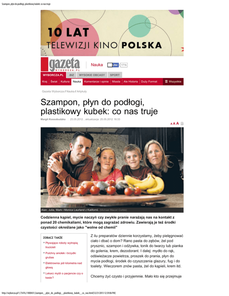 Szampon, płyn do podłogi, plastikowy kubek: co nas truje Nauka WYBORCZA.PL Kraj Świat .BIZ Kultura WYSOKIE OBCASY Nauka Komentarze i opinie Like 171k SPORT Miasta Ale Historia Duży Format Wszystkie Gazeta Wyborcza / Nauka / Artykuły Szampon, płyn do podłogi, plastikowy kubek: co nas truje Margit Kossobudzka 25.05.2012 , aktualizacja: 25.05.2012 16:33 AA A Alan, Julia, Mark i Monica Laurland z Kalifornii. (Michael Macor/ Corbis) Codzienna kąpiel, mycie naczyń czy zwykłe pranie narażają nas na kontakt z ponad 20 chemikaliami, które mogą zagrażać zdrowiu. Zawierają je też środki czystości określane jako "wolne od chemii" ZOBACZ TAKŻE Pływające roboty wytropią trucicieli Pulchny aniołek i brzydki grubas Elektrownia pół kilometra nad głową Lekarz myśli o pacjencie czy o kasie? Z ilu preparatów dziennie korzystamy, żeby pielęgnować ciało i dbać o dom? Rano pasta do zębów, żel pod prysznic, szampon i odżywka, tonik do twarzy lub pianka do golenia, krem, dezodorant. I dalej: mydło do rąk, odświeżacze powietrza, proszek do prania, płyn do mycia podłogi, środek do czyszczenia glazury, fug i do toalety. Wieczorem znów pasta, żel do kąpieli, krem itd. Chcemy żyć czysto i przyjemnie. Mało kto się przejmuje http://wyborcza.pl/1,75476,11800431,Szampon__plyn_do_podlogi__plastikowy_kubek__co_nas.html[12/21/2013 12:59:06 PM] Szampon, płyn do podłogi, plastikowy kubek: co nas truje Profesor z Poznania odkrył, że Polacy mają kiepską spermę Mężczyźni nie wyginą tym, że przy okazji nasze ciało wchodzi w kontakt z co najmniej 20 substancjami potencjalnie zagrażającymi zdrowiu - różnymi parabenami, ftalanami, bifenylami. Na ich temat toczy się jednak na świecie coraz bardziej burzliwa dyskusja - trwa spór o to, czy i jak nam szkodzą. Ich stężenia w środowisku są za niskie argumentują sceptycy. Ale za to są one wszędzie odpowiadają zaniepokojeni naukowcy. Bo coraz więcej wskazuje na to, że ta ogromna ilość związków chemicznych trafiających do środowiska zaburza pracę ludzkiego układu hormonalnego. W ubiegłym roku osiem organizacji zajmujących się zdrowiem - zrzeszające m.in. ginekologów, genetyków, endokrynologów - wystosowało na łamach tygodnika "Science" apel o jak najszybsze wprowadzenie regulacji prawnych, które utrzymałyby w ryzach to chemiczne zanieczyszczenie. Miesiąc temu odezwało się również Brytyjskie Towarzystwo Endokrynologiczne - najstarsza i największa organizacja zajmująca się zdrowiem hormonalnym. W specjalnym oświadczeniu szefowie tej instytucji wyrazili rozczarowanie, że Amerykańska Agencja ds. Leków zlekceważyła wpływ na zdrowie związku zwanego bisfenolem A. Można go znaleźć niemal wszędzie, m.in. w plastikowych butelkach, płytach kompaktowych, a nawet w plombach dentystycznych. Wyniki badań pokazują, że może wpływać na rozwój dziecka , jego odporność, a nawet sprzyjać powstawaniu niektórych nowotworów. Niewiele robi różnicę Termin "endocrinie disruptors", który można przetłumaczyć jako "hormonalne zaburzacze", pojawił się dopiero na początku lat 90. ubiegłego wieku podczas jednej z konferencji naukowych. Opisywał on związki chemiczne, które są bardzo podobne do cząsteczek naturalnych hormonów, przez co zaburzają pracę organizmu. Hormony są esencją naszego funkcjonowania, kontrolują m.in. sen, poczucie zagrożenia, wagę ciała, nastrój, płodność. Sterują setkami reakcji bezpośrednio lub na zasadzie reakcji łańcuchowej - jeden hormon pobudza drugi itd. Muszą pracować w idealnej równowadze. Brak któregokolwiek z nich, nadmiar czy niedomiar, powoduje w ciele ogromne zmiany, choroby, czasem śmierć. Jak to z esencją bywa, zazwyczaj potrzeba jej niewiele, http://wyborcza.pl/1,75476,11800431,Szampon__plyn_do_podlogi__plastikowy_kubek__co_nas.html[12/21/2013 12:59:06 PM] Szampon, płyn do podłogi, plastikowy kubek: co nas truje ale to niewiele robi wielką różnicę. Wiadomo na przykład, że maleńkie zmiany w poziomie hormonów bardzo wpływają na rozwój płodu. Dziennik "The New York Times" niedawno przypomniał historię trojaczków dwóch sióstr bliźniaczek rozwijających się w łonie mamy razem z bratem. Pod wpływem produkowanych przez męski płód hormonów bliźniaczki zostały zmaskulinizowane. Lekarze twierdzą, że jak dorosną, mogą zachowywać się nieco bardziej agresywnie i ryzykownie niż kobiety, które rozwijały się bez kontaktu z męskimi hormonami. Za to mniej im grożą zaburzenia w odżywianiu się. Ten cudowny plastik? Lista hormonalnych zaburzaczy wciąż rośnie. Jedne są powszechne i bardzo rozproszone w środowisku. Mogą kumulować się w organizmach żywych i być transportowane na duże odległości. Są dość trwałe i można je znaleźć w wielu rejonach świata, nawet w okolicach bieguna północnego. Inne są łatwo i szybko degradowalne. Te są bezpieczniejsze. Na czarnej liście podawanej przez Towarzystwo Endokrynologiczne znajdują się m.in. związki powszechnie wykrywane u ludzi: DDT, polichlorowane bifenyle (PCB), bisfenol A (BPA), polibromowane etery difenylowe (PBDE's) oraz rozmaite ftalany. Należą one do różnych klas związków chemicznych. Wytwarza je głównie przemysł, także farmaceutyczny. Znajdują się w jedzeniu w puszkach, kosmetykach, plastiku i opakowaniach żywności, kwitach drukowanych przez bankomaty . Są w lekach i pestycydach. Można je znaleźć w twojej krwi i moczu, a także w mleku matki i krwi pępowinowej płodu. Większość jest syntetyczna, ale niektóre znajdują w naturalnych substancjach pochodzenia roślinnego. Według Towarzystwa Endokrynologicznego dowodów na szkodliwość wymienionych substancji jest wystarczająco dużo. Zaburzają pracę tarczycy, hormonów neuroendokrynnych i mających związek z układem krwionośnym. Przyczyniają się do otyłości i chorób metabolicznych, wpływają na zarządzanie glukozą i insuliną, osł