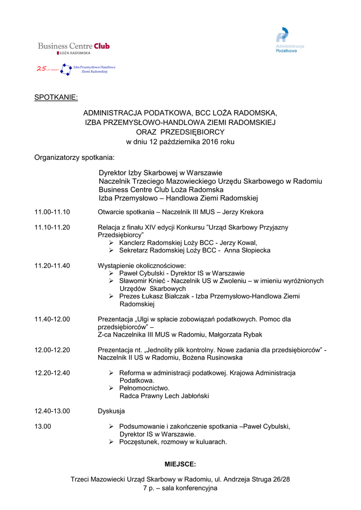 SPOTKANIE: ADMINISTRACJA PODATKOWA, BCC LOŻA RADOMSKA, IZBA PRZEMYSŁOWO-HANDLOWA ZIEMI RADOMSKIEJ ORAZ PRZEDSIĘBIORCY w dniu 12 października 2016 roku Organizatorzy spotkania: Dyrektor Izby Skarbowej w Warszawie Naczelnik Trzeciego Mazowieckiego Urzędu Skarbowego w Radomiu Business Centre Club Loża Radomska Izba Przemysłowo – Handlowa Ziemi Radomskiej 11.00-11.10 Otwarcie spotkania – Naczelnik III MUS – Jerzy Krekora 11.10-11.20 Relacja z finału XIV edycji Konkursu ”Urząd Skarbowy Przyjazny Przedsiębiorcy” Kanclerz Radomskiej Loży BCC - Jerzy Kowal, Sekretarz Radomskiej Loży BCC - Anna Słopiecka 11.20-11.40 Wystąpienie okolicznościowe: Paweł Cybulski - Dyrektor IS w Warszawie Sławomir Knieć - Naczelnik US w Zwoleniu – w imieniu wyróżnionych Urzędów Skarbowych Prezes Łukasz Białczak - Izba Przemysłowo-Handlowa Ziemi Radomskiej 11.40-12.00 Prezentacja „Ulgi w spłacie zobowiązań podatkowych. Pomoc dla przedsiębiorców” – Z-ca Naczelnika III MUS w Radomiu, Małgorzata Rybak 12.00-12.20 Prezentacja nt. „Jednolity plik kontrolny. Nowe zadania dla przedsiębiorców” Naczelnik II US w Radomiu, Bożena Rusinowska 12.20-12.40 12.40-13.00 13.00 Reforma w administracji podatkowej. Krajowa Administracja Podatkowa. Pełnomocnictwo. Radca Prawny Lech Jabłoński Dyskusja Podsumowanie i zakończenie spotkania –Paweł Cybulski, Dyrektor IS w Warszawie. Poczęstunek, rozmowy w kuluarach. MIEJSCE: Trzeci Mazowiecki Urząd Skarbowy w Radomiu, ul. Andrzeja Struga 26/28 7 p. – sala konferencyjna