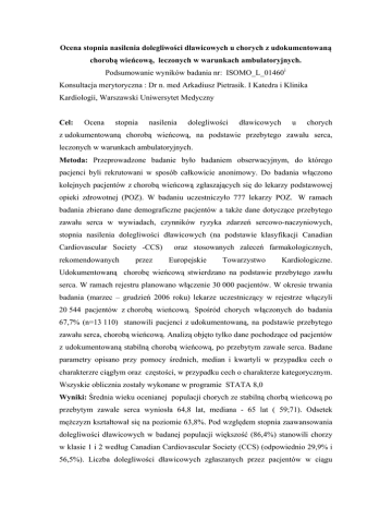 Ocena stopnia nasilenia dolegliwości dławicowych u chorych z udokumentowaną chorobą wieńcową, leczonych w warunkach ambulatoryjnych. Podsumowanie wyników badania nr: ISOMO_L_01460 i Konsultacja merytoryczna : Dr n. med Arkadiusz Pietrasik. I Katedra i Klinika Kardiologii, Warszawski Uniwersytet Medyczny Cel: Ocena stopnia nasilenia dolegliwości dławicowych u chorych z udokumentowaną chorobą wieńcową, na podstawie przebytego zawału serca, leczonych w warunkach ambulatoryjnych. Metoda: Przeprowadzone badanie było badaniem obserwacyjnym, do którego pacjenci byli rekrutowani w sposób całkowicie anonimowy. Do badania włączono kolejnych pacjentów z chorobą wieńcową zgłaszających się do lekarzy podstawowej opieki zdrowotnej (POZ). W badaniu uczestniczyło 777 lekarzy POZ. W ramach badania zbierano dane demograficzne pacjentów a także dane dotyczące przebytego zawału serca w wywiadach, czynników ryzyka zdarzeń sercowo-naczyniowych, stopnia nasilenia dolegliwości dławicowych (na podstawie klasyfikacji Canadian Cardiovascular Society -CCS) rekomendowanych przez oraz stosowanych zaleceń farmakologicznych, Europejskie Towarzystwo Kardiologiczne. Udokumentowaną chorobę wieńcową stwierdzano na podstawie przebytego zawłu serca. W ramach rejestru planowano włączenie 30 000 pacjentów. W okresie trwania badania (marzec – grudzień 2006 roku) lekarze uczestniczący w rejestrze włączyli 20 544 pacjentów z chorobą wieńcową. Spośród chorych włączonych do badania 67,7% (n=13 110) stanowili pacjenci z udokumentowaną, na podstawie przebytego zawału serca, chorobą wieńcową. Analizą objęto tylko dane pochodzące od pacjentów z udokumentowaną stabilną chorobą wieńcową, po przebytym zawale serca. Badane parametry opisano przy pomocy średnich, median i kwartyli w przypadku cech o charakterzre ciągłym oraz częstości, w przypadku cech o charakterze kategorycznym. Wszyskie oblicznia zostały wykonane w programie STATA 8,0 Wyniki: Średnia wieku ocenianej populacji chorych ze stabilną chorbą wieńcową po przebytym zawale serca wyniosła 64,8 lat, mediana - 65 lat ( 59;71). Odsetek mężczyzn kształtował się na poziomie 63,8%. Pod względem stopnia zaawansowania dolegliwości dławicowych w badanej populacji większość (86,4%) stanowili chorzy w klasie 1 i 2 według Canadian Cardiovascular Society (CCS) (odpowiednio 29,9% i 56,5%). Liczba dolegliwości dławicowych zgłaszanych przez pacjentów w ciągu tygodnia wyniosła: 2 (1,3) - mediana. Stopień nasilenia dolegliwości dławicowych wykazywał zależność z klasą CCS. Tygodniowa liczba dawek doraźnie stoswanego azotanu z powodu dolegliwości dławicowych w przeliczeniu na jednego pacjenta wynosiła: 3,5 - średnia, 2 (1;4) –mediana -. Częstość przepisywania preparatów z grupy betaadrenlityków, inhibitorów konwertazy angiotensyny, statyn oraz leków przeciwpłytkowych wyniosła odpowiednio 77,8%, 83,9%, 71,6% oraz 71,2%. Wnioski: Pomimo postępu w zakresie leczenia choroby wieńcowej skuteczność prewencji wtórnej u chorych leczonych w warunkach ambulatoryjnych nadal pozostaje na niezadowalającym poziomie, o czym świadczy wysoka częstość występowania dolegliwości dławicowych. i Badanie sponsorowane przez Sanofi-Aventis Sp. z o.o.