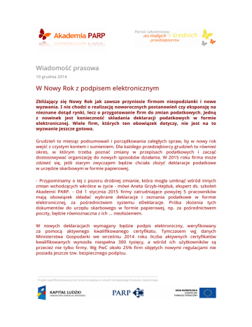 Wiadomość prasowa 10 grudnia 2014 W Nowy Rok z podpisem elektronicznym Zbliżający się Nowy Rok jak zawsze przyniesie firmom niespodzianki i nowe wyzwania. I nie chodzi o realizację noworocznych postanowień czy ekspansję na nieznane dotąd rynki, lecz o przygotowanie firm do zmian podatkowych. Jedną z nowinek jest konieczność składania deklaracji podatkowych w formie elektronicznej. Wiele firm, których ten obowiązek dotyczy, nie jest na to wyzwanie jeszcze gotowa. Grudzień to miesiąc podsumowań i porządkowania zaległych spraw, by w nowy rok wejść z czystym kontem i sumieniem. Dla każdego przedsiębiorcy grudzień to również okres, w którym trzeba poznać zmiany w przepisach podatkowych i zacząć dostosowywać organizację do nowych sposobów działania. W 2015 roku firma może zdziwić się, jeśli starym zwyczajem będzie chciała złożyć deklaracje podatkowe w urzędzie skarbowym w formie papierowej. - Przypominamy o tej z pozoru drobnej zmianie, która mogła umknąć wśród innych zmian wchodzących wkrótce w życie - mówi Aneta Grzyb-Hejduk, ekspert ds. szkoleń Akademii PARP. - Od 1 stycznia 2015 firmy zatrudniające powyżej 5 pracowników mają obowiązek składać wybrane deklaracje i zeznania podatkowe w formie elektronicznej, za pośrednictwem systemu eDeklaracje. Próba złożenia tych dokumentów do urzędu skarbowego w formie papierowej, np. za pośrednictwem poczty, będzie równoznaczna z ich ... niezłożeniem. W nowych deklaracjach wymagany będzie podpis elektroniczny, weryfikowany za pomocą aktywnego kwalifikowanego certyfikatu. Tymczasem wg danych Ministerstwa Gospodarki we wrześniu 2014 roku liczba aktywnych certyfikatów kwalifikowanych wynosiła niespełna 300 tysięcy, a wśród ich użytkowników są przecież nie tylko firmy. Wg PwC około 25% firm objętych nowymi regulacjami nie posiada jeszcze tzw. bezpiecznego podpisu. Projekt współfinansowany przez Unię Europejską w ramach Europejskiego Funduszu Społecznego Dla nieprzygotowanych do składania elektronicznych deklaracji Akademia PARP udostępniła pigułkę wiedzy, w której wyjaśniamy, kogo obejmuje nowy obowiązek i które dokumenty muszą być składane w takiej formie. Warto wiedzieć, że konieczność zachowania formy elektronicznej dotyczy wyłącznie formularzy przesyłanych do urzędu skarbowego. Pracownikom możemy więc wręczyć lub przesłać tradycyjne, papierowe PITy. W Akademii PARP trwają już prace nad aktualizacją szkoleń podatkowych i prawnych. Tymczasem zachęcamy do zapoznania się z pigułką wiedzy dotyczącą elektronicznych deklaracji. Pigułki są dostępne na portalu www.akademiaprp.gov.pl dla wszystkich, również niezalogowanych użytkowników. Każdy może więc w kilka minut przyjąć nową porcję wiedzy. Na portalu mamy już ponad 400 pigułek, prezentujących różne aspekty wiedzy biznesowej. Stanowią one zachętę i wstęp do przejścia poważniejszych szkoleń e-learningowych. Zalogowani uczestnicy Akademii PARP mogą korzystać łącznie z 46 szkoleń e-learning oraz 45 szkoleń mobilnych. W bezpłatnych szkoleniach mogą brać udział wszyscy przedsiębiorcy i pracownicy sektora MŚP oraz osoby planujące rozpoczęcie własnej działalności gospodarczej. Projekt jest realizowany na zlecenie Polskiej Agencji Rozwoju Przedsiębiorczości i współfinansowany ze środków UE w ramach Europejskiego Funduszu Społecznego. kontakt: [email protected] Infolinia 801 444 MSP (czyli 801 444 677) Projekt współfinansowany przez Unię Europejską w ramach Europejskiego Funduszu Społecznego
