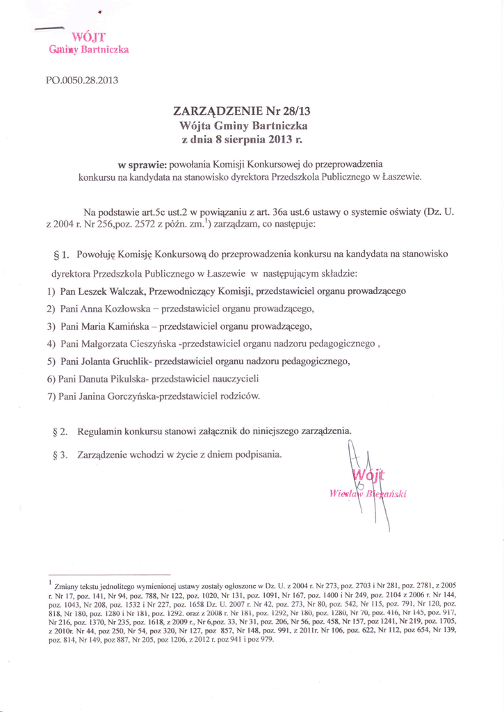 konkursu na kandydata na stanowisko dyrektora Ptzedszkola Pubłicznęgo w Łaszewie.