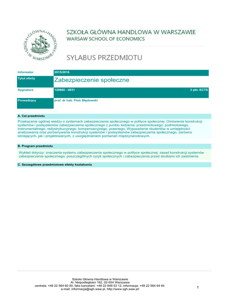 Informator 2015/2016 7\WXáRIHUW\ =DEH]SLHF]HQLHVSRáHF]QH Sygnatura 120660 - 0031 3URZDG]ąF\ SURIGUKDE3LRWU%áĊGRZVNL 3 pkt. ECTS A. Cel przedmiotu 3U]HND]DQLHRJyOQHMZLHG]\RV\VWHPDFK]DEH]SLHF]HQLDVSRáHF]QHJRZSROLW\FHVSRáHF]QHM2PyZLHQLHNRQVWUXNFML V\VWHPyZLSRGV\VWHPyZ]DEH]SLHF]HQLDVSRáHF]QHJR]SXQNWXZLG]HQLDSU]HGPLRWRZHJRSRGPLRWRZHJR LQVWUXPHQWDOQHJRUHG\VWU\EXF\MQHJRNRPSHQVDF\MQHJRSUDZQHJR:\SRVDĪHQLHVWXGHQWyZZXPLHMĊWQRĞFL DQDOL]RZDQLDRUD]SRUyZQ\ZDQLDNRQVWUXNFMLV\VWHPyZLSRGV\VWHPyZ]DEH]SLHF]HQLDVSRáHF]QHJR]DUyZQR LVWQLHMąF\FKMDNLSURMHNWRZDQ\FK]XZ]JOĊGQLHQLHPSRUyZQDĔPLĊG]\QDURGRZ\FK B. Program przedmiotu :\NáDGGRW\F]\]QDF]HQLDV\VWHPX]DEH]SLHF]HQLDVSRáHF]QHJRZSROLW\FHVSRáHF]QHM]DVDGNRQVWUXNFMLV\VWHPyZ ]DEH]SLHF]HQLDVSRáHF]QHJRSRV]F]HJyOQ\FKU\]\NVSRáHF]Q\FKL]DEH]SLHF]HQLDSU]HGVNXWNDPLLFK]DLVWQLHQLD &6]F]HJyáRZHSU]HGPLRWRZHHIHNW\NV]WDáFHQLD 6]NRáD*áyZQD+DQGORZDZ:DUV]DZLH $O1LHSRGOHJáRĞFL162, 02-554 Warszawa centrala: +48 22 564 60 00, faks kancelarii: +48 22 849 53 12, informacja: +48 22 564 64 64 e-mail: [email protected], http://www.sgh.waw.pl/ 1 FG=DEH]SLHF]HQLHVSRáHF]QH Wiedza 6WXGHQWX]\VNDZLHG]ĊR 1]DU]ąG]DQLXU\]\NLHPVSRáHF]Q\PL]QDF]HQLXEH]SLHF]HĔVWZDVRFMDOQHJRZ ]UyZQRZDĪRQ\PUR]ZRMX 2]DVDGDFKNRQVWUXNFMLV\VWHPX]DEH]SLHF]HQLDVSRáHF]QHJR 3]DVDGDFKLĨUyGáDFKILQDQVRZDQLDV\VWHPX]DEH]SLHF]HQLDVSRáHF]QHJR 4RUJDQL]DFMLLIXQNFMRQRZDQLDSRV]F]HJyOQ\FKSRGV\VWHPyZ]DEH]SLHF]HQLDVSRáHF]QHJR 5XG]LDOHZV\VWHPLH]DEH]SLHF]HQLDVSRáHF]QHJRUR]ZLą]DĔSXEOLF]QRSU\ZDWQ\FK 6. uwarunkowaniach demograficznych i finansowych reformowania systemów zabezpieczenia VSRáHF]QHJR 7NLHUXQNDFK]PLDQZV\VWHPLH]DEH]SLHF]HQLDVSRáHF]QHJRLPHWRG]LHRWZDUWHMNRRUG\QDFML V\VWHPyZ]DEH]SLHF]HQLDVSRáHF]QHJRZ8( 8PLHMĊWQRĞFL Kompetencje VSRáHF]QH 6WXGHQWSRZLQLHQXPLHü 1Z\MDĞQLüSRMĊFLDU\]\NDVSRáHF]QHJRLEH]SLHF]HĔVWZDVRFMDOQHJR 2RSLVDüHOHPHQW\NRQVWUXNF\MQHV\VWHPX]DEH]SLHF]HQLDVSRáHF]QHJR 3RSLVDüSRV]F]HJyOQHSRGV\VWHP\]DEH]SLHF]HQLDVSRáHF]QHJR 4Z\MDĞQLü]QDF]HQLHSDĔVWZDZRUJDQL]DFMLV\VWHPX]DEH]SLHF]HQLDVSRáHF]QHJRRUD]XG]LDá ZV\VWHPLHUR]ZLą]DĔSXEOLF]QRSU\ZDWQ\FK 5RSLVDüXZDUXQNRZDQLDGHPRJUDILF]QHLILQDQVRZH]PLDQZV\VWHPDFK]DEH]SLHF]HQLD VSRáHF]QHJR 6ZVND]DüQDMEDUG]LHMSRĪąGDQHNLHUXQNL]PLDQZV\VWHPLH]DEH]SLHF]HQLDVSRáHF]QHJR] XZ]JOĊGQLHQLHRWZDUWHMNRRUG\QDFMLV\VWHPyZ]DEH]SLHF]HQLDVSRáHF]QHJRZ8( Student powinien: 1GRFHQLDüEH]SLHF]HĔVWZRVRFMDOQHMDNRZDUWRĞüVSRáHF]Qą 2E\üĞZLDGRP\NRQLHF]QRĞFL]PLDQZV\VWHPLH]DEH]SLHF]HQLDVSRáHF]QHJRSU]\]DFKRZDQLX VROLGDU\]PXVSRáHF]QHJRZMHJRRUJDQL]DFMLLIXQNFMRQRZDQLX 6]NRáD*áyZQD+DQGORZDZ:DUV]DZLH $O1LHSRGOHJáRĞFL162, 02-554 Warszawa centrala: +48 22 564 60 00, faks kancelarii: +48 22 849 53 12, informacja: +48 22 564 64 64 e-mail: [email protected], http://www.sgh.waw.pl/ 2 FG=DEH]SLHF]HQLHVSRáHF]QH '6HPHVWUDOQ\SODQ]DMĊü 1 6\VWHP]DEH]SLHF]HQLDVSRáHF]QHJRZSROLW\FHVSRáHF]QHM]DNUHVSROLW\NLVSRáHF]QHMDFHOH ]DEH]SLHF]HQLDVSRáHF]QHJRSRMĊFLDU\]\NDVSRáHF]QHJRLEH]SLHF]HĔVWZDVRFMDOQHJR 2 'HILQLFMHV\VWHPX]DEH]SLHF]HQLDVSRáHF]QHJRDVSHNW\V\VWHPX]DEH]SLHF]HQLDVSRáHF]QHJR 3 Zabezpieczenie zdrowotne. 4 Zabezpieczenie zdrowotne - kierunki zmian w systemach ochrony zdrowia. 5 Zabezpieczenie emerytalne. 6 Zabezpieczenie emerytalne - kierunki zmian w systemach emerytalnych. 7 6\VWHPXEH]SLHF]HQLDVSRáHF]QHJRV\VWHP\SUDFRZQLF]\UROQLF]\PXQGXURZ\ 8 6\VWHPXEH]SLHF]HQLDVSRáHF]QHJRNLHUXQNL]PLDQZV\VWHPLH 9 =DEH]SLHF]HQLHSLHOĊJQDF\MQH 10 3RMĊFLHGRXEH]SLHF]HQLDVSRáHF]QHJR 11 5R]ZLą]DQLDSXEOLF]QRSU\ZDWQHZV\VWHPLH]DEH]SLHF]HQLDVSRáHF]QHJR 12 3RPRFVSRáHF]QD]DGDQLDLMHMRUJDQL]DFMDILQDQVRZDQLHĞZLDGF]HĔSRPRF\VSRáHF]QHM 13 =DEH]SLHF]HQLHVSRáHF]QHZ8QLL(XURSHMVNLHMPHWRGDRWZDUWHMNRRUG\QDFML 14 =DEH]SLHF]HQLHVSRáHF]QHVWDQGDUG\PLĊG]\QDURGRZHDUR]ZLą]DQLDSROVNLH 15 '\VNXVMDLSRGVXPRZDQLHZ\NáDGX (/LWHUDWXUDSRGVWDZRZDRERZLą]NRZHSRGUĊF]QLNL 76]XPOLF]8EH]SLHF]HQLHVSRáHF]QH7HRULDGODSUDNW\NL%UDQWD%\GJRV]F]:DUV]DZD )/LWHUDWXUDX]XSHáQLDMąFD -3LRWURZVNL=DEH]SLHF]HQLHVSRáHF]QH3UREOHPDW\NDLPHWRG\.L::DUV]DZD1966;6\VWHPXEH]SLHF]HĔ VSRáHF]Q\FK=DJDGQLHQLDSRGVWDZRZHUHG*6]SRU/H[LV1H[LV:DUV]DZD2009*8ĞFLĔVNDĝZLDGF]HQLD] ]DEH]SLHF]HQLDVSRáHF]QHJRZUHJXODFMDFKPLĊG]\QDURGRZ\FKLSROVNLFK6WXGLXPSRUyZQDZF]H,3L66:DUV]DZD 2005. *1DMZDĪQLHMV]HSXEOLNDFMHDXWRUDyZGRW\F]ąFHSURSRQRZDQ\FK]DMĊü /RNDOQDSROLW\NDVSROHF]QDZREHFOXG]LVWDU\FK6*+:DUV]DZD3RPRFVSRáHF]QDZ3ROVFHLZ8QLL(XURSHMVNLHM Z6\VWHP]DEH]SLHF]HQLDVSRáHF]QHJRSRSU]\VWąSLHQLX3ROVNLGR8QLL(XURSHMVNLHMUHG.*áąELFND03LHU]FKDOVND PTPS, PSUS, Radom 2003 H. Sygnatury wymaganych prerekwizytów QLHVąZ\PDJDQH 6]NRáD*áyZQD+DQGORZDZ:DUV]DZLH $O1LHSRGOHJáRĞFL162, 02-554 Warszawa centrala: +48 22 564 60 00, faks kancelarii: +48 22 849 53 12, informacja: +48 22 564 64 64 e-mail: [email protected], http://www.sgh.waw.pl/ 3 FG=DEH]SLHF]HQLHVSRáHF]QH ,:\PLDULIRUPD]DMĊü Stacj. Sob. niedz. 3RSRáXG 2JyáHP 30 22 30 :\NáDG 30 16 30 - 6 - 3UDFDVDPRG]LHOQDSRGNRQWUROą Z\NáDGRZF\ -(OHPHQW\RFHQ\NRĔFRZHM egzamin testowy 80% egzamin ustny 20% .:\PDJDQD]QDMRPRĞüMĊ]\NDREFHJR nie jest wymagana L. Kryteria selekcji .ROHMQRĞü]JáRV]HĔ 00HWRG\SURZDG]HQLD]DMĊü kejsy dyskusje 6]NRáD*áyZQD+DQGORZDZ:DUV]DZLH $O1LHSRGOHJáRĞFL162, 02-554 Warszawa centrala: +48 22 564 60 00, faks kancelarii: +48 22 849 53 12, informacja: +48 22 564 64 64 e-mail: [email protected], http://www.sgh.waw.pl/ 4
