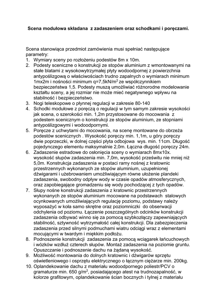 Scena modułowa składana z zadaszeniem oraz schodkami i poręczami. Scena stanowiąca przedmiot zamówienia musi spełniać następujące parametry: 1. Wymiary sceny po rozłożeniu podestów 8m x 10m. 2. Podesty sceniczne o konstrukcji ze stopów aluminium z wmontowanymi na stałe blatami z wysokowytrzymałej płyty wodoodpornej z powierzchnia antypoślizgową o właściwościach trudno zapalnych o wymiarach minimum 1mx2m i nośności minimum q=7,5kN/m2 ze współczynnikiem bezpieczeństwa 1,5. Podesty muszą umożliwiać różnorodne modelowanie kształtu sceny, a jej rozmiar nie może mieć negatywnego wpływu na stabilność i bezpieczeństwo. 3. Nogi teleskopowe o płynnej regulacji w zakresie 80-140 4. Schodki modułowe z poręczą o regulacji w tym samym zakresie wysokości jak scena, o szerokości min. 1,2m przystosowane do mocowania z podestem scenicznym o konstrukcji ze stopów aluminium, ze stopniami antypoślizgowymi i wodoodpornymi. 5. Poręcze z uchwytami do mocowania, na scenę montowane do obrzeża podestów scenicznych . Wysokość poręczy min. 1,1m, u góry poręczy dwie poprzeczki, w dolnej części płyta odbojowa wys. min. 11cm. Długość pojedynczego elementu maksymalnie 2,0m. Łączna długość poręczy 24m. 6. Zadaszenie estradowe do osłonięcia sceny o wymiarach 8mx10x. wysokość słupów zadaszenia min. 7,0m, wysokość prześwitu nie mniej niż 5,0m. Konstrukcja zadaszenia w postaci ramy nośnej z kratownic przestrzennych wykonanych ze stopów aluminium, uzupełnionej dźwigarami i użebrowaniem umożliwiającym równe ułożenie plandeki zadaszenia, swobodny odpływ wody w czasie opadów atmosferycznych, oraz zapobiegające gromadzeniu się wody pochodzącej z tych opadów. 7. Słupy nośne konstrukcji zadaszenia z kratownic przestrzennych wykonanych ze stopów aluminium mocowane na podstawach stalowych ocynkowanych umożliwiających regulację poziomu, podstawy należy wyposażyć w koła samo skrętne oraz poziomniczki do obserwacji odchylenia od poziomu. Łączenie poszczególnych odcinków konstrukcji zadaszenia odbywać winno się za pomocą szybkozłączy zapewniających stabilność, sztywność wytrzymałość całej konstrukcji. Dla zabezpieczenia zadaszenia przed silnymi podmuchami wiatru odciągi wraz z elementami mocującymi w twardym i miękkim podłożu. 8. Podnoszenie konstrukcji zadaszenia za pomocą wciągarek łańcuchowych i wózków wzdłuż czterech słupów. Montaż zadaszenia na poziomie gruntu. Opuszczanie i podnoszenie dachu na żądaną wysokość. 9. Możliwość montowania do dolnych kratownic i dźwigarów sprzętu oświetleniowego i osprzętu elektrycznego o łącznym ciężarze min. 200kg. 10. Oplandekowanie dachu z materiału wodoodpornego poliestr/PCV o gramaturze min. 650 g/m2, posiadającego atest na trudnozapalność, w kolorze grafitowym, oplandekowanie ścian bocznych i tylnej z materiału wodoodpornego poliestr/PCV przepuszczającego powietrze, posiadającego atest na trudnozapalność, w kolorze do uzgodnienia z zamawiającym. 11. Wymaganymi elementami dostawy są pokrowce (nosidła) do pokrycia i osłon, odciągi, sznury gumowe i pasy do mocowania pokrycia i osłon, skrzynka narzędziowa do montażu z zapasowymi elementami mocującymi (min. po jednym rodzaju elementu mocującego), klucz do poziomowania podstaw, 12. Najdłuższy element konstrukcji nie może przekraczać długości 3,5m. 13. Konstrukcja sceny wraz z zadaszeniem winna umożliwiać szybki i łatwy montaż i demontaż całości konstrukcji przez cztery osoby w maksymalnym czasie 4 godz., bez konieczności użycia rusztowań, dźwigów specjalistycznych narzędzi. 14. Gwarancja minimum 36 miesięcy. 15. Czas reakcji serwisowej maksimum 5 dni, 16. Odpłatny serwis pogwarancyjny i dostawa części zamiennych prze minimum 10 lat.