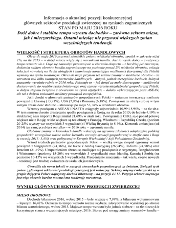 Informacja o aktualnej pozycji konkurencyjnej głównych sektorów produkcji zwierzęcej na rynkach zagranicznych STAN PO MAJU 2016 ROKU Dość dobre i stabilne tempo wzrostu dochodów – zarówno sektora mięsa, jak i mleczarskiego. Ostatni miesiąc nie przynosi większych zmian wcześniejszych tendencji. WIELKOŚĆ I STRUKTURA OBROTÓW HANDLOWYCH Okres do maja 2016 przynosi niewielkie zmiany wielkości obrotów; spadek w zakresie niżej 1%, na tle 2015 – w dużej mierze wiąże się z warunkami handlu. Jest to wynik dobry – zważywszy tempo wzrostu ub.r. Daje się zauważyć przesunięcie w kierunku eksportu – z bardziej już znacznym, dodatnim saldem obrotów handlu zagranicznego na poziomie ponad 2% wielkości obrotów; relacja taka jest nowością na tle lat ubiegłych i znamionuje narastające możliwości (korzystnej dla Polski) wymiany na rynku światowym. Okres do maja przynosi też istotne zmiany w strukturze obrotów – ze wzrostem roli kilku istotnych partnerów handlowych – dużych, jednak szczególnie średnich, których znaczenie wyraźnie rośnie w 2016 roku. Pokazuje to – jak dotąd za mało dostrzegane – możliwości dostosowania do realiów rynku światowego oraz szanse wzrostu niezależności gospodarczej Polski; w dużym stopniu związane z otwarciem na rynki azjatyckie – daleko wykraczającym poza ASEAN, ale też z dużymi zmianami struktury powiązań europejskich. Jeśli chodzi o głównych partnerów gospodarczych Polski – zmianom towarzyszy nasilenie powiązań z Ukrainą (13,91%), USA (7,9%) i Rumunią (6,18%). Powiązania ze strefą euro są w tym samym czasie dość stabilne – stanowiąc po maju 53,14% w strukturze obrotów. Wzrosty powiązań z ASEAN i NAFTA osiągnęły odpowiednio 10,99 i 5,95% – na tle ub.r. W tym samym okresie drastycznie spadły powiązania z Rosją, na tle roku 2015; do ledwie 4,19% w strukturze; nasz import z Rosji zmalał 21,69% w skali roku. Powiązania z ChRL są o ponad połowę większe niż z Rosją; wiele większe są też obroty z Francją, Włochami i Republiką Czeską (poziom 20-25% wyższy we wszystkich 3 wypadkach) i Wielką Brytanią (o 8-9%). Kierunek zmian jest (od 2014) ten sam; przybiera on tylko – w 2016 roku – ogromnie na sile. Globalne zmiany w kierunkach handlu wskazują na ogromne zdolności adaptacyjne polskiej gospodarki; szczególnie ważne wobec kierunku rozwoju sytuacji gospodarczej w strefie euro i Rosji (z recesją 2015: 3,4%) oraz politycznej w Europie Wschodniej i Azji Południowo-Zachodniej. Wśród średnich partnerów gospodarczych Polski – wielką uwagę skupiał ogromny wzrost powiązań z Singapurem (74,36%), ale także z Arabią Saudyjską (26,94%), Indiami (24,58%) oraz Izraelem (21,49%). Uzupełnieniem obrazu są nasilające się powiązania z Argentyną, Bangladeszem i Wietnamem (poziomy 15-20% we wszystkich 3 wypadkach) oraz Irlandią, Kanadą i Serbią (na poziomie 10-15% we wszystkich 3 wypadkach). Przecenienie znaczenia – tak wielu, często nowych – tendencji jest trudne; zwłaszcza że skala ich jest niezwykła. Utrwaliła się nowa jakość w naszych stosunkach gospodarczych ze światem. Związek tych zmian z głównymi sektorami produkcji zwierzęcej jest widoczny. Sektory mięsny i mleczarski są w grupie dających Polsce najwyższy dochód bilansowy – na pozycji 4 i 11. Pozycja sektora mięsnego jest więc obecnie bardzo mocna i ma tendencję wzrostową. WYNIKI GŁÓWNYCH SEKTORÓW PRODUKCJI ZWIERZĘCEJ MIĘSO DROBIOWE Dochody bilansowe 2016, wobec 2015 – były wyższe o 7,99%; z bilansem wolumenowym – lepszym 16,42%. Oznacza to tempo wzrostu roczne szybsze, zdecydowanie wyraźniej po stronie bilansu wartościowego, wobec 2015. Majowe tempo wzrostu było jednak słabsze – na tle niezwykle korzystnego stanu z wcześniejszych miesięcy, 2016. Biorąc pod uwagę zmiany warunków handlu – zakładamy, iż wzrost dochodu bilansowego z rynków zagranicznych postępuje tu nadal wybitnie szybko (tempo przewyższające rosnący wolumen sprzedaży). Wzrosty po obu stronach bilansu są na tyle wysokie, iż sektor mięsa drobiu powiększył swą przewagę nad mleczarskim, w dochodzie bilansowym – do 120-121%-owej. Zmiany maja na rynkach trzecich wpłynęły na przesunięcia w strukturze dochodów – w kierunku rynku chińskiego, z jednoczesną ich dywersyfikacją na rynkach Azji. Konkurencja UE (innej brak) zyskuje dochody poniżej 1% naszych na rynkach zagranicznych. WOŁOWINA Dochód bilansowy w I kwartale 2016 wzrastał, wobec 2015 – na tyle, iż pozwolił zwiększyć dystans nad sektorem mleka do około 50%. Bilans wartościowy wzrastał w marcu 9,2% szybciej w porównaniu ze stanem do lutego; wolumenowy – był lepszy o 2,4%, na tle 2015 roku. Rola rynków trzecich w tworzeniu dochodów na rynkach zagranicznych ogromnie wzrosła w marcu (pułap 12%) – z rosnącą dywersyfikacją dochodu. Wyjątkowo umocniła się rola rynku uzbeckiego w tworzeniu dochodów z rynków trzecich, ale też turkmeńskiego i Hongkongu. Z uwagi na poziomu dochodów (i nadal rosnący ich udział w strukturze) uwagę zwraca jednak głównie rynek izraelski – zwłaszcza iż jednocześnie utrzymywane są stabilne, wysokie wpływy z rynku bośniackiego, macedońskiego, libańskiego i kosowskiego. Konkurenci na polskim rynku wołowiny uzyskują wciąż niski dochód. Zakres majowej poprawy wyniku branży z rynków zagranicznych nie jest dotąd znany. Przewaga dochodu bilansowego sektora wołowiny (4 miesiące) nad mleczarskim (5 miesięcy) jest wymowna. MLEKO Po maju sytuacja branży w zasadzie nie uległa większym zmianom na tle stanu do kwietnia. Na tle 2015 – dochód bilansowy był o 25,98% słabszy; znacznie lepszy był bilans wolumenowy: o 0,19% słabiej wobec ubiegłorocznego. Pewną poprawę odnotowano jednak po stronie wartościowej – nie wolumenowej – bilansu. Nie dopuszczono konkurencji spoza UE – natomiast wśród unijnych umocnili się tylko konkurenc