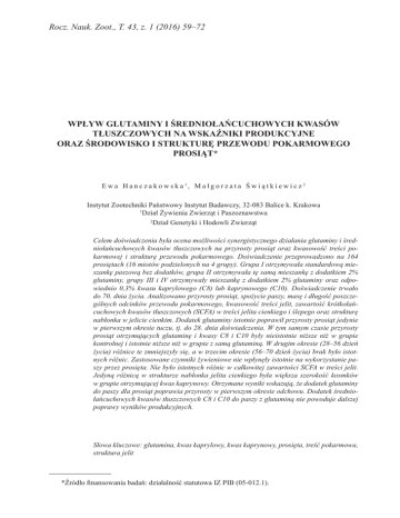 Rocz. Nauk. Zoot., T. 43, z. 1 (2016) 59–72 WPŁYW GLUTAMINY I ŚREDNIOŁAŃCUCHOWYCH KWASÓW TŁUSZCZOWYCH NA WSKAŹNIKI PRODUKCYJNE ORAZ ŚRODOWISKO I STRUKTURĘ PRZEWODU POKARMOWEGO PROSIĄT* * E w a H a n c z a k o w s k a 1, M a ł g o r z a t a Ś w i ą t k i e w i c z 2 Instytut Zootechniki Państwowy Instytut Badawczy, 32-083 Balice k. Krakowa 1 Dział Żywienia Zwierząt i Paszoznawstwa 2 Dział Genetyki i Hodowli Zwierząt Celem doświadczenia była ocena możliwości synergistycznego działania glutaminy i średniołańcuchowych kwasów tłuszczowych na przyrosty prosiąt oraz kwasowość treści pokarmowej i strukturę przewodu pokarmowego. Doświadczenie przeprowadzono na 164 prosiętach (16 miotów podzielonych na 4 grupy). Grupa I otrzymywała standardową mieszankę paszową bez dodatków, grupa II otrzymywała tę samą mieszankę z dodatkiem 2% glutaminy, grupy III i IV otrzymywały mieszankę z dodatkiem 2% glutaminy oraz odpowiednio 0,3% kwasu kaprylowego (C8) lub kaprynowego (C10). Doświadczenie trwało do 70. dnia życia. Analizowano przyrosty prosiąt, spożycie paszy, masę i długość poszczególnych odcinków przewodu pokarmowego, kwasowość treści jelit, zawartość krótkołańcuchowych kwasów tłuszczowych (SCFA) w treści jelita cienkiego i ślepego oraz strukturę nabłonka w jelicie cienkim. Dodatek glutaminy istotnie poprawił przyrosty prosiąt jedynie w pierwszym okresie tuczu, tj. do 28. dnia doświadczenia. W tym samym czasie przyrosty prosiąt otrzymujących glutaminę i kwasy C8 i C10 były nieistotnie niższe niż w grupie kontrolnej i istotnie niższe niż w grupie z samą glutaminą. W drugim okresie (28–56 dzień życia) różnice te zmniejszyły się, a w trzecim okresie (56–70 dzień życia) brak było istotnych różnic. Zastosowane czynniki żywieniowe nie wpłynęły istotnie na wykorzystanie paszy przez prosięta. Nie było istotnych różnic w całkowitej zawartości SCFA w treści jelit. Jedyną różnicą w strukturze nabłonka jelita cienkiego była większa szerokość kosmków w grupie otrzymującej kwas kaprynowy. Otrzymane wyniki wskazują, że dodatek glutaminy do paszy dla prosiąt poprawia przyrosty w pierwszym okresie odchowu. Dodatek średniołańcuchowych kwasów tłuszczowych C8 i C10 do paszy z glutaminą nie powoduje dalszej poprawy wyników produkcyjnych. Słowa kluczowe: glutamina, kwas kaprylowy, kwas kaprynowy, prosięta, treść pokarmowa, struktura jelit *Źródło finansowania badań: działalność statutowa IZ PIB (05-012.1). 60 E. Hanczakowska i M. Świątkiewicz Unia Europejska wprowadziła zakaz używania antybiotykowych stymulatorów wzrostu w żywieniu zwierząt gospodarskich, powstała wiec konieczność znalezienia ich zamienników, zwłaszcza dla młodych, wrażliwych zwierząt (Anadón, 2006). Prosięta, mające nie w pełni rozwinięty przewód pokarmowy i system odpornościowy są szczególnie podatne na szkodliwy wpływ środowiska (Bailey i in., 2005). Z powodu wysokiego zapotrzebowania rosnących zwierząt na białko i energię podstawowe znaczenie ma właściwy rozwój i funkcjonowanie przewodu pokarmowego. Po odsadzeniu prosięta muszą zaadaptować się do nowych stresujących warunków, co jest związane z obniżonym spożyciem paszy, przejściowym niedożywieniem i zahamowaniem wzrostu (Lallés i in., 2004). W tym okresie synteza białka obniża się w mięśniach, natomiast rośnie w jelitach, co chroni przewód pokarmowy przed niedoborem tego składnika (Séve i in., 1986). Spożycie paszy i funkcjonowanie przewodu pokarmowego mogą być poprawione przez podawanie prosiętom produktów mlecznych, będących źródłem łatwo przyswajalnego białka i energii (Thacker, 1999). Innym sposobem zapobiegania atrofii jelit obserwowanej w okresie okołoodsadzeniowym może być zastosowanie glutaminy lub glutaminianu jako dodatku do paszy (Ewtushick i in., 2000). Newsholme i in. (2003) stwierdzili, że w warunkach stresu po odsadzeniu glutamina jest aminokwasem „względnie niezbędnym”. Pozytywny wpływ dodatku glutaminy do paszy na przyrosty i morfologię jelit u odsadzonych prosiąt stwierdzili Zhong i in. (2011). Również w naszym wcześniejszym doświadczeniu (Hanczakowska i in., 2014) glutamina poprawiła przyrosty odsadzonych prosiąt. Dobre efekty można również uzyskać, wzbogacając paszę dla prosiąt średniołańcuchowymi kwasami tłuszczowymi (MCFA – ang. Medium Chain Fatty Acids). Jest to wynikiem ich działania antybakteryjnego (Skrivanová i in., 2009) oraz poprawy struktury nabłonka jelitowego (Hanczakowska i in., 2011). Celem badań było określenie możliwości synergistycznego działania glutaminy i średniołańcuchowych kwasów tłuszczowych na przyrosty masy ciała prosiąt oraz kwasowość treści pokarmowej i strukturę nabłonka jelit. Materiał i metody Wszystkie zastosowane metody zostały zaaprobowane przez II Lokalną Komisję Etyczną do Doświadczeń na Zwierzętach w Krakowie. Utrzymanie i żywienie zwierząt Doświadczenie przeprowadzono na 164 prosiętach (16 miotów) pochodzących od loch rasy polskiej białej zwisłouchej × wielkiej białej polskiej, pokrytych knurem duroc × pietrain. Zwierzęta przydzielono do jednej z 4 grup, po około 40 prosiąt (4 mioty) w każdej. Grupa I (C – kontrola negatywna) otrzymywała standardową mieszankę paszową bez dodatków, grupa II (GT – kontrola pozytywna) otrzymywała tę samą mieszankę z dodatkiem 2% glutaminy, grupy III i IV otrzymywały mieszankę z dodatkiem 2% glutaminy oraz odpowiednio 0,3% kwasu kaprylowego (C8) 61 Glutamina i średniołańcuchowe kwasy tłuszczowe w żywieniu prosiąt lub kaprynowego (C10). Pasza i woda były dostępne do woli. Prosięta otrzymywały mieszankę typu prestarter od 7. do 21. dnia życia, a starter od 22. dnia do końca doświadczenia (70. dzień życia). Prosięta odsadzano w 28. dniu życia. Skład mieszanek podano w tabeli 1. Prosięta ważono indywidual