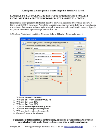 Konfiguracja programu Photoshop dla drukarki Ricoh PAMIĘTAJ: PO ZAINSTALOWANIU KOMPLETU KARTRIDŻY DO DRUKARKI RICOH, DRUKARKA OD TEJ PORY POWINNA BYĆ ZAWSZE WŁĄCZONA!!! Przestrzeń kolorów programu Photoshop musi być ustawiona zgodnie z przestrzenią kolorów, w której profil ICC był stworzony. Pozwoli to na realistyczne odwzorowanie kolorów wyświetlanych w monitorze. Dokładność kolorów wyświetlanych w monitorze zależy od jakości matrycy i przede wszystkim od doboru odpowiedniego profilu monitora. 1. Uruchom Photoshop i przejdź do Ustawień koloru (Edycja > Ustawienia koloru) 1 2 3 4 5 6 7 8 1. 2. 3. 4. 5. 6. 7. 8. Wybierz: Adobe RGB (1998) Wybierz: US. Web Coated (SWOP) v2 Wybierz: Dot Gain 20% Wybierz: Dot Gain 20% Wybierz: Konwersja na roboczy RGB Wybierz: Zachowaj osadzone profile Wybierz: Zachowaj osadzone profile Zaznacz 3 opcje w kwadratach W przypadku składania reklamacji informujemy, że usterki spowodowane zastosowaniem innych kartridży niż marka Sawgrass Europe, nie będą w ogóle rozpatrywane. wersja 1.13 www.grawerton.pl infolinia: 0801 88 99 27 [email protected] 1/ 4 2. Kiedy pojawi się pole wyboru, wybierz Przydziel roboczy RGG Adobe RGB (1998). Program przygotowany jest do tworzenia projektów. 3. Kiedy otworzymy gotowy projekt, musimy upewnić się,ze jest on zapisany w palecie kolorów RGB. Aby to sprawdzić, należy wejść w opcję: Obrazek → Tryb → RGB 1 2 3 4. Zanim Twój projekt będzie gotowy do druku, musisz ręcznie przekształcić go w odbicie lustrzane w programie Photoshop. Upewnij się najpierw czy twój projekt jest zaznaczony, następnie wybierz: Obrazek → Odwróć obszar roboczy → Odwróć obszar roboczy poziomo. W przypadku składania reklamacji informujemy, że usterki spowodowane zastosowaniem innych kartridży niż marka Sawgrass Europe, nie będą w ogóle rozpatrywane. wersja 1.13 www.grawerton.pl infolinia: 0801 88 99 27 [email protected] 2/ 4 W przypadku składania reklamacji informujemy, że usterki spowodowane zastosowaniem innych kartridży niż marka Sawgrass Europe, nie będą w ogóle rozpatrywane. wersja 1.13 www.grawerton.pl infolinia: 0801 88 99 27 [email protected] 3/ 4 5. Gdy projekt jest gotowy do druku, wciśnij Plik → Drukuj z podglądem 1 2 3 4 5 1. 2. 3. 4. 5. 6. 6 Wybierz opcję Zarządzanie kolorem z rozwijanego menu. W Drukuj wybierz Dokument W Obsłudze kolorów wybierz Kolory zależne od programu Photoshop W Profilu drukarki wybierz SubliJet_R_SG7100_vC-1.0 Wybierz: Wizualny. Zaznacz: Kompensacja punktu czerni Uwaga: Jeżeli nie możesz wybrać profilu SubliJet_R_SG7100_vC-1.0 z rozwijanej listy może to oznaczać, że profil ICC nie jest jeszcze zainstalowany w Twoim komputerze lub Photoshop nie został zrestartowany po instalacji profilu. Zainstaluj profil, zamknij i uruchom ponownie program Photoshop. Teraz można drukować. W przypadku składania reklamacji informujemy, że usterki spowodowane zastosowaniem innych kartridży niż marka Sawgrass Europe, nie będą w ogóle rozpatrywane. wersja 1.13 www.grawerton.pl infolinia: 0801 88 99 27 [email protected] 4/ 4
