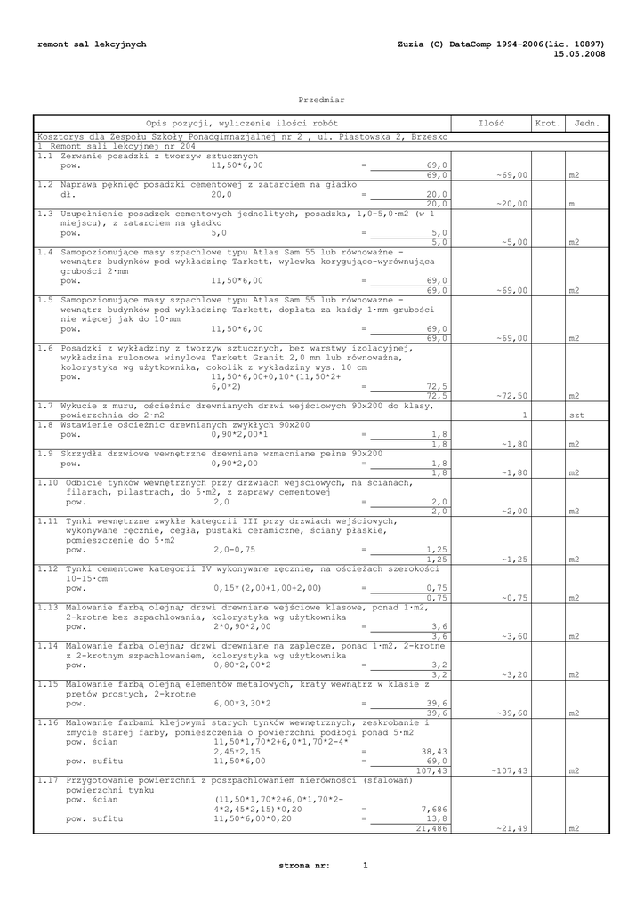 remont sal lekcyjnych Zuzia (C) DataComp 1994-2006(lic. 10897) 15.05.2008 Przedmiar Opis pozycji, wyliczenie ilości robót Ilość Kosztorys dla Zespołu Szkoły Ponadgimnazjalnej nr 2 , ul. Piastowska 2, Brzesko 1 Remont sali lekcyjnej nr 204 1.1 Zerwanie posadzki z tworzyw sztucznych pow. 11,50*6,00 = 69,0 69,0 1.2 Naprawa pęknięć posadzki cementowej z zatarciem na gładko dł. 20,0 = 20,0 20,0 1.3 Uzupełnienie posadzek cementowych jednolitych, posadzka, 1,0-5,0·m2 (w 1 miejscu), z zatarciem na gładko pow. 5,0 = 5,0 5,0 1.4 Samopoziomujące masy szpachlowe typu Atlas Sam 55 lub równoważne wewnątrz budynków pod wykładzinę Tarkett, wylewka korygująco-wyrównująca grubości 2·mm pow. 11,50*6,00 = 69,0 69,0 1.5 Samopoziomujące masy szpachlowe typu Atlas Sam 55 lub równowazne wewnątrz budynków pod wykładzinę Tarkett, dopłata za każdy 1·mm grubości nie więcej jak do 10·mm pow. 11,50*6,00 = 69,0 69,0 1.6 Posadzki z wykładziny z tworzyw sztucznych, bez warstwy izolacyjnej, wykładzina rulonowa winylowa Tarkett Granit 2,0 mm lub równoważna, kolorystyka wg użytkownika, cokolik z wykładziny wys. 10 cm pow. 11,50*6,00+0,10*(11,50*2+ 6,0*2) = 72,5 72,5 1.7 Wykucie z muru, ościeżnic drewnianych drzwi wejściowych 90x200 do klasy, powierzchnia do 2·m2 1.8 Wstawienie ościeżnic drewnianych zwykłych 90x200 pow. 0,90*2,00*1 = 1,8 1,8 1.9 Skrzydła drzwiowe wewnętrzne drewniane wzmacniane pełne 90x200 pow. 0,90*2,00 = 1,8 1,8 1.10 Odbicie tynków wewnętrznych przy drzwiach wejściowych, na ścianach, filarach, pilastrach, do 5·m2, z zaprawy cementowej pow. 2,0 = 2,0 2,0 1.11 Tynki wewnętrzne zwykłe kategorii III przy drzwiach wejściowych, wykonywane ręcznie, cegła, pustaki ceramiczne, ściany płaskie, pomieszczenie do 5·m2 pow. 2,0-0,75 = 1,25 1,25 1.12 Tynki cementowe kategorii IV wykonywane ręcznie, na ościeżach szerokości 10-15·cm pow. 0,15*(2,00+1,00+2,00) = 0,75 0,75 1.13 Malowanie farbą olejną; drzwi drewniane wejściowe klasowe, ponad 1·m2, 2-krotne bez szpachlowania, kolorystyka wg użytkownika pow. 2*0,90*2,00 = 3,6 3,6 1.14 Malowanie farbą olejną; drzwi drewniane na zaplecze, ponad 1·m2, 2-krotne z 2-krotnym szpachlowaniem, kolorystyka wg użytkownika pow. 0,80*2,00*2 = 3,2 3,2 1.15 Malowanie farbą olejną elementów metalowych, kraty wewnątrz w klasie z prętów prostych, 2-krotne pow. 6,00*3,30*2 = 39,6 39,6 1.16 Malowanie farbami klejowymi starych tynków wewnętrznych, zeskrobanie i zmycie starej farby, pomieszczenia o powierzchni podłogi ponad 5·m2 pow. ścian 11,50*1,70*2+6,0*1,70*2-4* 2,45*2,15 = 38,43 pow. sufitu 11,50*6,00 = 69,0 107,43 1.17 Przygotowanie powierzchni z poszpachlowaniem nierówności (sfalowań) powierzchni tynku pow. ścian (11,50*1,70*2+6,0*1,70*24*2,45*2,15)*0,20 = 7,686 pow. sufitu 11,50*6,00*0,20 = 13,8 21,486 strona nr: 1 Krot. Jedn. ~69,00 m2 ~20,00 m ~5,00 m2 ~69,00 m2 ~69,00 m2 ~72,50 m2 1 szt ~1,80 m2 ~1,80 m2 ~2,00 m2 ~1,25 m2 ~0,75 m2 ~3,60 m2 ~3,20 m2 ~39,60 m2 ~107,43 m2 ~21,49 m2 remont sal lekcyjnych Zuzia (C) DataComp 1994-2006(lic. 10897) 15.05.2008 Opis pozycji, wyliczenie ilości robót Ilość 1.18 Gruntowanie tynków wewnętrznych, dwukrotne malowanie ścian i sufitów farbą wapienną (mleczko wapienne) pow. ścian 11,50*1,70*2+6,0*1,70*2-4* 2,45*2,15 = 38,43 pow. sufitu 11,50*6,00 = 69,0 107,43 1.19 Malowanie farbami emulsyjnymi starych tynków, 2-krotne, ściany wewnętrzne, kolor: jasny zielony pow. ścian 11,50*1,70*2+6,0*1,70*2-4* 2,45*2,15 = 38,43 38,43 1.20 Malowanie farbami emulsyjnymi starych tynków, 2-krotne, sufity wewnętrzne, kolor: biały pow. sufitu 11,50*6,00 = 69,0 69,0 1.21 Malowanie farbami olejnymi starych tynków wewnętrznych, ściany, bez szpachlowania, 2-krotne, wraz z gruntowaniem, kolor: oliwkowy pow. ścian 11,50*1,50*2+6,0*1,50*2-4* 2,45*2,15/2 = 41,965 41,965 1.22 Malowanie farbą olejną elementów metalowych łącznie z zeskrobaniem starej łuszczącej się farby, grzejniki żeberkowe, 2-krotne, kolor: oliwkowy grzejniki - wys. 60 cm x szer. 100 cm, 4 szt. 4*0,60*1,00 = 2,4 2,4 1.23 Malowanie farbą olejną elementów metalowych, rury grzejnikowe, piony i odpowietrzenia c.o., średnica 50·mm, 2-krotne, kolor: oliwkowy rury grzejnikowe 1,00*2,0*2*2 = 8,0 piony i odpowietrzenia 3,20*2*2+11,50*2 = 35,8 43,8 1.24 Mycie po robotach malarskich, posadzki z pcw pow. klasy - podłoga 11,50*6,00 = 69,0 69,0 2 Remont sali lekcyjnej nr 203 2.1 Zerwanie posadzki z tworzyw sztucznych pow. 11,50*6,00 = 69,0 69,0 2.2 Naprawa pęknięć posadzki cementowej z zatarciem na gładko dł. 15,0 = 15,0 15,0 2.3 Uzupełnienie posadzek cementowych jednolitych, posadzka, 1,0-5,0·m2 (w 1 miejscu), z zatarciem na gładko pow. 5,0 = 5,0 5,0 2.4 Samopoziomujące masy szpachlowe typu Atlas Sam 55 lub równoważne wewnątrz budynków pod wykładzinę Tarkett, wylewka korygująco-wyrównująca grubości 2·mm pow. 11,50*6,00 = 69,0 69,0 2.5 Samopoziomujące masy szpachlowe typu Atlas Sam 55 lub równowazne wewnątrz budynków pod wykładzinę Tarkett, dopłata za każdy 1·mm grubości nie więcej jak do 10·mm pow. 11,50*6,00 = 69,0 69,0 2.6 Posadzki z wykładziny z tworzyw sztucznych, bez warstwy izolacyjnej, wykładzina rulonowa winylowa Tarkett Granit 2,0 mm lub równoważna, kolorystyka wg użytkownika, cokolik z wykładziny wys. 10 cm pow. 11,50*6,00+0,10*(11,50*2+ 6,0*2) = 72,5 72,5 2.7 Wykucie z muru, ościeżnic drewnianych drzwi wejściowych 90x200 do klasy, powierzchnia do 2·m2 2.8 Wstawienie ościeżnic drewnianych zwykłych 90x200 pow. 0,90*2,00*1 = 1,8 1,8 2.9 Skrzydła drzwiowe wewnętrzne drewniane wzmacniane pełne 90x200 pow. 0,90*2,00 = 1,8 1,8 2.10 Odbicie tynków wewnętrznych przy drzwiach wejściowych, na ścianach, filarach, pilastrach, do 5·m2, z zaprawy cementowej pow. 2,0 = 2,0 2,0 2.11 Tynki wewnętrzne zwykłe kategorii III przy drzwiach wejściowych, wykonywane ręcznie, cegła, pustaki ceramiczne, ściany płaskie, pomieszczenie do 5·m2 pow. 2,0-0,75 