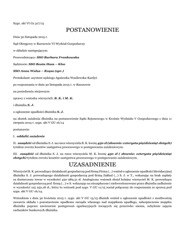 Sygn. akt VI Gz 317/15 POSTANOWIENIE Dnia 30 listopada 2015 r. Sąd Okręgowy w Rzeszowie VI Wydział Gospodarczy w składzie następującym: Przewodniczący: SSO Barbara Frankowska Sędziowie: SSO Beata Hass – Kloc SSO Anna Walus – Rząsa (spr.) Protokolant: asystent sędziego Agnieszka Wasilewska-Kardyś po rozpoznaniu w dniu 30 listopada 2015 r. w Rzeszowie na posiedzeniu niejawnym sprawy z wniosku wierzycieli: B. K. i M. K. i dłużnika S. J. o ogłoszenie upadłości dłużnika S. J. na skutek zażalenia dłużnika na postanowienie Sądu Rejonowego w Krośnie Wydziału V Gospodarczego z dnia 11 sierpnia 2015 r. sygn. akt V GU 16/14 postanawia: I. oddalić zażalenie II. zasądzić od dłużnika S. J. na rzecz wierzyciela B. K. kwotę 450 zł (słownie: czterysta pięćdziesiąt złotych) tytułem zwrotu kosztów zastępstwa procesowego w postępowaniu zażaleniowym. III. zasądzić od dłużnika S. J. na rzecz wierzyciela M. K. kwotę 450 zł ( słownie: czterysta pięćdziesiąt złotych) tytułem zwrotu kosztów zastępstwa procesowego w postępowaniu zażaleniowym. UZASADNIENIE Wierzyciel B. K. prowadzący działalność gospodarczą pod firmą Firma (...) wniósł o ogłoszenie upadłości likwidacyjnej dłużnika S. J. prowadzącego działalność gospodarczą pod firmą Zakład (...) S. J. w T., wskazując na brak zapłaty za dostarczony towar w wysokości 430 989,31 zł. Analogiczny wniosek złożył kolejny wierzyciel M. K. prowadząca działalność gospodarczą pod firmą (...) w S. wskazując na niezapłacone i niekwestionowane przez dłużnika zadłużenie w wysokości 125 252,18 zł., który to wniosek pod sygn. V GU 11/15 został połączony do rozpoznania ze sprawą pod sygn. akt V GU 16/14. Wnioskiem z dnia 30 kwietnia 2015 r. sygn. akt V GU 13/15 dłużnik wniósł o ogłoszenie upadłości z możliwością zawarcia układu i pozostawienie upadłemu zarządu własnego nad majątkiem upadłego, zabezpieczenie majątku dłużnika poprzez zawieszenie postępowań egzekucyjnych toczących się przeciwko niemu, uchylenie zajęcia rachunków bankowych dłużnika. Dłużnik wskazał w uzasadnieniu, że prowadzi działalność gospodarczą z zakresu sprzedaży hurtowej złomu i odpadów, produkcji wyrobów budowalnych z betonu, produkcji, obróbki elementów metalowych, zbierania odpadów, odzysku surowców, rozbiórki obiektów budowlanych itp. Przedsiębiorstwo znajduje się w T., ale prowadzi także działalność w wymienionych we wniosku miejscach. Majątek dłużnika został wymieniony w załączniku do wniosku. Działalność rozpoczął w 1993 r. prowadząc skup złomu, następnie ją rozwinął o produkcję betonu i obrót wyrobami hutniczymi. Dłużnik wskazał , że na załamanie się w 2013 r. dotychczas prowadzonej z sukcesem działalności wpłynęło załamanie się rynku handlu złomem, którego pierwsze oznaki występowały już w 2010 r. oraz bankructwo odbiorcy huty (...) (...).S. Dłużnik przyjął zapłatę w półproduktach, które okazały się trudno zbywalne. Jednocześnie zakup nieruchomości ze środków pochodzących z kredytów bankowych spowodował wysokie koszty obsługi tych kredytów. Dalej dłużnik wskazał na załamanie się sprzedaży w 2014 r. kiedy to przychody ze sprzedaży z 26 867 114,49 zł. na 31 grudnia 2013 r. spadły do 12 999 816,95 zł. na koniec 31 grudnia 2014 r. Szczególnie dotkliwy był spadek sprzedaży towarów i materiałów, który z 23 923 653 zł. spadł do 10 809 474,43 zł. Strata z działalności z 639 415,59 zł. na koniec 31 grudnia 2013 r. wzrosła do 1 397 082,29 zł. Dopiero na początku 2015 przychód osiągnął za pierwsze trzy miesiące 1 364 714 zł. i zysk 62 572 zł. Głównym problemem dłużnika są zobowiązania z zaciągniętych kredytów, zabezpieczonych hipotekami. Wskazał na zadłużenie w (...) S.A., (...) S.A., (...) Banku(...)w S. i Banku (...)w B.. Na poparcie wniosku o ogłoszenie upadłości układowej wskazał na trzy źródła finansowania, a to ze sprzedaży części nieruchomości niezwiązanych bezpośrednio z prowadzoną działalnością, sprzedaż zapasów magazynowych , które na dzień bilansu wynosiły 1 864 252,85 zł. w postaci wyrobów metalowych przejętych od upadającej huty i trzeci podstawowy, a to środki uzyskane z bieżącej działalności, jako że dłużnik za pierwsze trzy miesiące 2015 r. wykazał zysk 62 572 zł. Dłużnik przedstawił propozycje układowe, a to : - Odnośnie zobowiązań do kwoty 7000 zł. umorzenie należności z tytułu ustawowych odsetek, kosztów postępowania sądowego i komorniczego, spłata wierzytelności obejmujących należność główną w 100 % w czterech równych ratach. Pierwsza rata płatna do ostatniego dnia trzeciego miesiąca kalendarzowego następującego po miesiącu, w którym uprawomocniło się postanowienie o zatwierdzeniu układu, kolejne raty płatne do ostatniego dnia każdego następnego miesiąca kalendarzowego licząc od ostatniego terminu zapłaty pierwszej raty. - Odnośnie zobowiązań powyżej kwoty 7 000 zł. umorzenie należności z tytułu ustawowych odsetek, kosztów postępowania sądowego i komorniczego , zmniejszenie wierzytelności obejmujących należność główną o 20 %, spłata zmniejszonych wierzytelności w 6 równych ratach. Pierwsza rata płatna do ostatniego dnia miesiąca następującego po miesiącu w którym uprawomocniło się postanowienie o zatwierdzeniu układu, kolejne raty płatne co trzy miesiące licząc od ostatniego dnia terminu zapłaty poprzedniej raty. Sprawa została połączona do rozpoznania pod sygn. akt V GU 16/14. Postanowieniem z dnia 11 sierpnia 2015 r. sygn. akt V GU 16/14 Sąd Rejonowy w Krośnie, Wydział V Gospodarczy postanowił ogłosić upadłość dłużnika S. J. obejmującą likwidację majątku dłużnika, wyznaczyć sędziego komisarza i syndyka upadłości oraz oddalił wniosek dłużnika o ogłoszenie upadłości z możliwością zawarcia układu.