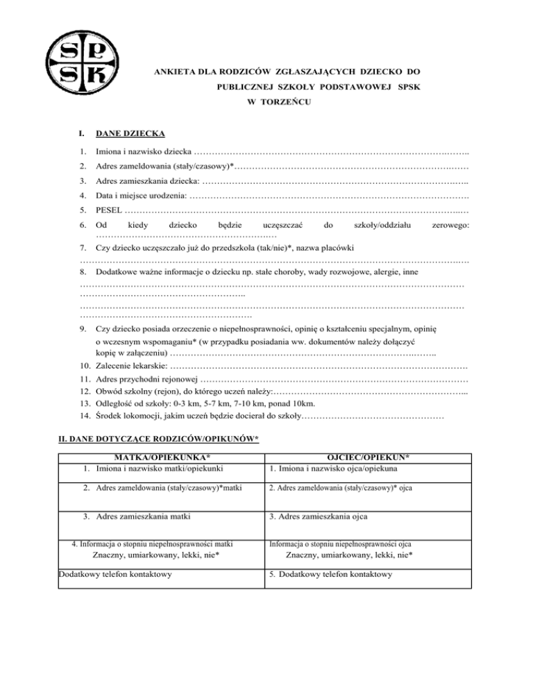 ANKIETA DLA RODZICÓW ZGŁASZAJĄCYCH DZIECKO DO PUBLICZNEJ SZKOŁY PODSTAWOWEJ SPSK W TORZEŃCU I. DANE DZIECKA 1. Imiona i nazwisko dziecka ………………………………………………………………………….…….. 2. Adres zameldowania (stały/czasowy)*……………………………………………………………….…… 3. Adres zamieszkania dziecka: ………………………………………………………………………….….. 4. Data i miejsce urodzenia: …………………………………………………………………………………. 5. PESEL …………………………………………………………………………………………………..… 6. Od kiedy dziecko będzie uczęszczać ………………………………………………….… do szkoły/oddziału zerowego: 7. Czy dziecko uczęszczało już do przedszkola (tak/nie)*, nazwa placówki ……………………………………………………………………………………………………………….…. 8. Dodatkowe ważne informacje o dziecku np. stałe choroby, wady rozwojowe, alergie, inne ………………………………………………………………………………………………………………… ……………………………………………….. ………………………………………………………………………………………………………………… …………………………………………………. 9. Czy dziecko posiada orzeczenie o niepełnosprawności, opinię o kształceniu specjalnym, opinię o wczesnym wspomaganiu* (w przypadku posiadania ww. dokumentów należy dołączyć kopię w załączeniu) ……………………………………………………………………….…….. 10. Zalecenie lekarskie: ………………………………………………………………………………………. 11. 12. 13. 14. Adres przychodni rejonowej ……………………………………………………………………………… Obwód szkolny (rejon), do którego uczeń należy:………………………………………………………... Odległość od szkoły: 0-3 km, 5-7 km, 7-10 km, ponad 10km. Środek lokomocji, jakim uczeń będzie docierał do szkoły………………………………………… II. DANE DOTYCZĄCE RODZICÓW/OPIKUNÓW* MATKA/OPIEKUNKA* 1. Imiona i nazwisko matki/opiekunki OJCIEC/OPIEKUN* 1. Imiona i nazwisko ojca/opiekuna 2. Adres zameldowania (stały/czasowy)*matki 2. Adres zameldowania (stały/czasowy)* ojca 3. Adres zamieszkania matki 3. Adres zamieszkania ojca 4. Informacja o stopniu niepełnosprawności matki Znaczny, umiarkowany, lekki, nie* Dodatkowy telefon kontaktowy Informacja o stopniu niepełnosprawności ojca Znaczny, umiarkowany, lekki, nie* 5. Dodatkowy telefon kontaktowy 1. Rodzina pełna, niepełna, zastępcza* ……………………………………………………………………… 2. Informacja o ograniczeniu praw rodzicielskich: ……………………………………………………………………………………………………………….….. 3. Dodatkowe informacje oraz uzasadnienie w przypadku dziecka 2,5 letniego ……………………………………………………………………………………………………..……………. 4. Czy chcieliby Państwo współpracować na teranie klasy lub szkoły w którymś z wymienionych zakresów? (proszę podkreślić właściwy obszar). · Pomoc w organizowaniu imprez szkolnych, · Dyspozycyjność czasowa (możliwość wyjścia z klasą np. na wycieczkę), · Wzbogacenie zaplecza klasy/szkoły w …………………………………………………, · Sponsorowanie szkoły, · Pomoc w promocji szkoły (reklama,, radio, drukarnia itp…). Jak Państwo wyobrażacie sobie tą pomoc?................................................................................................................. ………………………………………………………………………………………………………………………. ……………………………………………………………………………………………………………………… Oświadczam, iż przedłożone informacje są zgodne ze stanem faktycznym. Jednocześnie zobowiązuje się do terminowego uiszczenia opłat (składek klasowych), a także zakupienia dziecku wyprawki. Przyjmuję do wiadomości, że zdjęcia na których widnieje moje dziecko mogą być umieszczone na stronie internetowej szkoł oraz na gazetkach szkolnych zgodnie z ustawą o upowszechnianiu wizerunku. Decydując się na umieszczenie mojego dziecka w szkole o charakterze katolickim oświadczamy, że jako rodzice jesteśmy świadomi naszego obowiązku wychowania go w wierze katolickiej, co potwierdziliśmy wcześniej własnoręcznym podpisem przy sakramencie chrztu dziecka i akceptujemy nadal. ……………………………. Miejscowość, data …………………………………… ……… podpis ojca/opiekuna i matki/opiekunki II. RODZICE/OPIEKUNOWIE ZOBOWIĄZANI SĄ DO: 1) Zapoznania się i przestrzegania postanowień, regulaminu i zasad aktualnie obowiązujących w szkole.. UWAGA! Za korzystanie z dodatkowych zajęć, teatrzyków, przedstawień oraz ubezpieczenia Rodzic obowiązany jest do uiszczenia dodatkowych opłat. Zapoznałam się …………………………. Data i podpis matki/opiekunki Zapoznałem się ………………………………… . Data i podpis ojca/opiekuna INFORMACJE DOTYCZĄCE DANYCH OSOBOWYCH Zgodnie z Zarządzeniem MEN Nr 5 z dnia 18.03.1993r. w sprawie sposobu prowadzenia przez publiczne placówki oświatowe dokumentacji przebiegu nauczania (Dz. Urz. MEN Nr 4/93 poz. 12) są zebrane w celu szybkiego kontaktu w nagłych okolicznościach oraz poznania sytuacji rodzinnej dziecka. Są udostępnione tylko nauczycielom przedsz