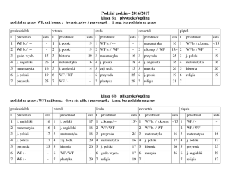 Podział godzin – 2016/2017 klasa 6 a pływacko/ogólna podział na grupy WF, zaj. komp. : lewa str. pływ / prawa ogól. ; j. ang. bez podziału na grupy poniedziałek wtorek czwartek środa sala l. przedmiot sala l. przedmiot piątek l. przedmiot sala l. przedmiot sala l. 1 WF b. / --- - 1 j. polski 19 1 WF b. / --- - 1 matematyka 2 WF b. / --- - 2 j. polski 19 2 WF b. / WF - 2 z.komp. / WF 13/- 2 WF b. / WF 3 godz. wych. 15 3 historia 20 3 matematyka 16 3 przyroda 25 3 j. polski 19 4 j. angielski 26 4 matematyka 16 4 j. polski 18 4 j. angielski 16 4 matematyka 16 5 matematyka 16 5 j. angielski 14 5 zaj. tech. 15 5 muzyka 26 5 historia 20 6 j. polski 19 6 WF / WF - 6 przyroda 25 6 j. polski 19 6 religia 19 7 przyroda 25 7 WF / - - 7 plastyka 29 7 religia 21 7 16 1 przedmiot sala WF b. / z.komp. -/13 - klasa 6 b piłkarsko/ogólna podział na grupy: WF i zaj.komp.: -lewa str. piłk. / prawa ogól.; j. ang. bez podziału na grupy poniedziałek wtorek sala l. przedmiot czwartek środa l. przedmiot sala l. przedmiot 1 j. angielski 16 1 j. polski 17 1 z.komp./ -- 2 matematyka 16 2 j. angielski 16 2 WF / WF 3 j. polski 17 3 matematyka 4 j. polski 17 4 5 przyroda 25 6 WF / - 7 WF / - piątek sala l. przedmiot 13/- 1 WF b. / z.komp. -/13 1 WF / - - 2 WF b. / WF WF / WF - 16 3 przyroda 25 3 matematyka 16 3 matematyka 16 zaj. tech. 29 4 matematyka 16 4 j. polski 17 4 j. polski 17 5 historia 20 5 j. polski 17 5 historia 20 5 przyroda 25 - 6 WF / WF 17 6 muzyka 26 6 j. angielski 29 - 7 plastyka religia 17 - 6 godz. wych. 29 7 religia - 19 7 sala l. - 2 7 przedmiot sala klasa 6 c zmiana od 13.02.17r. podział na grupy tylko na zaj. komputerowych : lewa str. dz. / prawa chł. poniedziałek wtorek l. przedmiot sala l. 1 matematyka 14 1 religia 2 j. polski 18 2 j.ang. / j.ang. 3 j. polski 18 3 4 przyroda 30 4 5 WF/WF 6 ----/z.komp. - przedmiot czwartek środa sala l. przedmiot przedmiot sala l. przedmiot 20 1 z.komp. / -- 27/- 1 matematyka 14 2 j. polski 18 2 plastyka 29 2 j.ang. / j.ang. 28/21 j. polski 18 3 godz. wych. 30 3 matematyka 14 3 historia 20 matematyka 14 4 przyroda 30 4 j.ang. / j.ang. 14 5 WF/WF 19 6 j. polski 18 6 7 muzyka 26 7 16 1 historia 28/29 5 WF/WF /27 6 zaj. tech. 25 6 religia 7 przyroda 30 7 7 - 5 matematyka sala l. piątek sala 28/29 4 j. polski 18 - 5 WF/WF - klasa 6 d angielska podział na grupy: WF lewa dz. / prawa chł.; poniedziałek j.ang. i zaj. komputerowe: lewa gr. ang.wyżej zaawans. /prawa ang. średnio zaawans. wtorek czwartek środa l. przedmiot sala l. przedmiot sala l. przedmiot sala l. przedmiot 1 przyroda 30 1 ---- / j.ang. /28 1 j.ang. / ---- 28/- 1 WF / WF 2 matematyka 14 2 matematyka 14 2 historia 20 2 j. polski 3 j. polski 19 3 muzyka 26 3 j. polski 19 3 4 j. polski 19 4 j. polski 19 4 matematyka 14 4 5 WF / WF 6 7 - 5 WF / WF - 5 WF / WF j.ang./z.komp. 28/13 6 plastyka 29 6 godz. wych. ---- / j.ang. /28 7 religia 19 7 z.komp. / j.ang. - 5 28 6 13/28 7 piątek sala l. przedmiot sala ---- / j.ang. /28 19 2 przyroda 30 przyroda 30 3 matematyka 14 religia 21 4 historia 20 matematyka 14 5 j. polski 19 zaj. tech. 30 6 j.ang. / ---- 28/- j.ang. / ---- 28/- 7 - 1