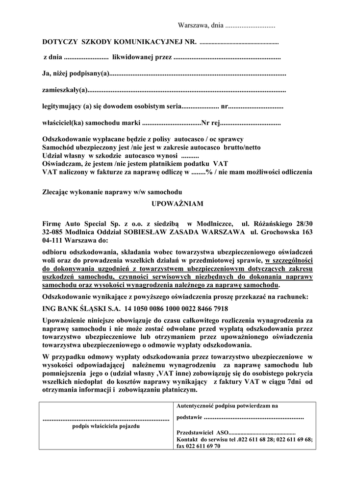 Warszawa, dnia ............................ DOTYCZY SZKODY KOMUNIKACYJNEJ NR. ..................................................... z dnia ......................... likwidowanej przez ............................................................ Ja, niżej podpisany(a)................................................................................................... zamieszkały(a)............................................................................................................... legitymujący (a) się dowodem osobistym seria..................... nr............................... właściciel(ka) samochodu marki .................................Nr rej.................................. Odszkodowanie wypłacane będzie z polisy autocasco / oc sprawcy Samochód ubezpieczony jest /nie jest w zakresie autocasco brutto/netto Udział własny w szkodzie autocasco wynosi .......... Oświadczam, że jestem /nie jestem płatnikiem podatku VAT VAT naliczony w fakturze za naprawę odliczę w ........% / nie mam możliwości odliczenia Zlecając wykonanie naprawy w/w samochodu UPOWAŻNIAM Firmę Auto Special Sp. z o.o. z siedzibą w Modlniczce, ul. Różańskiego 28/30 32-085 Modlnica Oddział SOBIESŁAW ZASADA WARSZAWA ul. Grochowska 163 04-111 Warszawa do: odbioru odszkodowania, składania wobec towarzystwa ubezpieczeniowego oświadczeń woli oraz do prowadzenia wszelkich działań w przedmiotowej sprawie, w szczególności do dokonywania uzgodnień z towarzystwem ubezpieczeniowym dotyczących zakresu uszkodzeń samochodu, czynności serwisowych niezbędnych do dokonania naprawy samochodu oraz wysokości wynagrodzenia należnego za naprawę samochodu. Odszkodowanie wynikające z powyższego oświadczenia proszę przekazać na rachunek: ING BANK ŚLĄSKI S.A. 14 1050 0086 1000 0022 8466 7918 Upoważnienie niniejsze obowiązuje do czasu całkowitego rozliczenia wynagrodzenia za naprawę samochodu i nie może zostać odwołane przed wypłatą odszkodowania przez towarzystwo ubezpieczeniowe lub otrzymaniem przez upoważnionego oświadczenia towarzystwa ubezpieczeniowego o odmowie wypłaty odszkodowania. W przypadku odmowy wypłaty odszkodowania przez towarzystwo ubezpieczeniowe w wysokości odpowiadającej należnemu wynagrodzeniu za naprawę samochodu lub pomniejszenia jego o (udział własny ,VAT inne) zobowiązuję się do osobistego pokrycia wszelkich niedopłat do kosztów naprawy wynikający z faktury VAT w ciągu 7dni od otrzymania informacji i zobowiązaniu płatniczym. Autentyczność podpisu potwierdzam na ....................................................................... podstawie ........................................................ podpis właściciela pojazdu Przedstawiciel ASO............................................. Kontakt do serwisu tel .022 611 68 28; 022 611 69 68; fax 022 611 69 70