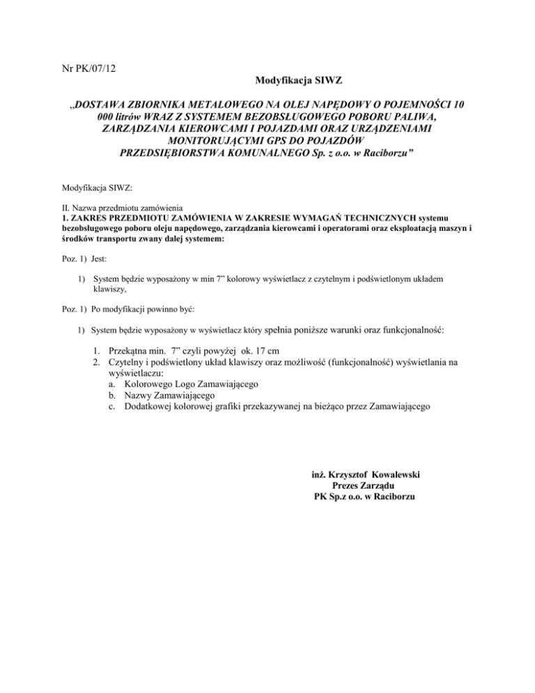 Nr PK/07/12 Modyfikacja SIWZ „DOSTAWA ZBIORNIKA METALOWEGO NA OLEJ NAPĘDOWY O POJEMNOŚCI 10 000 litrów WRAZ Z SYSTEMEM BEZOBSŁUGOWEGO POBORU PALIWA, ZARZĄDZANIA KIEROWCAMI I POJAZDAMI ORAZ URZĄDZENIAMI MONITORUJĄCYMI GPS DO POJAZDÓW PRZEDSIĘBIORSTWA KOMUNALNEGO Sp. z o.o. w Raciborzu” Modyfikacja SIWZ: II. Nazwa przedmiotu zamówienia 1. ZAKRES PRZEDMIOTU ZAMÓWIENIA W ZAKRESIE WYMAGAŃ TECHNICZNYCH systemu bezobsługowego poboru oleju napędowego, zarządzania kierowcami i operatorami oraz eksploatacją maszyn i środków transportu zwany dalej systemem: Poz. 1) Jest: 1) System będzie wyposażony w min 7” kolorowy wyświetlacz z czytelnym i podświetlonym układem klawiszy, Poz. 1) Po modyfikacji powinno być: 1) System będzie wyposażony w wyświetlacz który spełnia poniższe warunki oraz funkcjonalność: 1. Przekątna min. 7” czyli powyżej ok. 17 cm 2. Czytelny i podświetlony układ klawiszy oraz możliwość (funkcjonalność) wyświetlania na wyświetlaczu: a. Kolorowego Logo Zamawiającego b. Nazwy Zamawiającego c. Dodatkowej kolorowej grafiki przekazywanej na bieżąco przez Zamawiającego inż. Krzysztof Kowalewski Prezes Zarządu PK Sp.z o.o. w Raciborzu