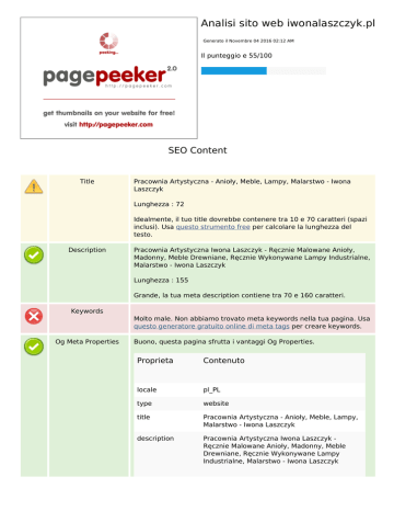 Analisi sito web iwonalaszczyk.pl Generato il Novembre 04 2016 02:12 AM Il punteggio e 55/100 SEO Content Title Pracownia Artystyczna - Anioły, Meble, Lampy, Malarstwo - Iwona Laszczyk Lunghezza : 72 Idealmente, il tuo title dovrebbe contenere tra 10 e 70 caratteri (spazi inclusi). Usa questo strumento free per calcolare la lunghezza del testo. Description Pracownia Artystyczna Iwona Laszczyk - Ręcznie Malowane Anioły, Madonny, Meble Drewniane, Ręcznie Wykonywane Lampy Industrialne, Malarstwo - Iwona Laszczyk Lunghezza : 155 Grande, la tua meta description contiene tra 70 e 160 caratteri. Keywords Molto male. Non abbiamo trovato meta keywords nella tua pagina. Usa questo generatore gratuito online di meta tags per creare keywords. Og Meta Properties Buono, questa pagina sfrutta i vantaggi Og Properties. Proprieta Contenuto locale pl_PL type website title Pracownia Artystyczna - Anioły, Meble, Lampy, Malarstwo - Iwona Laszczyk description Pracownia Artystyczna Iwona Laszczyk Ręcznie Malowane Anioły, Madonny, Meble Drewniane, Ręcznie Wykonywane Lampy Industrialne, Malarstwo - Iwona Laszczyk SEO Content Headings url http://iwonalaszczyk.pl/ image http://iwonalaszczyk.pl/wp-content/uploads/201 5/03/POMYSŁY-e1449084662642-480x293.jpg H1 2 H2 6 [H1] [H1] [H2] [H2] [H2] [H2] [H2] [H2] [H4] [H4] [H4] [H4] [H4] [H5] [H5] [H5] [H5] [H5] [H5] Images H3 0 H4 5 H5 6 H6 0 Pracownia Artystyczna Niepowtarzalny klimat Sztuki i drewna. projekty z sercem Projekty Zapraszam do współpracy! Odnawianie Indywidualizm Malowanie Dołącz do mnie Nawigacja Dodatkowo Dołącz do mnie Lokalizacja Meble Rysunek Anioły Malarstwo Lampy i Akcesoria Pomysły Abbiamo trovato 13 immagini in questa pagina web. 7 attributi alt sono vuoti o mancanti. Aggiungi testo alternativo in modo tale che i motori di ricerca possano comprendere meglio il contenuto delle tue immagini. Text/HTML Ratio Ratio : 4% Il rapporto testo/codice HTML di questa pagina e inferiore a 15 percento, questo significa che il tuo sito web necessita probabilmente di molto piu contenuto. Flash Iframe Perfetto, non e stato rilevato contenuto Flash in questa pagina. Grande, non sono stati rilevati Iframes in questa pagina. SEO Links URL Rewrite Buono. I tuoi links appaiono friendly! SEO Links Underscores in the URLs Perfetto! Non sono stati rilevati underscores nei tuoi URLs. In-page links Abbiamo trovato un totale di 22 links inclusi 0 link(s) a files Statistics External Links : noFollow 4.55% External Links : Passing Juice 0% Internal Links 95.45% In-page links Anchor Type Juice Start Interno Passing Juice Oferta Interno Passing Juice Projekty Interno Passing Juice Meble Interno Passing Juice Rysunek Interno Passing Juice Anioły Interno Passing Juice Malarstwo Interno Passing Juice Lampy i Aksesoria Interno Passing Juice Pomysły Interno Passing Juice Blog Interno Passing Juice O Pracowni Interno Passing Juice Opinie Interno Passing Juice FAQs Interno Passing Juice Kontakt Interno Passing Juice Meble Interno Passing Juice Rysunek Interno Passing Juice Anioły Interno Passing Juice Malarstwo Interno Passing Juice In-page links Lampy i Akcesoria Interno Passing Juice Pomysły Interno Passing Juice UNGR.EU Externo noFollow [email protected] Interno Passing Juice SEO Keywords Keywords Cloud pracownia pomysły blog start anioły lampy malarstwo projekty kontakt pracowni Consistenza Keywords Keyword Contenuto malarstwo 3 projekty 3 lampy 3 pracownia 2 pomysły 2 Title Keywords Description Usabilita Url Dominio : iwonalaszczyk.pl Lunghezza : 16 Favicon Grande, il tuo sito usa una favicon. Stampabilita Non abbiamo riscontrato codice CSS Print-Friendly. Lingua Buono. La tua lingua dichiarata pl. Dublin Core Questa pagina non sfrutta i vantaggi di Dublin Core. Headings Usabilita Documento Doctype HTML 5 Encoding Perfetto. Hai dichiarato che il tuo charset e UTF-8. Validita W3C Errori : 2 Avvisi : 2 Email Privacy Attenzione! E stato trovato almeno un indirizzo mail in plain text. Usa antispam protector gratuito per nascondere gli indirizzi mail agli spammers. Deprecated HTML Grande! Non abbiamo trovato tags HTML deprecati nel tuo codice. Suggerimenti per velocizzare Eccellente, il tuo sito web non utilizza nested tables. Molto male, il tuo sito web utilizza stili CSS inline. Molto male, il tuo sito web ha troppi file CSS files (piu di 4). Molto male, il tuo sito web ha troppi file JS (piu di 6). Perfetto, il vostro sito si avvale di gzip. Mobile Mobile Optimization Apple Icon Meta Viewport Tag Flash content Ottimizzazione XML Sitemap Non trovato Ottimizzazione Il tuo sito web non ha una sitemap XML - questo può essere problematico. A elenca sitemap URL che sono disponibili per la scansione e possono includere informazioni aggiuntive come gli ultimi aggiornamenti del tuo sito, frequenza delle variazioni e l'importanza degli URL. In questo modo i motori di ricerca di eseguire la scansione del sito in modo più intelligente. Robots.txt http://iwonalaszczyk.pl/robots.txt Grande, il vostro sito ha un file robots.txt. Analytics Grande, il vostro sito ha uno strumento di analisi dei dati. Google Analytics Powered by TCPDF (www.tcpdf.org)
