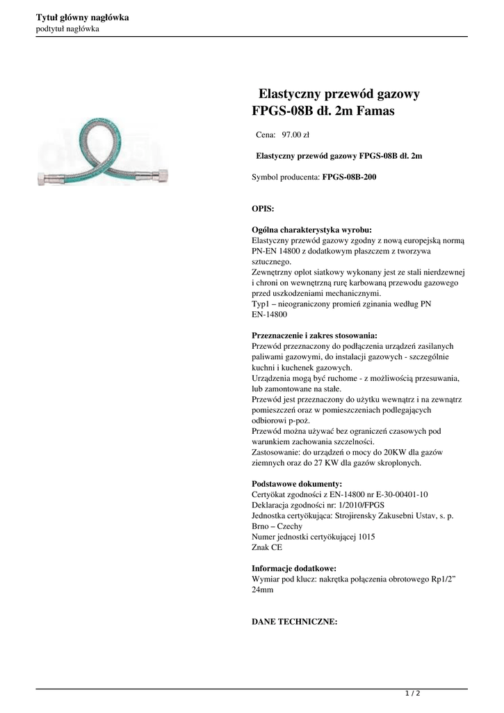 Tytuł główny nagłówka podtytuł nagłówka Elastyczny przewód gazowy FPGS-08B dł. 2m Famas Cena: 97.00 zł Elastyczny przewód gazowy FPGS-08B dł. 2m Symbol producenta: FPGS-08B-200 OPIS: Ogólna charakterystyka wyrobu: Elastyczny przewód gazowy zgodny z nową europejską normą PN-EN 14800 z dodatkowym płaszczem z tworzywa sztucznego. Zewnętrzny oplot siatkowy wykonany jest ze stali nierdzewnej i chroni on wewnętrzną rurę karbowaną przewodu gazowego przed uszkodzeniami mechanicznymi. Typ1 – nieograniczony promień zginania według PN EN-14800 Przeznaczenie i zakres stosowania: Przewód przeznaczony do podłączenia urządzeń zasilanych paliwami gazowymi, do instalacji gazowych - szczególnie kuchni i kuchenek gazowych. Urządzenia mogą być ruchome - z możliwością przesuwania, lub zamontowane na stałe. Przewód jest przeznaczony do użytku wewnątrz i na zewnątrz pomieszczeń oraz w pomieszczeniach podlegających odbiorowi p-poż. Przewód można używać bez ograniczeń czasowych pod warunkiem zachowania szczelności. Zastosowanie: do urządzeń o mocy do 20KW dla gazów ziemnych oraz do 27 KW dla gazów skroplonych. Podstawowe dokumenty: Certyökat zgodności z EN-14800 nr E-30-00401-10 Deklaracja zgodności nr: 1/2010/FPGS Jednostka certyökująca: Strojirensky Zakusebni Ustav, s. p. Brno – Czechy Numer jednostki certyökującej 1015 Znak CE Informacje dodatkowe: Wymiar pod klucz: nakrętka połączenia obrotowego Rp1/2” 24mm DANE TECHNICZNE: 1/2 Tytuł główny nagłówka podtytuł nagłówka Max. ciśnienie robocze: 0,5 bar Temperatura użytkowa: 60°C Promień gięcia: nieograniczony Zalecany minimalny promień gięcia w czasie użytkowania: 50 mm Przepustowość nominalna: 1,6 m³/h wg PN-EN 14800 Odporność na ogień: 650°C / 30min Reakcja na ogień: Klasa B-s1, d0 Rodzaj gazu: E; Ls; Lw; P; B; B/P Wąż wewnętrzny falisty: Materiał: 1.4541 Średnica wewnętrzna: DN 12 Oplot siatkowy: Materiał: 1.4301 Zakończenie I – nakrętka obrotowa G 1/2": Materiał: mosiądz Pokrycie: powłoka niklowa Zakończenie II – nakrętka połączenia obrotowego Rp 1/2": Materiał: mosiądz Pokrycie: powłoka niklowa Powłoka PVC: Grubość powłoki: 0,5 – 1,0 mm Uszczelka płaska 1/2": Materiał: NBR 80A Uwagi: Połączenie obrotowe umożliwia obrót przewodu bez utraty szczelności. 2/2 Powered by TCPDF (www.tcpdf.org)