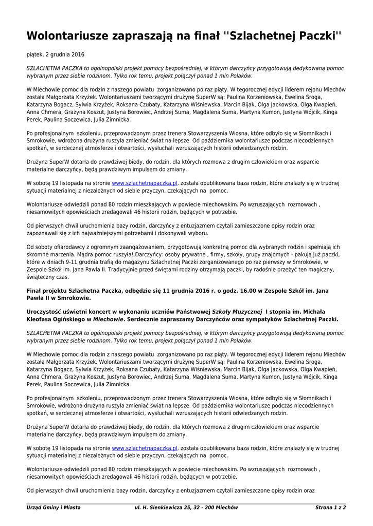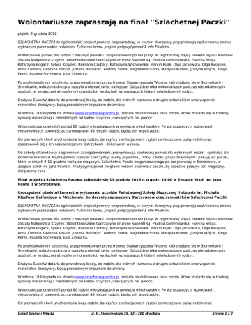 Wolontariusze zapraszają na finał ''Szlachetnej Paczki'' piątek, 2 grudnia 2016 SZLACHETNA PACZKA to ogólnopolski projekt pomocy bezpośredniej, w którym darczyńcy przygotowują dedykowaną pomoc wybranym przez siebie rodzinom. Tylko rok temu, projekt połączył ponad 1 mln Polaków. W Miechowie pomoc dla rodzin z naszego powiatu zorganizowano po raz piąty. W tegorocznej edycji liderem rejonu Miechów została Małgorzata Krzyżek. Wolontariuszami tworzącymi drużynę SuperW są: Paulina Korzeniowska, Ewelina Sroga, Katarzyna Bogacz, Sylwia Krzyżek, Roksana Czubaty, Katarzyna Wiśniewska, Marcin Bijak, Olga Jackowska, Olga Kwapień, Anna Chmera, Grażyna Koszut, Justyna Borowiec, Andrzej Suma, Magdalena Suma, Martyna Kumon, Justyna Wójcik, Kinga Perek, Paulina Soczewica, Julia Zimnicka. Po profesjonalnym szkoleniu, przeprowadzonym przez trenera Stowarzyszenia Wiosna, które odbyło się w Słomnikach i Smrokowie, wdrożona drużyna ruszyła zmieniać świat na lepsze. Od października wolontariusze podczas niecodziennych spotkań, w serdecznej atmosferze i otwartości, wysłuchali wzruszających historii odwiedzanych rodzin. Drużyna SuperW dotarła do prawdziwej biedy, do rodzin, dla których rozmowa z drugim człowiekiem oraz wsparcie materialne darczyńcy, będą prawdziwym impulsem do zmiany. W sobotę 19 listopada na stronie www.szlachetnapaczka.pl. została opublikowana baza rodzin, które znalazły się w trudnej sytuacji materialnej z niezależnych od siebie przyczyn, czekających na pomoc. Wolontariusze odwiedzili ponad 80 rodzin mieszkających w powiecie miechowskim. Po wzruszających rozmowach , niesamowitych opowieściach zredagowali 46 historii rodzin, będących w potrzebie. Od pierwszych chwil uruchomienia bazy rodzin, darczyńcy z entuzjazmem czytali zamieszczone opisy rodzin oraz zapoznawali się z ich najważniejszymi potrzebami i dokonywali wyboru. Od soboty ofiarodawcy z ogromnym zaangażowaniem, przygotowują konkretną pomoc dla wybranych rodzin i spełniają ich skromne marzenia. Mądra pomoc ruszyła! Darczyńcy: osoby prywatne , firmy, szkoły, grupy znajomych - pakują już paczki, które w dniach 9-11 grudnia trafią do magazynu Szlachetnej Paczki zorganizowanego po raz pierwszy w Smrokowie, w Zespole Szkół im. Jana Pawła II. Tradycyjnie przed świętami rodziny otrzymają paczki, by radośnie przeżyć ten magiczny, świąteczny czas. Finał projektu Szlachetna Paczka, odbędzie się 11 grudnia 2016 r. o godz. 16.00 w Zespole Szkół im. Jana Pawła II w Smrokowie. Uroczystość uświetni koncert w wykonaniu uczniów Państwowej Szkoły Muzycznej I stopnia im. Michała Kleofasa Ogińskiego w Miechowie. Serdecznie zapraszamy Darczyńców oraz sympatyków Szlachetnej Paczki. SZLACHETNA PACZKA to ogólnopolski projekt pomocy bezpośredniej, w którym darczyńcy przygotowują dedykowaną pomoc wybranym przez siebie rodzinom. Tylko rok temu, projekt połączył ponad 1 mln Polaków. W Miechowie pomoc dla rodzin z naszego powiatu zorganizowano po raz piąty. W tegorocznej edycji liderem rejonu Miechów została Małgorzata Krzyżek. Wolontariuszami tworzącymi drużynę SuperW są: Paulina Korzeniowska, Ewelina Sroga, Katarzyna Bogacz, Sylwia Krzyżek, Roksana Czubaty, Katarzyna Wiśniewska, Marcin Bijak, Olga Jackowska, Olga Kwapień, Anna Chmera, Grażyna Koszut, Justyna Borowiec, Andrzej Suma, Magdalena Suma, Martyna Kumon, Justyna Wójcik, Kinga Perek, Paulina Soczewica, Julia Zimnicka. Po profesjonalnym szkoleniu, przeprowadzonym przez trenera Stowarzyszenia Wiosna, które odbyło się w Słomnikach i Smrokowie, wdrożona drużyna ruszyła zmieniać świat na lepsze. Od października wolontariusze podczas niecodziennych spotkań, w serdecznej atmosferze i otwartości, wysłuchali wzruszających historii odwiedzanych rodzin. Drużyna SuperW dotarła do prawdziwej biedy, do rodzin, dla których rozmowa z drugim człowiekiem oraz wsparcie materialne darczyńcy, będą prawdziwym impulsem do zmiany. W sobotę 19 listopada na stronie www.szlachetnapaczka.pl. została opublikowana baza rodzin, które znalazły się w trudnej sytuacji materialnej z niezależnych od siebie przyczyn, czekających na pomoc. Wolontariusze odwiedzili ponad 80 rodzin mieszkających w powiecie miechowskim. Po wzruszających rozmowach , niesamowitych opowieściach zredagowali 46 historii rodzin, będących w potrzebie. Od pierwszych chwil uruchomienia bazy rodzin, darczyńcy z entuzjazmem czytali zamieszczone opisy rodzin oraz Urząd Gminy i Miasta ul. H. Sienkiewicza 25, 32 - 200 Miechów Strona 1 z 2 zapoznawali się z ich najważniejszymi potrzebami i dokonywali wyboru. Od soboty ofiarodawcy z ogromnym zaangażowaniem, przygotowują konkretną pomoc dla wybranych rodzin i spełniają ich skromne marzenia. Mądra pomoc ruszyła! Darczyńcy: osoby prywatne , firmy, szkoły, grupy znajomych - pakują już paczki, które w dniach 9-11 grudnia trafią do magazynu Szlachetnej Paczki zorganizowanego po raz pierwszy w Smrokowie, w Zespole Szkół im. Jana Pawła II. Tradycyjnie przed świętami rodziny otrzymają paczki, by radośnie przeżyć ten magiczny, świąteczny czas. Finał projektu Szlachetna Paczka, odbędzie się 11 grudnia 2016 r. o godz. 16.00 w Zespole Szkół im. Jana Pawła II w Smrokowie. Uroczystość uświetni koncert w wykonaniu uczniów Państwowej Szkoły Muzycznej I stopnia im. Michała Kleofasa Ogińskiego w Miechowie. Serdecznie zapraszamy Darczyńców oraz sympatyków Szlachetnej Paczki. Tekst pochodzi ze strony: http://www.miechow.eu/miasto-i-gmina/aktualnosci/wolontariusze-zapraszaja-na-final-szlachetnej-paczki/ Urząd Gminy i Miasta ul. H. Sienkiewicza 25, 32 - 200 Miechów Strona 2 z 2