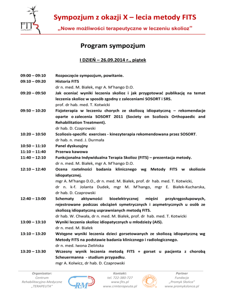 Sympozjum z okazji X – lecia metody FITS „Nowe możliwości terapeutyczne w leczeniu skolioz” Program sympozjum I DZIEŃ – 26.09.2014 r., piątek 09:00 – 09:10 09:10 – 09:20 09:20 – 09:50 09:50 – 10:20 10:20 – 10:50 10:50 – 11:10 11:10 – 11:40 11:40 – 12:10 12:10 – 12:40 12:40 – 13:00 13:00 – 13:10 13:10 – 13:20 13:20 – 13:30 Rozpoczęcie sympozjum, powitanie. Historia FITS dr n. med. M. Białek, mgr A. M’hango D.O. Jak oceniać wyniki leczenia skolioz i jak przygotować publikację na temat leczenia skolioz w sposób zgodny z zaleceniami SOSORT i SRS. prof. dr hab. med. T. Kotwicki Fizjoterapia w leczeniu chorych ze skoliozą idiopatyczną – rekomendacje oparte o zalecenia SOSORT 2011 (Society on Scoliosis Orthopaedic and Rehabilitation Treatment). dr hab. D. Czaprowski Scoliosis-specific exercises - kinezyterapia rekomendowana przez SOSORT. dr hab. n. med. J. Durmała Panel dyskusyjny Przerwa kawowa Funkcjonalna Indywidualna Terapia Skolioz (FITS) – prezentacja metody. dr n. med. M. Białek, mgr A. M’hango D.O. Ocena rzetelności badania klinicznego wg Metody FITS w skoliozie idiopatycznej. mgr A. M’hango D.O., dr n. med. M. Białek, prof. dr hab. med. T. Kotwicki, dr n. k-f. Jolanta Dudek, mgr M. M’hango, mgr E. Białek-Kucharska, dr hab. D. Czaprowski Schematy aktywności bioelektrycznej mięśni przykręgosłupowych, rejestrowane podczas obciążeń symetrycznych i asymetrycznych u osób ze skoliozą idiopatyczną usprawnianych metodą FITS. dr hab. W. Chwała, dr n. med. M. Białek, prof. dr hab. med. T. Kotwicki Wyniki leczenia skolioz idiopatycznych u młodzieży (AIS). dr n. med. M. Białek Wstępne wyniki leczenia dzieci gorsetowanych ze skoliozą idiopatyczną wg Metody FITS na podstawie badania klinicznego i radiologicznego. dr n. med. Iwona Zielińska Wczesny wynik leczenia metodą FITS + gorset u pacjenta z chorobą Scheuermanna - studium przypadku. mgr A. Kolwicz, dr hab. D. Czaprowski Organizator: Centrum Rehabilitacyjno-Medyczne „TERAPEUTA” Kontakt: tel. 722-380-727 www.fits.pl www.crmterapeuta.pl Partner Fundacja „Promyk Słońca” www.promykslonca.pl Sympozjum z okazji X – lecia metody FITS „Nowe możliwości terapeutyczne w leczeniu skolioz” 13:30 – 13:40 13:40 – 14:00 14:00 – 15:00 15:00 – 15:20 15:20 – 15:30 15:30 – 15:40 15:40 – 15:50 15:50 – 16:00 16:00 – 16:10 16:10 – 16:20 16:20 – 16:40 16:40 – 17:00 17:00 – 17:10 17:10 20:00 Wyniki leczenia skolioz idiopatycznych u dzieci (EOIS). dr n. med. M. Białek Panel dyskusyjny Przerwa obiadowa Wpływ skoliozy idiopatycznej na stereotyp chodu u osób usprawnianych metodą FITS, w oparciu o kinematyczną analizę 3D. dr hab. W. Chwała, dr n. med. M. Białek, dr inż. P. Maciejasz Wczesne wyniki leczenia zachowawczego pacjentki z progresywną skoliozą idiopatyczną – opis przypadku. mgr J. Leszczewska, dr hab. D. Czaprowski Trójpłaszczyznowe efekty terapii FITS + gorset u pacjentki ze skoliozą i plecami okrągło- wklęsłymi – studium przypadku. dr n. med. M. Białek, prof. dr hab. med. T. Kotwicki, mgr E. Białek-Kucharska Zastosowanie metody FITS w zachowawczym leczeniu skolioz - studium przypadku. mgr A. Skowron, lek. med. A. Kloc, mgr M. Żyła, dr n. med. M. Białek Opis przypadku skoliozy leczonej metodą FITS. mgr S. Piorun, mgr M. Augustyn Poprawa radiologiczna i kliniczna (FITS + gorset) pacjentki ze skoliozą po przebytej operacji z powodu jamistości rdzenia kręgowego – studium przypadku. dr n. med. M. Białek, mgr E. Białek-Kucharska Ocena wyników terapii skolioz idiopatycznych nie gorsetowanych w wieku 10 15 lat prowadzonych Metodą Funkcjonalnej Indywidualnej Terapii Skolioz. mgr A. Skowron, lek. med. A. Kloc, mgr M. Żyła Zaburzenia czynności kluczowych rejonów narządu ruchu u dzieci ze skoliozą. Doświadczenia własne, przegląd literatury. mgr M. Tomczak, mgr B. Dampc Panel dyskusyjny Podsumowanie pierwszego dnia sympozjum, zakończenie. dr n. med. M. Białek, mgr A. M’hango D.O. SPA (dla gości hotelowych). Biesiada przy ognisku (zabawa z wodzirejem). Organizator: Centrum Rehabilitacyjno-Medyczne „TERAPEUTA” Kontakt: tel. 722-380-727 www.fits.pl www.crmterapeuta.pl Partner Fundacja „Promyk Słońca” www.promykslonca.pl Sympozjum z okazji X – lecia metody FITS „Nowe możliwości terapeutyczne w leczeniu skolioz” II DZIEŃ – 27.09.2014 r., sobota 10:00 – 10:45 10:45 – 11:30 11:30 – 12:00 12:00 – 12:45 12:45 – 13:15 13:15 – 13:30 13:30 - 13:45 14:30 – 16:00 Warsztaty Terapii FITS: Techniki uwalniania klatki piersiowej u pacjentów ze skoliozą. Warsztaty dla osób po kursie FITS. Zwiększanie "shift'u" w stronę korekcji - praca na taśmach mięśniowopowięziowych, wzorce korekcyjne. Warsztaty dla osób bez kursu FITS. Panel dyskusyjny Przerwa kawowa Terapia FITS z punktu widzenia dzieci i rodziców Pokaz multimedialny dot. Turnusów Rehabilitacyjnych i Kursów Terapii FITS Panel dyskusyjny Podsumowanie i zakończenie sympozjum. dr n. med. M. Białek, mgr A. M’hango D.O. Diagnostyka skolioz wg Metody FITS – wprowadzenie. dr n. med. M. Białek, mgr A. M’hango D.O. Bezpłatne warsztaty dla lekarzy. Organizator: Centrum Rehabilitacyjno-Medyczne „TERAPEUTA” Kontakt: tel. 722-380-727 www.fits.pl www.crmterapeuta.pl Partner Fundacja „Promyk Słońca” www.promykslonca.pl