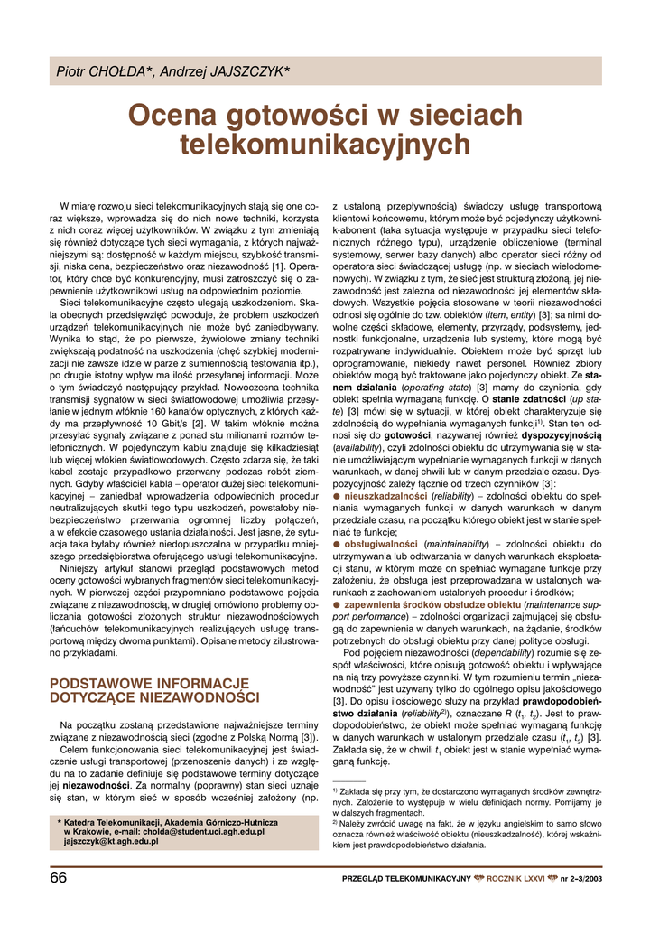 Piotr CHOŁDA*, Andrzej JAJSZCZYK* Ocena gotowości w sieciach telekomunikacyjnych W miarę rozwoju sieci telekomunikacyjnych stają się one coraz większe, wprowadza się do nich nowe techniki, korzysta z nich coraz więcej użytkowników. W związku z tym zmieniają się również dotyczące tych sieci wymagania, z których najważniejszymi są: dostępność w każdym miejscu, szybkość transmisji, niska cena, bezpieczeństwo oraz niezawodność [1]. Operator, który chce być konkurencyjny, musi zatroszczyć się o zapewnienie użytkownikowi usług na odpowiednim poziomie. Sieci telekomunikacyjne często ulegają uszkodzeniom. Skala obecnych przedsięwzięć powoduje, że problem uszkodzeń urządzeń telekomunikacyjnych nie może być zaniedbywany. Wynika to stąd, że po pierwsze, żywiołowe zmiany techniki zwiększają podatność na uszkodzenia (chęć szybkiej modernizacji nie zawsze idzie w parze z sumiennością testowania itp.), po drugie istotny wpływ ma ilość przesyłanej informacji. Może o tym świadczyć następujący przykład. Nowoczesna technika transmisji sygnałów w sieci światłowodowej umożliwia przesyłanie w jednym włóknie 160 kanałów optycznych, z których każdy ma przepływność 10 Gbit/s [2]. W takim włóknie można przesyłać sygnały związane z ponad stu milionami rozmów telefonicznych. W pojedynczym kablu znajduje się kilkadziesiąt lub więcej włókien światłowodowych. Często zdarza się, że taki kabel zostaje przypadkowo przerwany podczas robót ziemnych. Gdyby właściciel kabla – operator dużej sieci telekomunikacyjnej – zaniedbał wprowadzenia odpowiednich procedur neutralizujących skutki tego typu uszkodzeń, powstałoby niebezpieczeństwo przerwania ogromnej liczby połączeń, a w efekcie czasowego ustania działalności. Jest jasne, że sytuacja taka byłaby również niedopuszczalna w przypadku mniejszego przedsiębiorstwa oferującego usługi telekomunikacyjne. Niniejszy artykuł stanowi przegląd podstawowych metod oceny gotowości wybranych fragmentów sieci telekomunikacyjnych. W pierwszej części przypomniano podstawowe pojęcia związane z niezawodnością, w drugiej omówiono problemy obliczania gotowości złożonych struktur niezawodnościowych (łańcuchów telekomunikacyjnych realizujących usługę transportową między dwoma punktami). Opisane metody zilustrowano przykładami. PODSTAWOWE INFORMACJE DOTYCZĄCE NIEZAWODNOŚCI Na początku zostaną przedstawione najważniejsze terminy związane z niezawodnością sieci (zgodne z Polską Normą [3]). Celem funkcjonowania sieci telekomunikacyjnej jest świadczenie usługi transportowej (przenoszenie danych) i ze względu na to zadanie definiuje się podstawowe terminy dotyczące jej niezawodności. Za normalny (poprawny) stan sieci uznaje się stan, w którym sieć w sposób wcześniej założony (np. * Katedra Telekomunikacji, Akademia Górniczo-Hutnicza w Krakowie, e-mail: [email protected] [email protected] 66 z ustaloną przepływnością) świadczy usługę transportową klientowi końcowemu, którym może być pojedynczy użytkownik-abonent (taka sytuacja występuje w przypadku sieci telefonicznych różnego typu), urządzenie obliczeniowe (terminal systemowy, serwer bazy danych) albo operator sieci różny od operatora sieci świadczącej usługę (np. w sieciach wielodomenowych). W związku z tym, że sieć jest strukturą złożoną, jej niezawodność jest zależna od niezawodności jej elementów składowych. Wszystkie pojęcia stosowane w teorii niezawodności odnosi się ogólnie do tzw. obiektów (item, entity) [3]; sa nimi dowolne części składowe, elementy, przyrządy, podsystemy, jednostki funkcjonalne, urządzenia lub systemy, które mogą być rozpatrywane indywidualnie. Obiektem może być sprzęt lub oprogramowanie, niekiedy nawet personel. Również zbiory obiektów mogą być traktowane jako pojedynczy obiekt. Ze stanem działania (operating state) [3] mamy do czynienia, gdy obiekt spełnia wymaganą funkcję. O stanie zdatności (up state) [3] mówi się w sytuacji, w której obiekt charakteryzuje się zdolnością do wypełniania wymaganych funkcji1). Stan ten odnosi się do gotowości, nazywanej również dyspozycyjnością (availability), czyli zdolności obiektu do utrzymywania się w stanie umożliwiającym wypełnianie wymaganych funkcji w danych warunkach, w danej chwili lub w danym przedziale czasu. Dyspozycyjność zależy łącznie od trzech czynników [3]: M nieuszkadzalności (reliability) – zdolności obiektu do spełniania wymaganych funkcji w danych warunkach w danym przedziale czasu, na początku którego obiekt jest w stanie spełniać te funkcje; M obsługiwalności (maintainability) – zdolności obiektu do utrzymywania lub odtwarzania w danych warunkach eksploatacji stanu, w którym może on spełniać wymagane funkcje przy założeniu, że obsługa jest przeprowadzana w ustalonych warunkach z zachowaniem ustalonych procedur i środków; M zapewnienia środków obsłudze obiektu (maintenance support performance) – zdolności organizacji zajmującej się obsługą do zapewnienia w danych warunkach, na żądanie, środków potrzebnych do obsługi obiektu przy danej polityce obsługi. Pod pojęciem niezawodności (dependability) rozumie się zespół właściwości, które opisują gotowość obiektu i wpływające na nią trzy powyższe czynniki. W tym rozumieniu termin „niezawodność” jest używany tylko do ogólnego opisu jakościowego [3]. Do opisu ilościowego służy na przykład prawdopodobieństwo działania (reliability2)), oznaczane R (t1, t2). Jest to prawdopodobieństwo, że obiekt może spełniać wymaganą funkcję w danych warunkach w ustalonym przedziale czasu (t1, t2) [3]. Zakłada się, że w chwili t1 obiekt jest w stanie wypełniać wymaganą funkcję. –––––––– 1) Zakłada się przy tym, że dostarczono wymaganych środków zewnętrznych. Założenie to występuje w wie