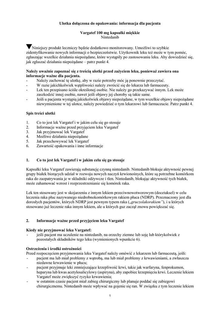 Ulotka dołączona do opakowania: informacja dla pacjenta Vargatef 100 mg kapsułki miękkie Nintedanib Niniejszy produkt leczniczy będzie dodatkowo monitorowany. Umożliwi to szybkie zidentyfikowanie nowych informacji o bezpieczeństwie. Użytkownik leku też może w tym pomóc, zgłaszając wszelkie działania niepożądane, które wystąpiły po zastosowaniu leku. Aby dowiedzieć się, jak zgłaszać działania niepożądane – patrz punkt 4. Należy uważnie zapoznać się z treścią ulotki przed zażyciem leku, ponieważ zawiera ona informacje ważne dla pacjenta. Należy zachować tę ulotkę, aby w razie potrzeby móc ją ponownie przeczytać. W razie jakichkolwiek wątpliwości należy zwrócić się do lekarza lub farmaceuty. Lek ten przepisano ściśle określonej osobie. Nie należy go przekazywać innym. Lek może zaszkodzić innej osobie, nawet jeśli objawy jej choroby są takie same. Jeśli u pacjenta wystąpią jakiekolwiek objawy niepożądane, w tym wszelkie objawy niepożądane niewymienione w tej ulotce, należy powiedzieć o tym lekarzowi lub farmaceucie. Patrz punkt 4. Spis treści ulotki 1. 2. 3. 4. 5. 6. Co to jest lek Vargatef i w jakim celu się go stosuje Informacje ważne przed przyjęciem leku Vargatef Jak przyjmować lek Vargatef Możliwe działania niepożądane Jak przechowywać lek Vargatef Zawartość opakowania i inne informacje 1. Co to jest lek Vargatef i w jakim celu się go stosuje Kapsułki leku Vargatef zawierają substancję czynną nintedanib. Nintedanib blokuje aktywność pewnej grupy białek biorących udział w rozwoju nowych naczyń krwionośnych, które są potrzebne komórkom raka do zaopatrywania je w składniki odżywcze i tlen. Nintedanib, blokując aktywność tych białek, może zahamować wzrost i rozprzestrzenianie się komórek raka. Lek ten stosowany jest w skojarzeniu z innym lekiem przeciwnowotworowym (docetaksel) w celu leczenia raka płuc nazywanego niedrobnokomórkowym rakiem płuca (NDRP). Przeznaczony jest dla dorosłych pacjentów, których NDRP jest pewnym typem raka („gruczolakorakiem”), i u których stosowano już leczenie raka innym lekiem, ale u których guz zaczął znowu powiększać się. 2. Informacje ważne przed przyjęciem leku Vargatef Kiedy nie przyjmować leku Vargatef: jeśli pacjent ma uczulenie na nintedanib, na orzechy ziemne lub soję lub którykolwiek z pozostałych składników tego leku (wymienionych wpunkcie 6). Ostrzeżenia i środki ostrożności Przed rozpoczęciem przyjmowania leku Vargatef należy omówić z lekarzem lub farmaceutą, jeśli: pacjent ma lub miał problemy z wątrobą, ma lub miał problemy z krwawieniami, a zwłaszcza niedawne krwawienie w płucu; pacjent przyjmuje leki zmniejszające krzepliwość krwi, takie jak warfaryna, fenprokumon, heparyna lub kwas acetylosalicylowy (aspiryna), aby zapobiec krzepnięciu krwi. Leczenie lekiem Vargatef może zwiększyć ryzyko krwawienia; w ostatnim czasie pacjent miał zabieg chirurgiczny lub planuje poddać się zabiegowi chirurgicznemu. Nintedanib może wpływać na gojenie się ran. W związku z tym leczenie lekiem 1 - Vargatef jest zwykle przerywane, jeśli pacjent zostaje poddany operacji. Lekarz zdecyduje kiedy należy wznowić leczenie tym lekiem; pacjent ma raka z przerzutami do mózgu. Biorąc pod uwagę te informacje, lekarz może przeprowadzić badania krwi, na przykład w celu sprawdzenia czynności wątroby lub sprawdzenia jak szybko krew krzepnie. Lekarz omówi z pacjentem wyniki tych badań i zdecyduje, czy pacjentowi można podać lek Vargatef. Należy niezwłocznie powiadomić lekarza, jeśli podczas przyjmowania tego leku u pacjenta wystąpi biegunka. Ważne jest leczenie biegunki natychmiast po wystąpieniu pierwszych objawów (patrz punkt 4); u pacjenta wystąpi gorączka, ponieważ może to być objaw gorączki neutropenicznej lub posocznicy (patrz punkt 4); u pacjenta wystąpi silny ból w okolicy żołądka, gorączka, dreszcze, mdłości, wymioty lub twardy brzuch lub wzdęcie, ponieważ mogą to być objawy powstania otworu w ścianie jelita (perforacji przewodu pokarmowego); u pacjenta wystąpi ból, obrzęk, zaczerwienienie i wzrost temperatury kończyny, ponieważ mogą to być objawy powstania skrzepu krwi w jednej z żył; u pacjenta wystąpi poważne krwawienie; u pacjenta wystąpi ucisk lub ból w klatce piersiowej, typowo po lewej stronie ciała, ból w szyi, żuchwie, ramieniu lub ręce, szybkie bicie serca, duszność, nudności, wymioty, ponieważ mogą być to objawy zawału serca; którekolwiek działanie niepożądane, jakie może wystąpić u pacjenta (patrz punkt 4) stanie się poważne. Dzieci i młodzież Lek ten nie był badany u dzieci i młodzieży w związku z czym nie jest przewidziany do przyjmowania przez dzieci i młodzież w wieku poniżej 18 lat. Vargatef a inne leki Należy powiedzieć lekarzowi lub farmaceucie o wszystkich lekach przyjmowanych przez pacjenta obecnie lub ostatnio, a także o lekach, które pacjent planuje przyjmować, w tym z produktami ziołowymi i lekami dostępnymi bez recepty. Lek ten może wchodzić w interakcje z pewnymi innymi lekami. Następujące leki mogą zwiększyć stężenie we krwi nintedanibu, substancji czynnej leku Vargatef, i tym samym mogą zwiększyć ryzyko działań niepożądanych (patrz punkt 4): ketokonazol (lek stosowany w leczeniu zakażeń grzybiczych); erytromycyna (lek stosowany w leczeniu zakażeń bakteryjnych). Następujące leki mogą zmniejszyć stężenie nintedanibu we krwi, i tym samym zmniejszyć skuteczność leku Vargatef: ryfampicyna (antybiotyk stosowany w leczeniu gruźlicy); karbamazepina, fenytoina (leki stosowane w leczeniu napadów padaczkowych); ziele dziurawca (produkt ziołowy stosowany w leczeniu depresji). Ciąża Jeśli pacjentka jest w ciąży lub karmi piersią, przypuszcza, że może być w ciąży lub gdy planuje mieć dziecko, powinna poradzić się lekarza lub farmaceuty przed zastosowaniem tego leku. 