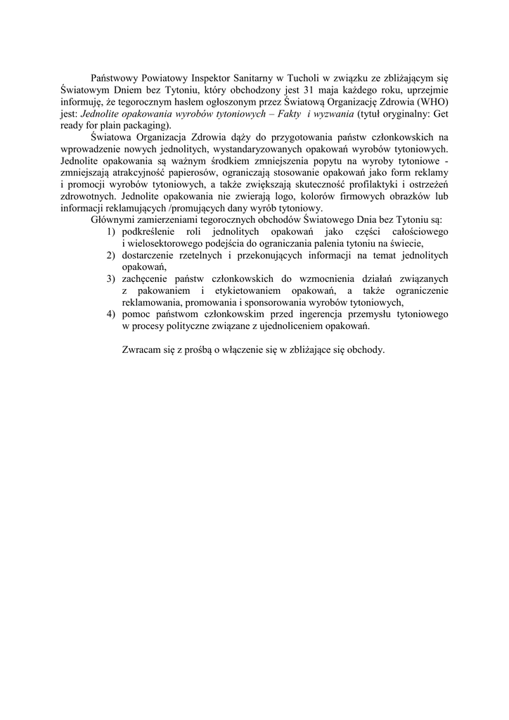 Państwowy Powiatowy Inspektor Sanitarny w Tucholi w związku ze zbliżającym się Światowym Dniem bez Tytoniu, który obchodzony jest 31 maja każdego roku, uprzejmie informuję, że tegorocznym hasłem ogłoszonym przez Światową Organizację Zdrowia (WHO) jest: Jednolite opakowania wyrobów tytoniowych – Fakty i wyzwania (tytuł oryginalny: Get ready for plain packaging). Światowa Organizacja Zdrowia dąży do przygotowania państw członkowskich na wprowadzenie nowych jednolitych, wystandaryzowanych opakowań wyrobów tytoniowych. Jednolite opakowania są ważnym środkiem zmniejszenia popytu na wyroby tytoniowe zmniejszają atrakcyjność papierosów, ograniczają stosowanie opakowań jako form reklamy i promocji wyrobów tytoniowych, a także zwiększają skuteczność profilaktyki i ostrzeżeń zdrowotnych. Jednolite opakowania nie zwierają logo, kolorów firmowych obrazków lub informacji reklamujących /promujących dany wyrób tytoniowy. Głównymi zamierzeniami tegorocznych obchodów Światowego Dnia bez Tytoniu są: 1) podkreślenie roli jednolitych opakowań jako części całościowego i wielosektorowego podejścia do ograniczania palenia tytoniu na świecie, 2) dostarczenie rzetelnych i przekonujących informacji na temat jednolitych opakowań, 3) zachęcenie państw członkowskich do wzmocnienia działań związanych z pakowaniem i etykietowaniem opakowań, a także ograniczenie reklamowania, promowania i sponsorowania wyrobów tytoniowych, 4) pomoc państwom członkowskim przed ingerencja przemysłu tytoniowego w procesy polityczne związane z ujednoliceniem opakowań. Zwracam się z prośbą o włączenie się w zbliżające się obchody.