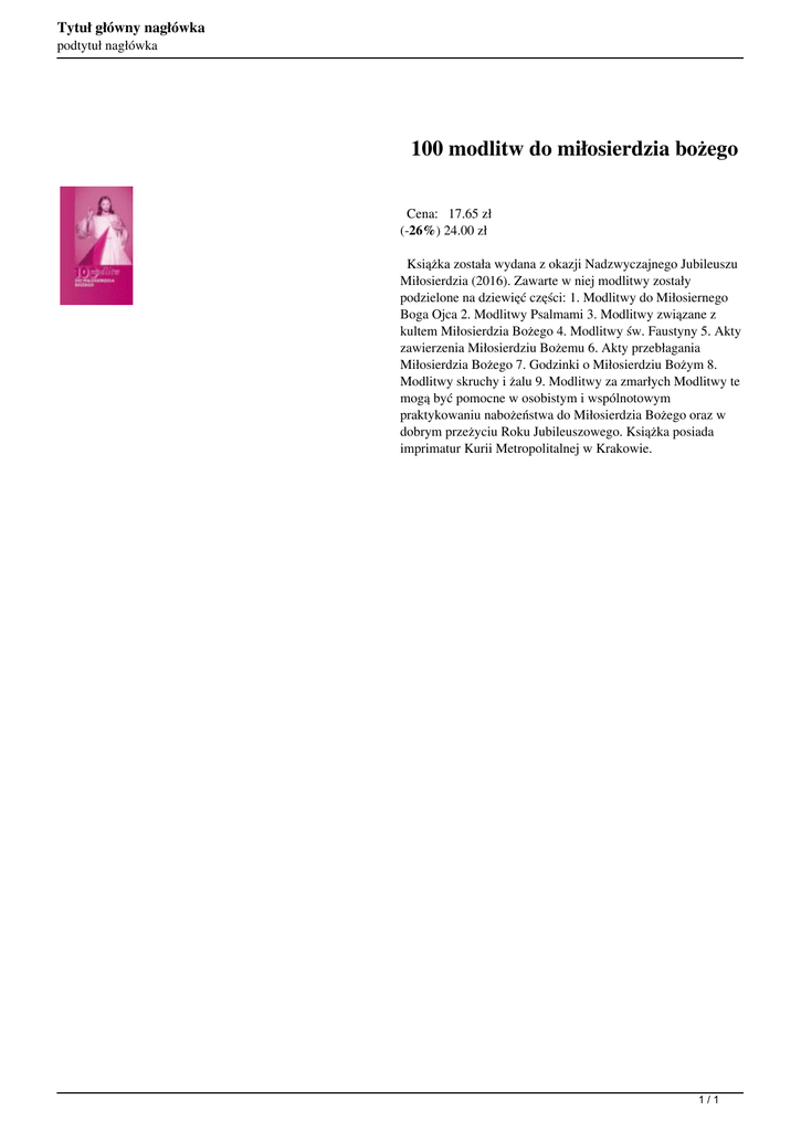 Tytuł główny nagłówka podtytuł nagłówka 100 modlitw do miłosierdzia bożego Cena: 17.65 zł (-26%) 24.00 zł Książka została wydana z okazji Nadzwyczajnego Jubileuszu Miłosierdzia (2016). Zawarte w niej modlitwy zostały podzielone na dziewięć części: 1. Modlitwy do Miłosiernego Boga Ojca 2. Modlitwy Psalmami 3. Modlitwy związane z kultem Miłosierdzia Bożego 4. Modlitwy św. Faustyny 5. Akty zawierzenia Miłosierdziu Bożemu 6. Akty przebłagania Miłosierdzia Bożego 7. Godzinki o Miłosierdziu Bożym 8. Modlitwy skruchy i żalu 9. Modlitwy za zmarłych Modlitwy te mogą być pomocne w osobistym i wspólnotowym praktykowaniu nabożeństwa do Miłosierdzia Bożego oraz w dobrym przeżyciu Roku Jubileuszowego. Książka posiada imprimatur Kurii Metropolitalnej w Krakowie. 1/1 Powered by TCPDF (www.tcpdf.org)