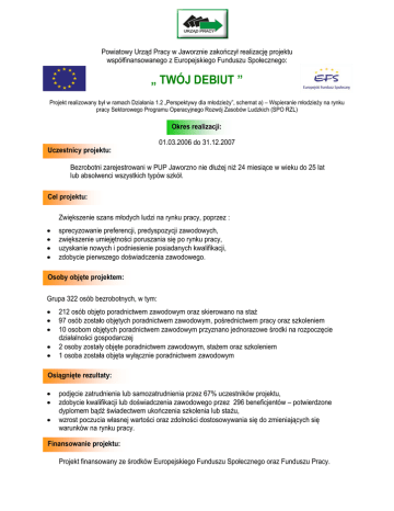 Powiatowy Urząd Pracy w Jaworznie zakończył realizację projektu współfinansowanego z Europejskiego Funduszu Społecznego: „ TWÓJ DEBIUT ” Projekt realizowany był w ramach Działania 1.2 „Perspektywy dla młodzieży”, schemat a) – Wspieranie młodzieży na rynku pracy Sektorowego Programu Operacyjnego Rozwój Zasobów Ludzkich (SPO RZL) Okres realizacji: Uczestnicy projektu: 01.03.2006 do 31.12.2007 Bezrobotni zarejestrowani w PUP Jaworzno nie dłużej niż 24 miesiące w wieku do 25 lat lub absolwenci wszystkich typów szkół. Cel projektu: Zwiększenie szans młodych ludzi na rynku pracy, poprzez : • • • • sprecyzowanie preferencji, predyspozycji zawodowych, zwiększenie umiejętności poruszania się po rynku pracy, uzyskanie nowych i podniesienie posiadanych kwalifikacji, zdobycie pierwszego doświadczenia zawodowego. Osoby objęte projektem: Grupa 322 osób bezrobotnych, w tym: • • • • • 212 osób objęto poradnictwem zawodowym oraz skierowano na staż 97 osób zostało objętych poradnictwem zawodowym, pośrednictwem pracy oraz szkoleniem 10 osobom objętych poradnictwem zawodowym przyznano jednorazowe środki na rozpoczęcie działalności gospodarczej 2 osoby zostały objęte poradnictwem zawodowym, stażem oraz szkoleniem 1 osoba została objęta wyłącznie poradnictwem zawodowym Osiągnięte rezultaty: • • • podjęcie zatrudnienia lub samozatrudnienia przez 67% uczestników projektu, zdobycie kwalifikacji lub doświadczenia zawodowego przez 296 beneficjentów – potwierdzone dyplomem bądź świadectwem ukończenia szkolenia lub stażu, wzrost poczucia własnej wartości oraz zdolności dostosowywania się do zmieniających się warunków na rynku pracy. Finansowanie projektu: Projekt finansowany ze środków Europejskiego Funduszu Społecznego oraz Funduszu Pracy.