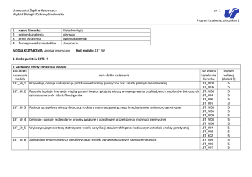 Uniwersytet Śląski w Katowicach Wydział Biologii i Ochrony Środowiska str. 1 Program kształcenia, załącznik nr 2 1. 2. 3. 4. nazwa kierunku poziom kształcenia profil kształcenia forma prowadzenia studiów Biotechnologia pierwszy ogólnoakademicki stacjonarne MODUŁ KSZTAŁCENIA: Analiza genetyczna Kod modułu: 1BT_50 1. Liczba punktów ECTS: 4 2. Zakładane efekty kształcenia modułu kod efektu kształcenia opis efektu kształcenia modułu 1BT_50_1 Przywołuje, opisuje i interpretuje podstawowe terminy genetyczne oraz zasady genetyki mendlowskiej 1BT_50_2 1BT_50_3 1BT_50_4 1BT_50_5 1BT_50_6 kod efektu kształcenia kierunku 1BT_W08 1BT_W06 Rozumie i opisuje interakcje między genami i wykorzystuje tę wiedzę w rozwiązywaniu przykładowych problemów dotyczących 1BT_W08 dziedziczenia cech i identyfikacji genów 1BT_U04 1BT_U06 1BT_U07 Posiada szczegółową wiedzę dotyczącą struktury materiału genetycznego i mechanizmów zmienności genetycznej 1BT_W08 1BT_W06 1BT_W09 Definiuje i opisuje molekularne procesy związane z przepływem oraz ekspresją informacji genetycznej 1BT_W08 1BT_W06 Wykorzystuje proste testy statystyczne w celu weryfikacji stawianych hipotez badawczych w trakcie analizy genetycznej 1BT_U04 1BT_U05 1BT_K02 Zbiera dane empiryczne oraz potrafi wyciągać wnioski z przeprowadzanych samodzielnie analiz 1BT_U04 1BT_U06 1BT_U07 stopień realizacji (skala 1-5) 5 5 5 5 5 3 5 5 5 5 5 5 5 5 5 5 3 Uniwersytet Śląski w Katowicach Wydział Biologii i Ochrony Środowiska str. 2 Program kształcenia, załącznik nr 2 3. Opis modułu Opis Wymagania wstępne modułu Moduł zapoznaje studenta z wiedzą z zakresu genetyki ogólnej i analizy genetycznej. W realizacji przedmiotu bazuje się na wiedzy zdobytej przez studentów w trakcie realizacji przedmiotu Podstawy genetyki i jest jego kontynuacją. Omawiane są podstawowe pojęcia genetyczne, zasady dziedziczenia, metody analizy genetycznej u roślinnych i zwierzęcych organizmów modelowych oraz molekularne mechanizmy leżące u podstaw procesów związanych z przepływem i ekspresją informacji genetycznej. Prezentowane są metody indukowania mutacji oraz różne mutageny oraz omawiana jest rola mutacji w analizie genetycznej. Prezentowane są metody rozróżniania i opisu rodzajów zmienności genetycznej oraz ich mechanizmy molekularne zarówno na poziomie organizmu, jak i populacji. Ćwiczenia umożliwiają analizę i interpretację problemów genetycznych z wykorzystaniem zwierzęcych i roślinnych organizmów modelowych, a w trakcie analizy genetyczne stosowane są testy statystyczne. Wiedza z zakresu podstaw genetyki 4. Sposoby weryfikacji efektów kształcenia modułu kod nazwa (typ) sposobu weryfikacji opis szczegółowy 1BT_50_w_1 Kolokwium 1BT_50_w_2 Ocena ciągła umiejętności praktycznych 1BT_50_w_3 Egzamin pisemny Kolokwia pisemne, sprawdzające stopień opanowania i zrozumienia omawianych zagadnień po każdym zakończonym bloku tematycznym. Umiejętności praktyczne oceniane na każdych zajęciach dotyczące obserwacji i opisu zmienności fenotypowej i genotypowej na różnych poziomach i klasyfikacji tej zmienności, przywoływanie i stosowanie reguł dziedziczenia do rozwiązywania problemów genetycznych Weryfikacja wiedzy przekazanej w trakcie wykładów i ćwiczeń, uzupełnionej zalecaną literaturę do przedmiotu. Warunkiem przystąpienia do egzaminu jest zaliczenie zajęć ćwiczeniowych efekt(-y) kształcenia modułu 1BT_50_1, 1BT_50_2, 1BT_50_3, 1BT_50_4, 1BT_50_5 1BT_50_1, 1BT_50_2, 1BT_50_3, 1BT_50_4, 1BT_50_5, 1BT_50_6 1BT_50_1, 1BT_50_2, 1BT_50_3, 1BT_50_4, 1BT_50_5 Uniwersytet Śląski w Katowicach Wydział Biologii i Ochrony Środowiska str. 3 Program kształcenia, załącznik nr 2 5. Formy prowadzenia zajęć nazwa forma prowadzenia zajęć opis (z uwzględnieniem metod dydaktycznych) Wykład ilustrowany przykładami z badań własnych i najnowszej literatury, z wykorzystaniem środków audiowizualnych prezentacje komputerowe w programie Power Point ilustrujące omawiane procesy. 1BT_50_fs_1 wykład 1BT_50_fs_2 laboratorium Praca pod nadzorem prowadzącego - przeprowadzanie obserwacji i rozwiązywanie problemów genetycznych konsultacje Dyskusja nad zagadnieniami zaproponowanymi przez studenta, wskazanie piśmiennictwa i źródeł internetowych suma godzin: liczba godzin 15 praca własna studenta opis przyswojenie wiedzy z wykładów; praca z podręcznikiem i z lekturą uzupełniająca liczba godzin 15 30 Przygotowanie do ćwiczeń laboratoryjnych - poznanie omawianych na ćwiczeniach zagadnień i zalecanej przez prowadzącego literatury przedmiotu, 30 45 suma godzin: 45 sposób weryfikacji efektów kształcenia punkty ECTS 1BT_50_w_3 1 1BT_50_w_1 1BT_50_w_2 1BT_50_w_3 3 suma punktów: 4