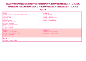 REPERTUAR XII MIĘDZYNARODOWYCH WARSZTATÓW SUZUKI W SZARLOCIE 26.07 - 01.08.2015r. REPERTOIRE FOR XII INTERNATIONAL SUZUKI WORKSHOP IN SZARLOTA 26.07 – 01.08.2015 CELLO BOOK I BOOK III S.Suzuki – Twinkle, Twinkle, Little Star Variations French folk Song Song of the Wind May Song S.Suzuki – Allegro S.Suzuki – Perpetual Motion H.Purcell – Rigadoon R.Schumann – Happy Farmer J.S.Bach – Minuet in C J.S.Bach – Minuet no.2 J.B.Lully – Gavotte C.Webster – Scherzo J.S.Bach – Gavotte in c minor A.Dvořák – Humoresque G.Marie – La cinquantaine BOOK II BOOK IV T.H.Bayly – Long, Long Ago C.M. von Weber – Hunters' Chorus J.S.Bach – March in G F.J.Gossec – Gavotte B.Marcello – Sonate in e minor P.Tchaikovsky – Chanson triste BOOK IV W.H.Squire – Danse rustique