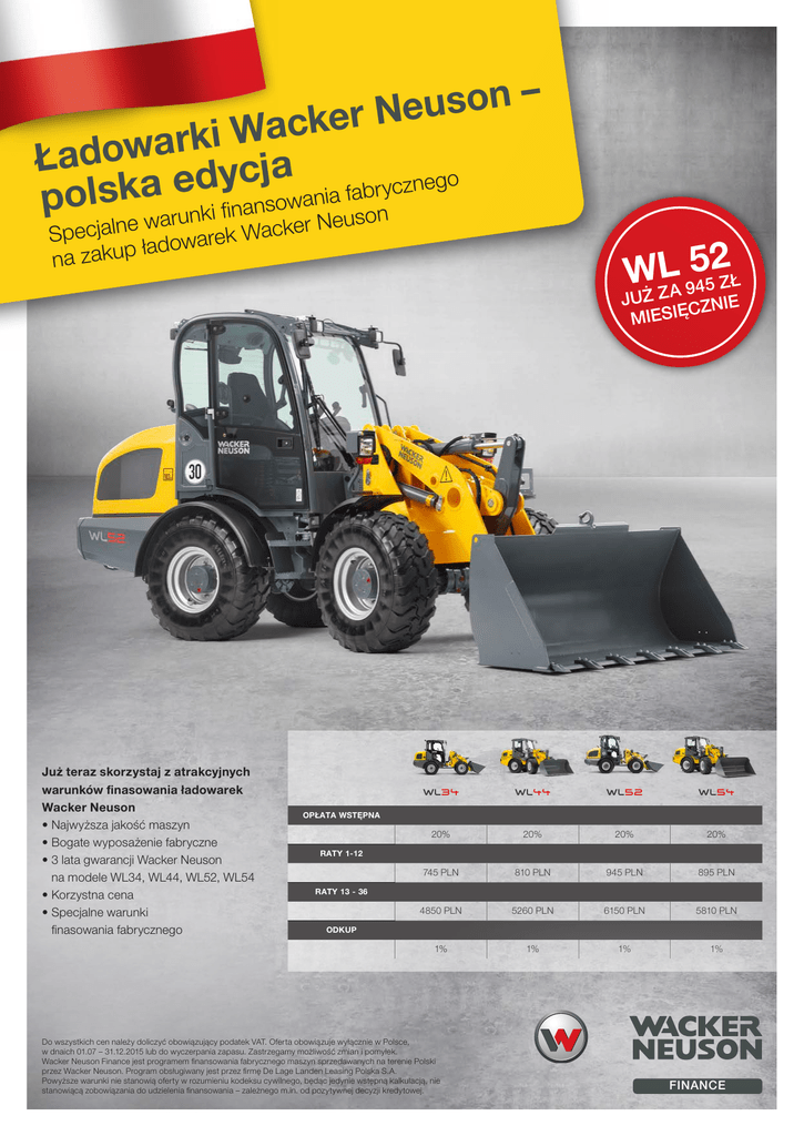 – n o s u e rN e k c a W i k r a w o d Ła ja c y d e cznego y r a b a k f s ia l wan po ki finanso n Neuso e warun Specjaln dowarek Wacker ła na zakup WŻ ZLA 95452ZŁ JU CZNIE MIESIĘ Już teraz skorzystaj z atrakcyjnych warunków finasowania ładowarek Wacker Neuson •N ajwyższa jakość maszyn •B ogate wyposażenie fabryczne •3 lata gwarancji Wacker Neuson na modele WL34, WL44, WL52, WL54 •K orzystna cena •S pecjalne warunki finasowania fabrycznego WL34 WL44 WL52 WL54 20% 20% 20% 20% 745 PLN 810 PLN 945 PLN 895 PLN 4850 PLN 5260 PLN 6150 PLN 5810 PLN 1% 1% 1% 1% OPŁATA WSTĘPNA RATY 1-12 RATY 13 - 36 ODKUP Do wszystkich cen należy doliczyć obowiązujący podatek VAT. Oferta obowiązuje wyłącznie w Polsce, w dnaich 01.07 – 31.12.2015 lub do wyczerpania zapasu. Zastrzegamy możliwość zmian i pomyłek. Wacker Neuson Finance jest programem finansowania fabrycznego maszyn sprzedawanych na terenie Polski przez Wacker Neuson. Program obsługiwany jest przez firmę De Lage Landen Leasing Polska S.A. Powyższe warunki nie stanowią oferty w rozumieniu kodeksu cywilnego, będąc jedynie wstępną kalkulacją, nie stanowiącą zobowiązania do udzielenia finansowania – zależnego m.in. od pozytywnej decyzji kredytowej. FINANCE ie n e ż a s o yp w e ł a n Dosko j pracy e d ż a owego k o d u dodatk Dokładne specyfikacje oraz dostępność opon i urządzeń dodatkowych różnią się w zależności od modelu. Przedstawiciel Wacker Neuson z przyjemnością udzieli Państwu wszystkich informacji. sprzęt o a m a g Szeroka Profilauswahl für Radlade Profilauswahl für Radlader Profil RP RP-Profil Profilauswahl für Radlader RP-Profil Region 101 Sprzedaż Maszyn Tel. 604 91 85 53 Serwis, Wynajem Tel. 22 490 42 00 Region 403 Sprzedaż Maszyn Tel. 602 14 78 85 Serwis, Wynajem Tel. 12 378 40 04 Region 801 Sprzedaż Maszyn Tel. 602 57 95 16 Serwis, Wynajem Tel. 58 309 11 02 Region 102 Sprzedaż Maszyn Tel. 602 31 90 66 Serwis, Wynajem Tel. 22 490 42 00 Region 501 Sprzedaż Maszyn Tel. 604 44 80 22 Serwis, Wynajem Tel. 71 399 18 88 Region 802 Sprzedaż Maszyn Tel. 604 12 87 28 Serwis, Wynajem Tel. 56 657 20 03 Region 401 Sprzedaż Maszyn Tel. 604 95 78 31 Serwis, Wynajem Tel. 32 781 00 01 Region 601 Sprzedaż Maszyn Tel. 606 94 02 22 Serwis, Wynajem Tel. 61 868 12 28 Region 901 Sprzedaż Maszyn Tel. 604 58 31 09 Serwis, Wynajem Tel. 42 278 73 20 Region 402 Sprzedaż Maszyn Tel. 604 45 29 52 Serwis, Wynajem Tel. 12 378 40 04 Region 701 Sprzedaż Maszyn Tel. 666 02 45 00 Serwis, Wynajem Tel. 91 462 73 53 Profil AS AS-Profil Profil EM Profilauswahl für Radlader RP-Profil AS-Profil EM-Profil RP-Profil EM-Profil MPT-Profil AS-Profil Profil MPT Aby uzyskać więcej informacji prosimy o kontakt: Wacker Neuson Sp. z o.o. Sprzedaż, Serwis, Wynajem: Tel. 608 920 930 Dział Sprzedaży Części: Tel. 608 921 930 Centrala: Tel. 22 490 35 00 www.wackerneuson.pl [email protected] FINANCE AS-Pr EM-Pr MPT-