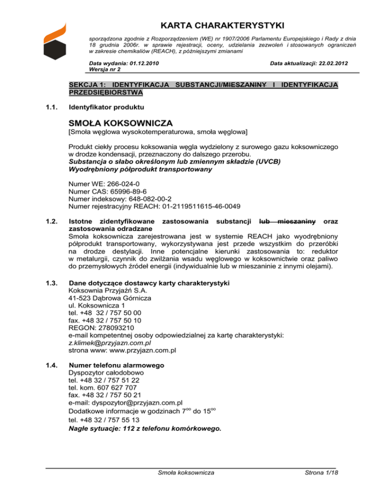 karta charakterystyki smoła koksownicza