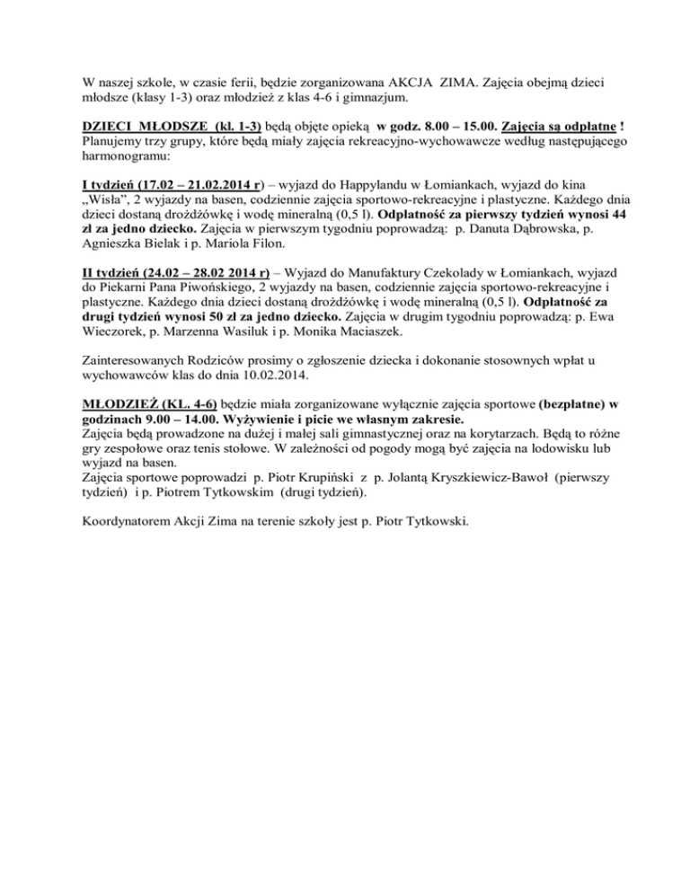W naszej szkole, w czasie ferii, będzie zorganizowana AKCJA ZIMA. Zajęcia obejmą dzieci młodsze (klasy 1-3) oraz młodzież z klas 4-6 i gimnazjum. DZIECI MŁODSZE (kl. 1-3) będą objęte opieką w godz. 8.00 – 15.00. Zajęcia są odpłatne ! Planujemy trzy grupy, które będą miały zajęcia rekreacyjno-wychowawcze według następującego harmonogramu: I tydzień (17.02 – 21.02.2014 r) – wyjazd do Happylandu w Łomiankach, wyjazd do kina „Wisła”, 2 wyjazdy na basen, codziennie zajęcia sportowo-rekreacyjne i plastyczne. Każdego dnia dzieci dostaną drożdżówkę i wodę mineralną (0,5 l). Odpłatność za pierwszy tydzień wynosi 44 zł za jedno dziecko. Zajęcia w pierwszym tygodniu poprowadzą: p. Danuta Dąbrowska, p. Agnieszka Bielak i p. Mariola Filon. II tydzień (24.02 – 28.02 2014 r) – Wyjazd do Manufaktury Czekolady w Łomiankach, wyjazd do Piekarni Pana Piwońskiego, 2 wyjazdy na basen, codziennie zajęcia sportowo-rekreacyjne i plastyczne. Każdego dnia dzieci dostaną drożdżówkę i wodę mineralną (0,5 l). Odpłatność za drugi tydzień wynosi 50 zł za jedno dziecko. Zajęcia w drugim tygodniu poprowadzą: p. Ewa Wieczorek, p. Marzenna Wasiluk i p. Monika Maciaszek. Zainteresowanych Rodziców prosimy o zgłoszenie dziecka i dokonanie stosownych wpłat u wychowawców klas do dnia 10.02.2014. MŁODZIEŻ (KL. 4-6) będzie miała zorganizowane wyłącznie zajęcia sportowe (bezpłatne) w godzinach 9.00 – 14.00. Wyżywienie i picie we własnym zakresie. Zajęcia będą prowadzone na dużej i małej sali gimnastycznej oraz na korytarzach. Będą to różne gry zespołowe oraz tenis stołowe. W zależności od pogody mogą być zajęcia na lodowisku lub wyjazd na basen. Zajęcia sportowe poprowadzi p. Piotr Krupiński z p. Jolantą Kryszkiewicz-Bawoł (pierwszy tydzień) i p. Piotrem Tytkowskim (drugi tydzień). Koordynatorem Akcji Zima na terenie szkoły jest p. Piotr Tytkowski.