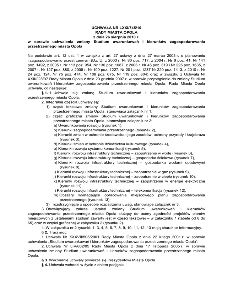 UCHWAŁA NR LXXI/745/10 RADY MIASTA OPOLA z dnia 26 sierpnia 2010 r. w sprawie uchwalenia zmiany Studium uwarunkowań i kierunków zagospodarowania przestrzennego miasta Opola Na podstawie art. 12 ust. 1 w związku z art. 27 ustawy z dnia 27 marca 2003 r. o planowaniu i zagospodarowaniu przestrzennym (Dz. U. z 2003 r. Nr 80 poz. 717, z 2004 r. Nr 6 poz. 41, Nr 141 poz. 1492, z 2005 r. Nr 113 poz. 954, Nr 130 poz. 1087, z 2006 r. Nr 45 poz. 319 i Nr 225 poz. 1635, z 2007 r. Nr 127 poz. 880, z 2008 r. Nr 199 poz. 1227, Nr 201 poz. 1237 Nr 220 poz. 1413, z 2010 r. Nr 24 poz. 124, Nr 75 poz. 474, Nr 106 poz. 675, Nr 119 poz. 804) oraz w związku z Uchwałą Nr XXII/223/07 Rady Miasta Opola z dnia 20 grudnia 2007 r. w sprawie przystąpienia do zmiany Studium uwarunkowań i kierunków zagospodarowania przestrzennego miasta Opola, Rada Miasta Opola uchwala, co następuje: § 1. 1. Uchwala się zmianę Studium uwarunkowań i kierunków zagospodarowania przestrzennego miasta Opola. 2. Integralną częścią uchwały są: 1) część tekstowa zmiany Studium uwarunkowań i kierunków zagospodarowania przestrzennego miasta Opola, stanowiąca załącznik nr 1; 2) część graficzna zmiany Studium uwarunkowań i kierunków zagospodarowania przestrzennego miasta Opola, stanowiąca załącznik nr 2: a) Uwarunkowania rozwoju (rysunek 1), b) Kierunki zagospodarowania przestrzennego (rysunek 2), c) Kierunki zmian w ochronie środowiska i jego zasobów, ochrony przyrody i krajobrazu (rysunek 3), d) Kierunki zmian w ochronie dziedzictwa kulturowego (rysunek 4), e) Kierunki rozwoju systemu komunikacji (rysunek 5), f) Kierunki rozwoju infrastruktury technicznej – zaopatrzenie w wodę (rysunek 6), g) Kierunki rozwoju infrastruktury technicznej – gospodarka ściekowa (rysunek 7), h) Kierunki rozwoju infrastruktury technicznej – gospodarka wodami opadowymi (rysunek 8), i) Kierunki rozwoju infrastruktury technicznej – zaopatrzenie w gaz (rysunek 9), j) Kierunki rozwoju infrastruktury technicznej – zaopatrzenie w ciepło (rysunek 10), k) Kierunki rozwoju infrastruktury technicznej – zaopatrzenie w energię elektryczną (rysunek 11), l) Kierunki rozwoju infrastruktury technicznej – telekomunikacja (rysunek 12), m) Obszary wymagające opracowania miejscowego planu zagospodarowania przestrzennego (rysunek 13); 3) rozstrzygnięcie o sposobie rozpatrzenia uwag, stanowiące załącznik nr 3. 3. Obowiązujący zakres ustaleń zmiany Studium uwarunkowań i kierunków zagospodarowania przestrzennego miasta Opola służący do oceny zgodności projektów planów miejscowych z ustaleniami studium zawarty jest w części tekstowej – w załączniku 1 (tabele od 8 do 65) oraz w części graficznej w załączniku 2 (rysunku 2). 4. W załączniku nr 2 rysunki: 1, 3, 4, 5, 6, 7, 8, 9, 10, 11, 12, 13 mają charakter informacyjny. § 2. Traci moc: 1. Uchwała Nr XXXVII/505/2001 Rady Miasta Opola z dnia 22 lutego 2001 r. w sprawie uchwalenia „Studium uwarunkowań i kierunków zagospodarowania przestrzennego miasta Opola”. 2. Uchwała Nr LIV/602/05 Rady Miasta Opola z dnia 17 listopada 2005 r. w sprawie uchwalenia zmiany Studium uwarunkowań i kierunków zagospodarowania przestrzennego miasta Opola. § 3. Wykonanie uchwały powierza się Prezydentowi Miasta Opola. § 4. Uchwała wchodzi w życie z dniem podjęcia. (Patrz: nr XXV/384/12 z 26.04.2012 r.)