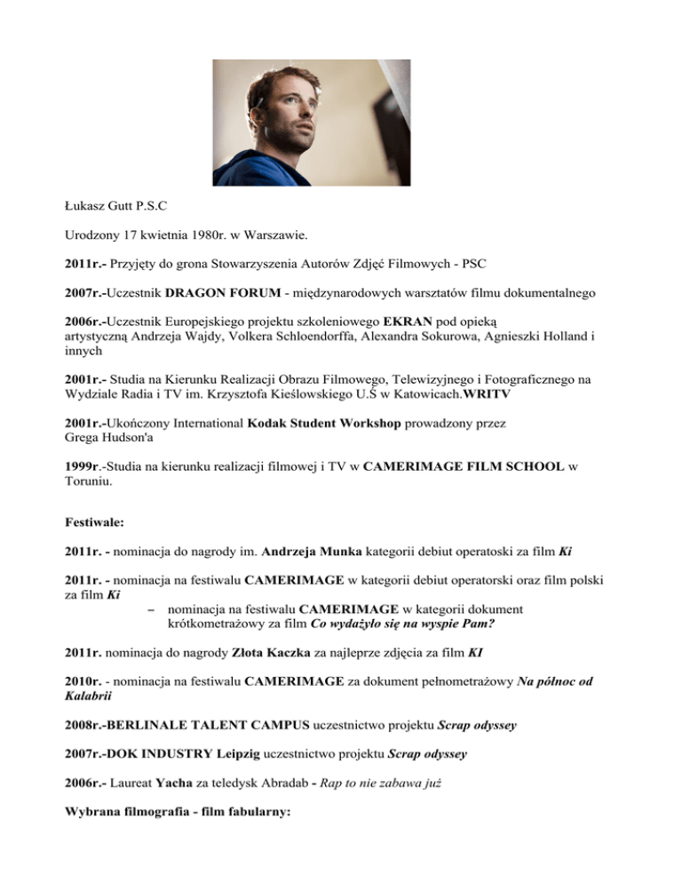 Łukasz Gutt P.S.C Urodzony 17 kwietnia 1980r. w Warszawie. 2011r.- Przyjęty do grona Stowarzyszenia Autorów Zdjęć Filmowych - PSC 2007r.-Uczestnik DRAGON FORUM - międzynarodowych warsztatów filmu dokumentalnego 2006r.-Uczestnik Europejskiego projektu szkoleniowego EKRAN pod opieką artystyczną Andrzeja Wajdy, Volkera Schloendorffa, Alexandra Sokurowa, Agnieszki Holland i innych 2001r.- Studia na Kierunku Realizacji Obrazu Filmowego, Telewizyjnego i Fotograficznego na Wydziale Radia i TV im. Krzysztofa Kieślowskiego U.Ś w Katowicach.WRITV 2001r.-Ukończony International Kodak Student Workshop prowadzony przez Grega Hudson'a 1999r.-Studia na kierunku realizacji filmowej i TV w CAMERIMAGE FILM SCHOOL w Toruniu. Festiwale: 2011r. - nominacja do nagrody im. Andrzeja Munka kategorii debiut operatoski za film Ki 2011r. - nominacja na festiwalu CAMERIMAGE w kategorii debiut operatorski oraz film polski za film Ki − nominacja na festiwalu CAMERIMAGE w kategorii dokument krótkometrażowy za film Co wydażyło się na wyspie Pam? 2011r. nominacja do nagrody Złota Kaczka za najleprze zdjęcia za film KI 2010r. - nominacja na festiwalu CAMERIMAGE za dokument pełnometrażowy Na północ od Kalabrii 2008r.-BERLINALE TALENT CAMPUS uczestnictwo projektu Scrap odyssey 2007r.-DOK INDUSTRY Leipzig uczestnictwo projektu Scrap odyssey 2006r.- Laureat Yacha za teledysk Abradab - Rap to nie zabawa już Wybrana filmografia - film fabularny: 2012r. Performer autor zdjęć reż. M. Sobieszczański, Łukasz Ronduda – Studio Wajdy 2011r. W ukryciu autor zdjęć reż. Jan Kidawa-Błoński – Wfdif 2010r. Ki autor zdjęć, reż. Leszek Dawid - Skorpion Arte 2009r. Hel operator II kamery, reż. Kinga Dębska, Kalejdoskop 2008r. Przeznaczenie sierial TV, autor zdjęć, reż. Mariusz Palej, Polsat 2007r. Pogoda na piątek serial TV ,II seria, autor zdjęć, reż. M. Palej, TVP Wybrana filmografia - film dokumentalny: 2010r. Odyseja Złomowa autor zdjęć, reżyseria, Kalejdoskop/TVP1 2010r. Co się wydarzyło na wyspie Pam? autor zdjęć reż. Eliza Kubarska,TVP 2009r. Na północ od Kalabrii autor zdjęć, reż. Marcin Sauter, Studio Munka 2008r. 6 Oktaw autor zdjęć, reż. Kinga Dębska, TVP 2008r. Najbardziej lubie grać autor zdjęć, reż. Kinga Dębska TVP Twórca videoklipów: Abradab, Kult, Kasia Cerekwicka, HappySad, Pono Wystawy: 2009r. Kunsthalle Basel, Szwajcaria – Report of Probability 2009r. Fundacja Galerii Foksal, Polska - Minstrel Show W internecie: http://www.filmpolski.pl/fp/index.php/1152010 http://www.filmweb.pl/person/Łukasz+Gutt-464713 http://www.stopklatka.pl/filmowcy/osoba.asp?oi=123599