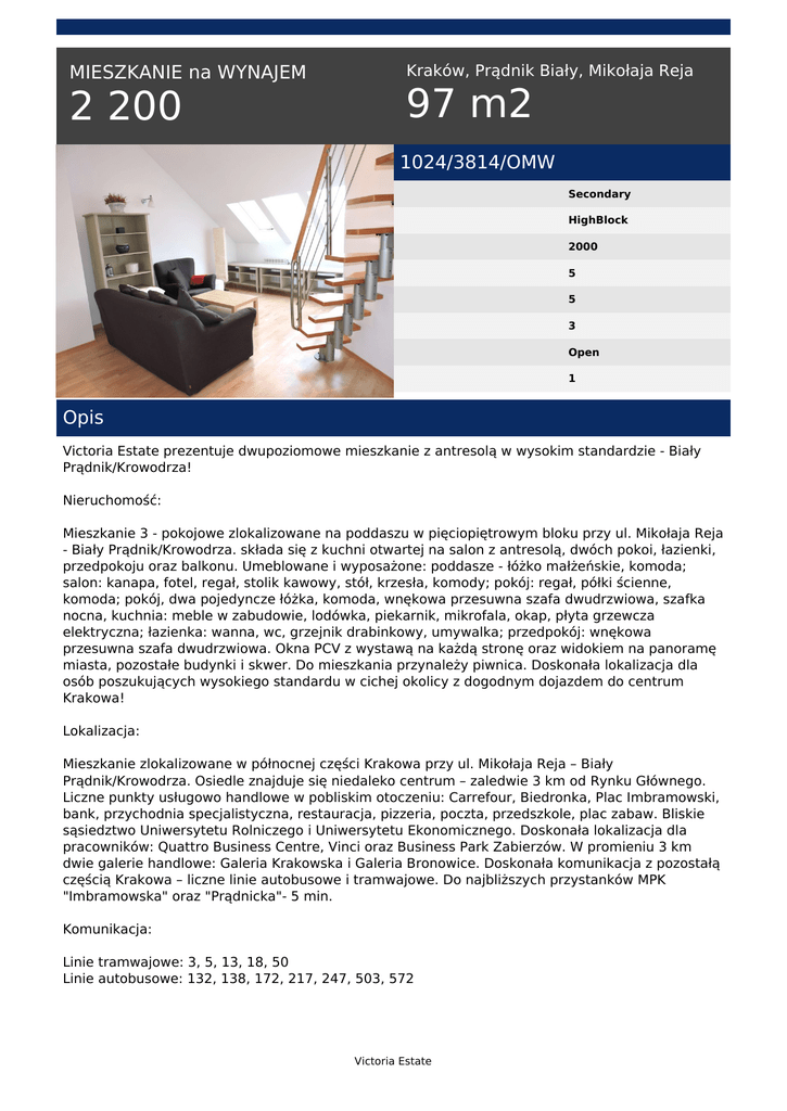 MIESZKANIE na WYNAJEM 2 200 Kraków, Prądnik Biały, Mikołaja Reja 97 m2 1024/3814/OMW Secondary HighBlock 2000 5 5 3 Open 1 Opis Victoria Estate prezentuje dwupoziomowe mieszkanie z antresolą w wysokim standardzie - Biały Prądnik/Krowodrza! Nieruchomość: Mieszkanie 3 - pokojowe zlokalizowane na poddaszu w pięciopiętrowym bloku przy ul. Mikołaja Reja - Biały Prądnik/Krowodrza. składa się z kuchni otwartej na salon z antresolą, dwóch pokoi, łazienki, przedpokoju oraz balkonu. Umeblowane i wyposażone: poddasze - łóżko małżeńskie, komoda; salon: kanapa, fotel, regał, stolik kawowy, stół, krzesła, komody; pokój: regał, półki ścienne, komoda; pokój, dwa pojedyncze łóżka, komoda, wnękowa przesuwna szafa dwudrzwiowa, szafka nocna, kuchnia: meble w zabudowie, lodówka, piekarnik, mikrofala, okap, płyta grzewcza elektryczna; łazienka: wanna, wc, grzejnik drabinkowy, umywalka; przedpokój: wnękowa przesuwna szafa dwudrzwiowa. Okna PCV z wystawą na każdą stronę oraz widokiem na panoramę miasta, pozostałe budynki i skwer. Do mieszkania przynależy piwnica. Doskonała lokalizacja dla osób poszukujących wysokiego standardu w cichej okolicy z dogodnym dojazdem do centrum Krakowa! Lokalizacja: Mieszkanie zlokalizowane w północnej części Krakowa przy ul. Mikołaja Reja – Biały Prądnik/Krowodrza. Osiedle znajduje się niedaleko centrum – zaledwie 3 km od Rynku Głównego. Liczne punkty usługowo handlowe w pobliskim otoczeniu: Carrefour, Biedronka, Plac Imbramowski, bank, przychodnia specjalistyczna, restauracja, pizzeria, poczta, przedszkole, plac zabaw. Bliskie sąsiedztwo Uniwersytetu Rolniczego i Uniwersytetu Ekonomicznego. Doskonała lokalizacja dla pracowników: Quattro Business Centre, Vinci oraz Business Park Zabierzów. W promieniu 3 km dwie galerie handlowe: Galeria Krakowska i Galeria Bronowice. Doskonała komunikacja z pozostałą częścią Krakowa – liczne linie autobusowe i tramwajowe. Do najbliższych przystanków MPK "Imbramowska" oraz "Prądnicka"- 5 min. Komunikacja: Linie tramwajowe: 3, 5, 13, 18, 50 Linie autobusowe: 132, 138, 172, 217, 247, 503, 572 Victoria Estate Opłaty: 2200 zł najem + ok. 500 zł czynsz administracyjny + prąd Paulina Zajdel tel. +48 789 453 049 email: [email protected] Victoria Estate Powered by TCPDF (www.tcpdf.org)