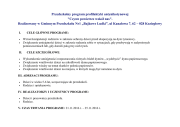 Przedszkolny program profilaktyki antynikotynowej "Czyste powietrze wokół nas". Realizowany w Gminnym Przedszkolu Nr1 „Bajkowe Ludki”, ul Kanałowa 7, 62 – 028 Koziegłowy I. II. CELE GŁÓWNE PROGRAMU: Wzrost kompetencji rodziców w zakresie ochrony dzieci przed ekspozycją na dym tytoniowy. Zwiększenie umiejętności dzieci w zakresie radzenia sobie w sytuacjach, gdy przebywają w zadymionych pomieszczeniach lub, gdy dorośli palą przy nich tytoń. CELE SZCZEGÓŁOWE: Wykształcenie umiejętności rozpoznawania różnych źródeł dymów, „wydobycie” dymu papierosowego. Zwiększenie wrażliwości dzieci na szkodliwość dymu papierosowego. Zwiększenie wiedzy na temat skutków palenia papierosów. Zwiększenie wrażliwości dzieci na miejsca, w których mogą być narażane na dym. III. ADRESACI PROGRAMU: Dzieci w wieku 5-6 lat, uczęszczające do przedszkoli. Rodzice i opiekunowie. IV. REALIZATORZY I UCZESTNICY PROGRAMU: Dzieci i pracownicy przedszkola. Rodzice. V. CZAS TRWANIA PROGRAMU: 21.11.2016 r. – 25.11.2016 r. VI. ORGANIZATORZY PROGRAMU: Główny Inspektorat Sanitarny Państwowa Inspekcja Sanitarna – WSSE (16) i PSSE (318) VII. KOORDYNATORZY PROGRAMU: Poziom krajowy – GIS Poziom wojewódzki – WSSE Poziom lokalny – PSSE Poziom przedszkolny – wytypowani koordynatorzy w przedszkolach. VIII. PARTNERZY PROGRAMU: Na poziomie krajowym: Ministerstwo Edukacji Narodowej, Stowarzyszenie na Rzecz Dzieciństwa Wolnego od Tytoniu. IX. METODYKA REALIZACJI PROGRAMU: Program składał się z sześciu zajęć warsztatowych Tytuły zajęć: 1. 2. 3. 4. 5. 6. Wycieczka Co i dlaczego dymi? Jak się czuję, kiedy dymi papieros? Co się dzieje, gdy ludzie palą papierosy? Jak unikać dymu tytoniowego? Warsztaty plastyczne z rodzicami: „Czyste powietrze wokół nas” – termin 30.11.2016 r. Podsumowanie programu: „Czyste Powietrze Wokół Nas”: W programie uczestniczyły 3 grupy wiekowe 5, 6 latki – grupa: Krasnala Hałabały Zająca Poziomki Wróbelka Elemelka” Wychowawczynie: Lidia Bartkowiak, Sylwia Cieślak, Teresa Kaczmarek, Aleksandra Wojciechowska Koordynator programu – Danuta Kotecka Rodziców zapoznano z założeniami programu: - w trakcie rozmów indywidualnych, - w formie ulotek informacyjnych, - informacji zamieszczonej na tablicy w holu przedszkola, - poprzez stronę internetową przedszkola. Wszystko zaczęło się od wprowadzenia tematu: „Czyste Powietrze Wokół Nas”. Na początku powstała gazetka informująca rodziców o realizacji programu. Podeszliśmy do sprawy bardzo poważnie! Przeprowadziliśmy krótką rozmowę Pierwszym krokiem do zbadania sytuacji była wycieczka po najbliższej okolicy w celu zlokalizowania źródeł dymu. Poszliśmy do szatni I ubraliśmy się ciepło - w końcu to już listopad! Przed budynkiem przedszkolnym przypomnieliśmy sobie o zasadach bezpiecznego poruszania się po chodnikach i ulicach! No i ruszyliśmy… Pierwszym dymem, jaki ujrzeliśmy zaraz po wyjściu z przedszkola był dym z lecącego nad naszymi głowami samolotu. Szukamy dalej … Znaleźliśmy kolejne źródło dymu. Miejsce - gdzie jest dużo zaparkowanych samochodów…. Dalej wypatrzyliśmy unoszący się dym z komina Elektrociepłowni na Karolinie oraz dym z kominów domków jednorodzinnych. Postanowiliśmy udać się na rondo w Koziegłowach. Już z daleka zauważyliśmy kolejny, wysoki komin, z unoszącym się dymem. Pora wracać do przedszkola na drugie śniadanie. Wszyscy byliśmy bardzo głodni. Nabraliśmy sił. Uporządkowaliśmy wiadomości i dalej ruszyliśmy do pracy… Po śniadaniu postanowiliśmy wykonać z papieru bohatera naszego programu – Dinusia Sympatyczny Dinek pomoże nam zapoznać się z różnymi rodzajami dymu, porozmawia o szkodliwości dymu papierosowego oraz powie nam jak go unikać. Nie zabraknie też wesołej twórczości, czyli malowania i kolorowania. Wszyscy nauczymy się także piosenki o Dinusiu. ZACZYNAMY! Wykonane Dinusie zanieśliśmy do szatni. Będą nam przypominać o tym, czym będziemy zajmować się w tym tygodniu. Po śniadaniu wszyscy spotkaliśmy się w grupie „Wróbelka Elemelka”. W trakcie spotkania podzieliliśmy się wrażeniami z wycieczki. Zastanawialiśmy się nad tym, jak się czujemy, gdy mamy zatkany nos i nie możemy oddychać. Wysłuchaliśmy opowiadania opartego na historyjce obrazkowej pt: „Krzyś” i dowiedzieliśmy się, jak czuł się chłopiec, którego tato palił w domu. Oglądaliśmy obrazki i porównywaliśmy wygląd płuc osoby palącej i niepalącej. Pod koniec spotkania wzięliśmy udział w zabawach ruchowych oddechowych w celu usprawnienia aparatu oddechowego i zwiększenia pojemności płuc. I tak minął nam pierwszy dzień z Dinusiem. Naprawdę był pracowity!!! Następny zaczął się równie ciekawie. Dzieci z grupy Krasnala, Zająca i Wróbelka obejrzały prezentację multimedialną Po prezentacji przeprowadziliśmy krótką dyskusje w celu uporządkowania wiedzy. … zaśpiewaliśmy piosenkę o Dinusiu, której wcześniej uczyliśmy się w swoich grupach. Następnie przystąpiliśmy do dalszej pracy. Z domu przynieśliśmy zdjęcia, fotografie, rysunki, dotyczące zdrowego i zanieczyszczonego powietrza. W tym pomogli nam nasi rodzice, którzy tak samo jak my zaangażowali się w program. I tak powstały nasze plakaty, które później znalazły swoje miejsce w szatni. Dni upływały nam na kolejnych zabawach i zajęciach poświęconych programowi. Tego dnia postanowiliśmy pokolorować kwiaty, które później wykorzystaliśmy w zabawach ruchowych. Innego dnia ubraliśmy się na zielono – upodabniając się do Dinusia. … próbowaliśmy swoich sił w nadmuchiwaniu powietrza. …łapaliśmy bańki mydlane …braliśmy udział w doświadczeniach …uczestniczyliśmy w zabawach ruchowych Do grupy Krasnala zostaliśmy wszyscy zaproszeni na przedstawienie kukiełkowe pt: „Komin”. …braliśmy udział w doświadczeniach. Dowiedzieliśmy się o tym, jak