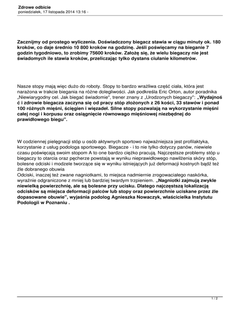 Zdrowe odbicie poniedziałek, 17 listopada 2014 13:16 - Zacznijmy od prostego wyliczenia. Doświadczony biegacz stawia w ciągu minuty ok. 180 kroków, co daje średnio 10 800 kroków na godzinę. Jeśli poświęcamy na bieganie 7 godzin tygodniowo, to zrobimy 75600 kroków. Założę się, że wielu biegaczy nie jest świadomych ile stawia kroków, przeliczając tylko dystans ciułanie kilometrów. Nasze stopy mają więc dużo do roboty. Stopy to bardzo wrażliwa część ciała, która jest narażona w trakcie biegania na różne dolegliwości. Jak podkreśla Eric Orton, autor poradnika „Niewiarygodny cel. Jak biegać świadomie", trener znany z „Urodzonych biegaczy": „Wydajnoś ć i zdrowie biegacza zaczyna się od pracy stóp złożonych z 26 kości, 33 stawów i ponad 100 różnych mięśni, ścięgien i więzadeł. Silne stopy pozwalają na wykorzystanie mięśni całej nogi i korpusu oraz osiągnięcie równowago mięśniowej niezbędnej do prawidłowego biegu". W codziennej pielęgnacji stóp u osób aktywnych sportowo najważniejsza jest profilaktyka, korzystanie z usług podologa sportowego. Biegacze - i to nie tylko dotyczy panów, niewiele czasu poświęcają swoim stopom A to one bardzo ciężko pracują. Najczęstsze problemy stóp u biegaczy to otarcia oraz pęcherze powstają w wyniku nieprawidłowego nawilżenia skóry stóp, bolesne odciski i modzele tworzące się w wyniku istniejących już deformacji kostnych bądź też źle dobranego obuwia Odciski, inaczej też zwane nagniotkami, to miejsca nadmiernie zrogowaciałego naskórka, wyraźnie odgraniczone z mniej lub bardziej twardym trzpieniem. „Nagniotki zajmują zwykle niewielką powierzchnię, ale są bolesne przy ucisku. Dlatego najczęstszą lokalizacją odcisków są miejsca deformacji palców lub stopy oraz powierzchnie uciskane przez źle dopasowane obuwie", wyjaśnia podolog Agnieszka Nowaczyk, właścicielka Instytutu Podologii w Poznaniu . 1/2 Zdrowe odbicie poniedziałek, 17 listopada 2014 13:16 - „Bolące „Dynasplint". przyczynia narzekają zapalny, odciski krwiaki, też się Do na do nieleczone tych schodzenie problemy rozwoju problemów bakterii zwpływają paznokciami płytki musimy oraz paznokciowej. naistniejących powstawaniu technikę jeszcze - nie wrastanie biegu" dorzucić grzybicy paznokci -Na przestrzega częstą międzypalcowej. i oraz towarzyszący nadmierną dr. Maciej potliwość, temu Sportowcy Nowak stan z osób „Wnadmierną specjalistycznych powinniśmy zkremy namnażaniu biegu odcisków podologa powinny specjalne mety. przypadku wchłaniały i pianki, wchłaniać w plastry, strefy miejsca obciąć się potliwością nadmiernych które wentylacyjne. bakterii. wilgoć. używać narzędzi", wilgoć, paznokcie najbardziej nawilżają używać W Przed profilowanych stabilizować przypadku zrogowaceń radzi na Powinniśmy skórę biegiem narażone środki prosto, Agnieszka stóp regulujące stopę zastosować wkładek. zaleca aw należy zawsze celu Nowaczyk. wpółokrągło się środku uniknięcia przykleić Trzeba nadpotliwość urazów pamiętać ich preparaty fizjologiczne buta, biegać i indywidualnie skóry stosować otarć tydzień jaka posiadać na bądź w i bazie liczba powstania „dobrych" usunięcie przed odpowiednio zapobiegające po płaskie talku, kroków wykonane usunięciu startem pęcherzy. skarpetkach, aby za szwy dzieli pomocą dobrane podczas paznokcie przez bolesnych oraz nas Uktóra od które fot. Przemek Piotr Dymus Walewski 2/2