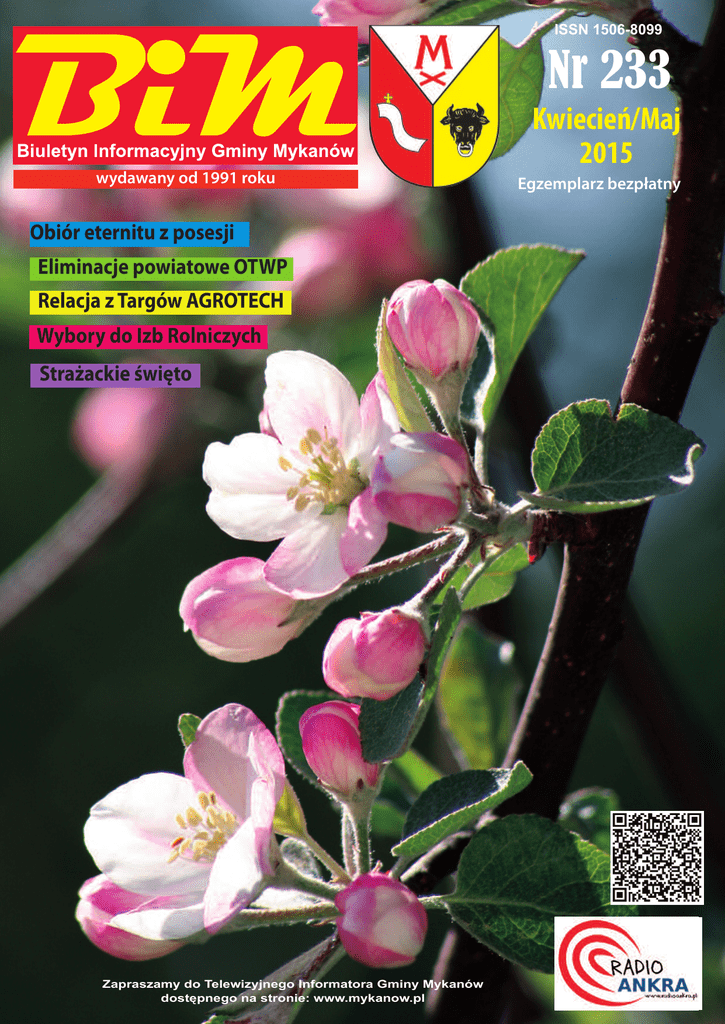 ISSN 1506-8099 Nr 233 Kwiecień/Maj 2015 wydawany od 1991 roku Obiór eternitu z posesji Eliminacje powiatowe OTWP Relacja z Targów AGROTECH Wybory do Izb Rolniczych Strażackie święto Zapraszamy do Telewizyjnego Informatora Gminy Mykanów dostępnego na stronie: www.mykanow.pl Egzemplarz bezpłatny str. 20 str. 19 str. 10-12 Uszykuje kanapkę do szkoły na drogę, Zanim zrobi obiad zakupy przyniesie, Pogłaszcze po głowie kiedy jesteś w stresie, Poda Ci też obiad dekorując stół, Posprząta, pozmywa, pracując jak wół, Pozwoli odpocząć, w nauce pomoże, Sam zrobi kolację gdy biegasz po dworze I kiedy założę piżamę prasowaną To wiem,że już mi szykuje ubranie na rano. Mój Kochany Robot Robot najnowsza wersja : Kiedy śpisz pracuje i nie odpoczywa, Śniadanie sam zrobi,naczynia pozmywa, A potem odkurzy, pościera podłogę, BiM Biuletyn Informacyjny Gminy Mykanów Miesięcznik Samorządowy ISSN 1506-8099 nr 233 KWIECIEŃ/MAJ 2015 roku Siedziba redakcji: Gminny Ośrodek Kultury w Mykanowie 42-233 Mykanów ul. Samorządowa 1A tel. 34 374 00 42, fax: 034 328 80 37 e-mail: [email protected] www.gokmykanow.pl Wydawca: Rada Gminy Mykanów I tak sobie myślę moja droga mamo, Że dziś też się robi wszystko jakoś samo Choć wiem, że możesz dużo, jest trochę inaczej Bo trzeba zarabiać i chodzisz do pracy. Ja nie mam robota, lecz mam znacznie więcej Mam Twój uśmiech serdeczny i gorące serce. I kiedy się budzę wiem z samego rana Ze to dla mnie jesteś....... mamusiu kochana. Zbigniew Kubat W numerze m.in.: Konferencja „EFEKTywny Leader“ . . . . . . . . . . . . . . . . .s. 4 Rozmowa z Radnym panem Marcinem Jędrasiakiem . . .s. 5 Wybory do Izb Rolniczych . . . . . . . . . . . . . . . . . . . . . . . . .s. 5 Sołtys - wyjątkowy urzędnik . . . . . . . . . . . . . . . . . . . . . .s. 6-8 Międzynarodowe Targi „AGROTECH“ . . . . . . . . . . . . .s. 8-9 Odbiór eternitu z posesji . . . . . . . . . . . . . . . . . . . . . . . . . .s.11 Przywitanie wiosny . . . . . . . . . . . . . . . . . . . . . . . . . . . .s.10-12 „COLUMBUS“ w Lubojnie . . . . . . . . . . . . . . . . . . . . . . .s. 14 Nowe boisko w Radostkowie . . . . . . . . . . . . . . . . . . . . . .s. 16 Turniej Wiedzy Pożarniczej . . . . . . . . . . . . . . . . . . . . . . .s. 18 Dzień Strażaka w Grabowej . . . . . . . . . . . . . . . . . . . . . . .s. 19 Rajdy rowerowe . . . . . . . . . . . . . . . . . . . . . . . . . . . . . . . . .s.22 Sportowe doniesienia . . . . . . . . . . . . . . . . . . . . . . . . . .s. 25-26 Cennik ogłoszeń i rozmiary modułów reklamowych odpowiednio na stronach: Redaktor naczelny: Adriana Moroń Społeczne Kolegium Redakcyjne Sylwia Kwiecień, Urszula Wróbel, Szymon Migoń, Konrad Kokoszka, Ewa i Jarosław Polczykowie, Edyta Bauć, Adam Wochal, Artur Wasil, Zbigniew Kubat, Krzysztof Polewski CZARNO-BIAŁE - wielkość modułu: 58 x 87 mm (pion) 15 zł 87 x 58 mm (poziom) 15 zł wielokrotność x 2 30 zł Opracowanie graficzne okładki: Ewa Polczyk wielokrotność x 3 45 zł Skład: Ewa i Jarosław Polczykowie 1/2 strony 60 zł Nakład: 1000 sztuk pełna strona Materiały informacyjne do kolejnego wydania należy dostarczać do 25 dnia danego miesiąca. KOLOR 3 i 4 strona- wielkość modułu: Redakcja zastrzega sobie prawo dokonywania zmian i skracania dostarczonych materiałów oraz nadesłanej korespondencji. Za treść ogłoszeń i reklam redakcja i wydawca nie odpowiadają. 2015 kwiecień/maj 120 zł 102 x 145 mm (1/4 strony) 60 zł 210 x 145 mm (1/2 strony) 120 zł 210 x 290 mm (pełna strona) 240 zł 3 „EFEKTywny LEADER“ sukcesy naszej Gminy Oprac. Anna Pruciak 24 kwietnia 2015r. o godzinie 16:00 do Teatru im. Adama Mickiewicza w Częstochowie tłumnie zaczęli napływać goście zaproszeni na konferencję pt.: „EFEKTywny LEADER”. W towarzystwie członków Stowarzyszenia „Razem na wyżyny”, przyjaciół oraz przede wszystkim wnioskodawców, dokonano podsumowania działalności Stowarzyszenia „Razem na wyżyny” i wdrażania Lokalnej Strategii Działania w latach 2009-2015. Wszyscy zaproszeni zasiedli w sali teatru i przenieśli się w świat inwestycji dokonanych dzięki środkom unijnym na terenie gmin, gdzie działa stowarzyszenie „Razem na wyżyny”. Po uroczystym powitaniu gości uczestnikom konferencji dane było obejrzeć dwa filmy: jeden krótki, pokazujący jak dzięki unijnemu wsparciu finansowemu zmienia się nasze otoczenie, drugi dłuższy, prezentujący efekty pracy konkretnych ludzi, instytucji, organizacji i firm. Ale nie tylko filmy pokazały ogromną zmianę naszej małej ojczyzny. Pan Witold Magryś wystąpił z prezentacją, która przypomniała zgromadzonym jaki jest cel programu „Leader” i wszystkich lokalnych grup działania. Ukazał również perspektywę działań na lata 2014-2020. Kolejną prezentację przedstawił dr Piotr Nowak, socjolog Uniwersytetu Jagiellońskiego, który przedstawił wyniki badań ewaluacyjnych przeprowadzonych na terenie wszystkich sześciu gmin Stowarzyszenia. Przez wszystkie meandry unijnych działań zręcznie przeprowadzili nas prezes stowarzyszenia Jolanta Brzozowska – Ciura oraz Gracjan Respondek. Nie obyło się oczywiście bez uroczystego wręczenia statuetek laureatom konkursu „Projektomania”. Każdy mieszkaniec mógł oddać głos na, jego zdaniem, najlepszy projekt w głosowaniu internetowym. I tak, po wielu zmianach, ostatecznie jako najlepsze zdaniem internautów wyłonione zostały następujące projekty: 1. W kategorii „Odnowa i rozwój wsi”: • „Budowa i wyposażenie edukacyjnego Ogrodu Bajek w Dąbrowie Zielonej” zrealizowany przez Gminę Dąbrowa Zielona. 2. W kategorii „Rozwój działalności gospodarczej”: • „Wzrost konkurencyjności, przychodów, tworzenie miejsc pracy poprzez budowę obiektu turystycznego” zrealizowany przez Mirosława Ślęzaka 4 3. W kategorii „Małe projekty” o charakterze inwestycyjnym: • „Doposażenie studia nagra