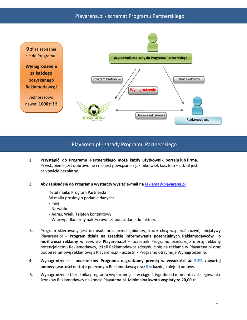 Playarena.pl - schemat Programu Partnerskiego 0 zł za zapisanie się do Programu! Wynagrodzenie za każdego pozyskanego Reklamodawcę! Użytkownik zapisany do Programu Partnerskiego Program Partnerski Oferta reklamy Wynagrodzenie Jednorazowo nawet 1000zł !!! Umowa reklamowa Reklamodawca Playarena.pl - zasady Programu Partnerskiego 1. Przystąpid do Programu Partnerskiego może każdy użytkownik portalu lub firma. Przystąpienie jest dobrowolne i nie jest powiązane z jakimkolwiek kosztem – udział jest całkowicie bezpłatny. 2. Aby zapisad się do Programu wystarczy wysład e-mail na [email protected] Tytuł maila: Program Partnerski W mailu prosimy o podanie danych: - Imię - Nazwisko - Adres, Wiek, Telefon kontaktowy - W przypadku firmy należy również podad dane do faktury. 3. Program skierowany jest do osób oraz przedsiębiorstw, które chcą wspierad rozwój inicjatywy Playarena.pl – Program działa na zasadzie informowania potencjalnych Reklamodawców o możliwości reklamy w serwisie Playarena.pl – uczestnik Programu przekazuje ofertę reklamy potencjalnemu Reklamodawcy, jeżeli Reklamodawca zdecyduje się na reklamę w Playarena.pl oraz podpisze umowę reklamową z Playarena.pl - uczestnik Programu otrzymuje Wynagrodzenie. 4. Wynagrodzenie – uczestników Programu nagradzamy premią w wysokości aż 20% zawartej umowy (wartości netto) z poleconym Reklamodawcą oraz 5% każdej kolejnej umowy. 5. Wynagrodzenie Uczestnika programu wypłacane jest w ciągu 2 tygodni od momentu zaksięgowania środków Reklamodawcy na koncie Playarena.pl. Minimalna kwota wypłaty to 20,00 zł. 1 Program Partnerski - porady i przykłady Gdzie mogę przekazad ofertę? Szczególnym zainteresowaniem oferta może cieszyd się wśród: Sklepów sportowych, Siłowni, Hal sportowych, basenów i podobnych obiektów sportowych, Lokalnych firm zaangażowanych w rozwój sportu. Może masz znajomego, sąsiada, który prowadzi sklep/obiekt sportowy? Każda umowa podpisana z Twoim pośrednictwem to wynagrodzenie dla Ciebie oraz specjalna promocja dla reklamodawcy. To przede wszystkim od Was zależy gdzie trafi nasza oferta Więcej o zasadach Programu, kwestiach związanych z Programem – można uzyskad pod adresem: [email protected] Przykładowa tabela rozliczeo z członkiem Programu: Użytkownik Numer Partnera Jan Nowak 015 Reklamodawcy Wartośd umowy Wynagrodzenie Sport XY Sp. z o.o. 200 zł - Reklama 40 zł Hala Sportowa Sp. z o.o. 5 000 -Sponsor 1 000 zł Wynagrodzenie – Jan Kowalski: 1 040 zł 2 Playarena.pl – szczegółowy regulamin Programu Partnerskiego §1 Zasady Programu: 1. Rejestracja w programie – aby wziąd udział w Programie należy zarejestrowad się wysyłając e-mail zgłoszeniowy na : [email protected] – w tytule maila należy wpisad „Program Partnerski”, natomiast w mailu należy podad : imię, nazwisko, adres, wiek (w przypadku użytkownika serwisu), dane do faktury (w przypadku przedsiębiorstw), telefon kontaktowy. Udział w Programie jest bezpłatny. 2. Każde zgłoszenie będzie rozpatrzone w przeciągu 5 dni roboczych – w odpowiedzi każdy zgłaszający się do Programu otrzyma swój numer Partnera oraz oferty, którymi będzie mógł się posługiwad. 3. Przekazane oferty będą zawierały indywidualny numer Partnera. 4. Reklamodawca zgłaszający się do Playarena.pl ze zleceniem reklamowym podaje zamieszczony w ofercie numer Partnera. Na podstawie tego numeru wypłacane jest wynagrodzenie Partnerowi. 5. Wynagrodzenie dla Partnera wynosi 20% wartości netto pierwszej podpisanej umowy z Reklamodawcą oraz 5% wartości netto każdej kolejnej umowy. 6. W przypadku wynagrodzenia należnego z umowy dotyczącej Oferty Sponsorskiej turnieju „Playarena CUP” – wynagrodzenie Uczestnika programu wypłacone zostanie w ciągu 2 tygodni od dnia zakooczenia turnieju. Warunkiem wypłaty jest zaksięgowanie środków Sponsora/Reklamodawcy na rachunku Playarena.pl. 7. Wypłata wynagrodzenia – minimalna kwota wypłaty to 20 zł. Wypłata następuje na podstawie wystawionego rachunku (rachunek wystawiony przez Partnera na podstawie formularza nadesłanego przez Playarena.pl). 8. Playarena.pl ma prawo odmowy użytkownikowi uczestnictwa w Programie oraz wykluczenie Partnera z Programu. Uwagi/reklamacje – należy kierowad na [email protected] – wszystkie uwagi oraz reklamacje zostaną szczegółowo przeanalizowane – odpowiedzi zostaną przesłane do 5 dni roboczych. §2 Definicje PLAYARENA.PL – PLAYARENA.PL Wojciech Dudek z siedzibą we Wrocławiu, NIP: 576-148-53-21, REGON: 020714882, adres: ul. Prądzyoskiego 22/14, 50-434 Wrocław. Program Partnerski – współpraca pomiędzy użytkownikami serwisu lub przedsiębiorstwami dotycząca promowania oferty reklamy wśród potencjalnych Reklamodawców. Serwis PLAYARENA.PL - oznacza portal internetowy tj. zorganizowaną platformę społecznościową pod adresem www.PLAYARENA.PL umożliwiającą organizowanie darmowych rozgrywek ligowych w każdym mieście w Polsce. Usługa reklamowa - oznacza każdy przekaz zmierzający do promocji sprzedaży albo innych form korzystania z towarów lub usług, popierania określonych spraw lub idei, albo do osiągnięcia innego efektu pożądanego przez Zleceniodawcę. Usługi Reklamowe PLAYARENA.PL - Usługi reklamowe, świadczone przez PLAYARENA.PL na stronach Serwisu zgodnie z Regulaminem. Umowa - umowa Zlecenia Reklamowego na Usługi Reklamowe PLAYARENA.PL. Zleceniodawca - osoba fizyczna, osoba prawna lub podmiot nie mający osobowości prawnej, która zleca PLAYARENA.PL działania promocyjno-marketingowe. Partner – osoba (lub przedsiębiorstwo), która przystąpiła do Programu Partnerskiego Playarena.pl. Numer Partnera – numer identyfikacyjny Partnera przyznany w procesie rejestracji w Programie. Zlecenie Reklamowe – przyjmowane na drodze mailowej (mail kontaktowy: [email protected]), określające warunki Umowy Zlecenia Reklamowego, Zlecenie Reklamowe stanowi ofertę (art.